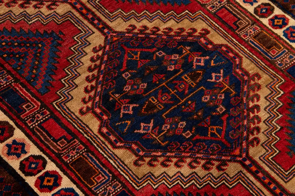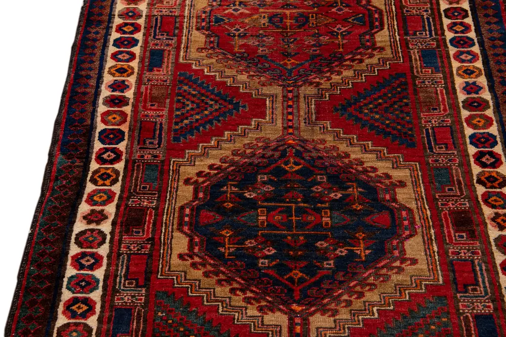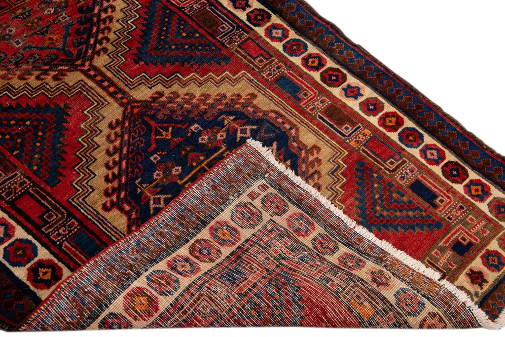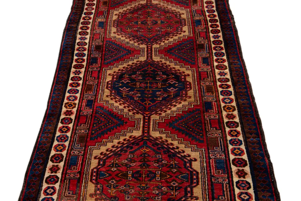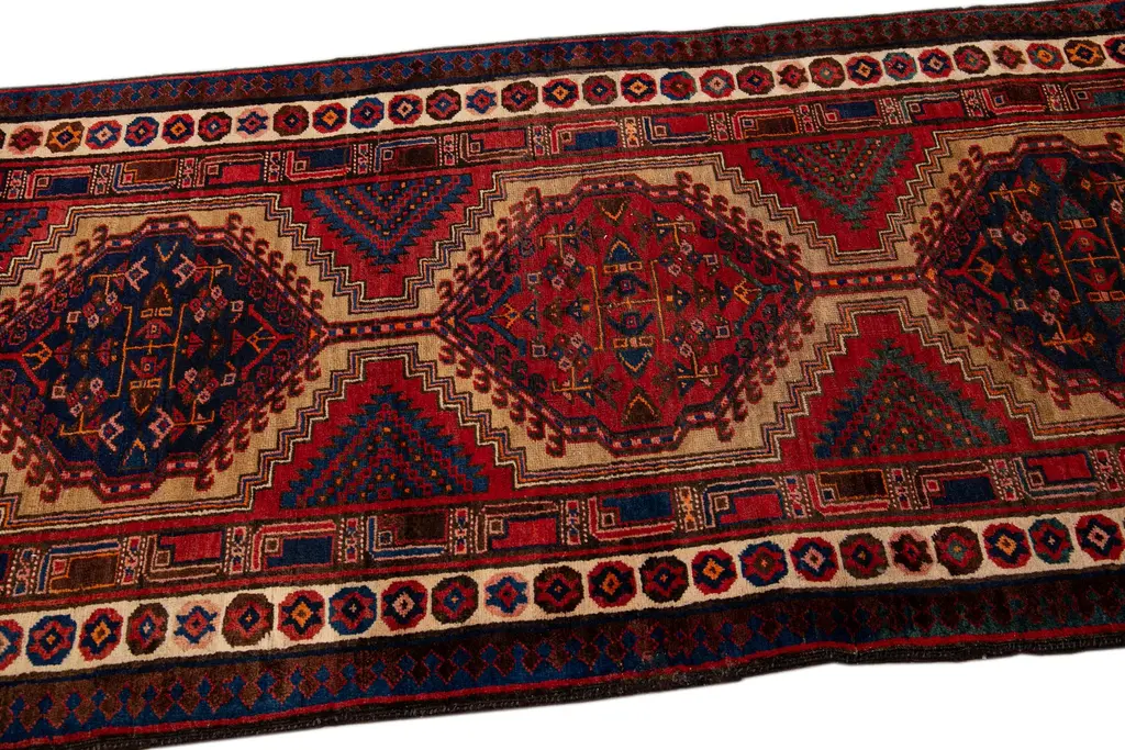 Beautiful Antique Heriz Handmade Wool rug with an all-over red field. This piece has multicolor accents in a gorgeous all-over geometric medallion design. This rug measures: 3'1" x 14'2".