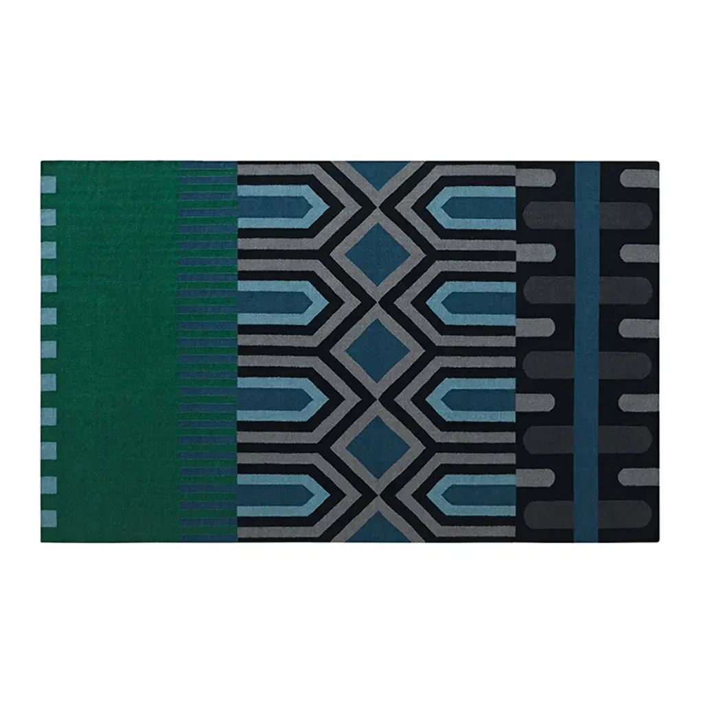 Reflections 3A is a rectangular wool rug.Zollanvari Fine Gabbehs.A subliminal and complex design by Gabi V. Lőrincz x Zollanvari, this runner has it all… colour, rhythm, perspective. The Hungarian artist/designer named this creation Reflection and how apt a name this is. The interplay between colours and the overall drawing is suggestive of the reflection of tree trunks on a pond. A distinctive addition for a chic corridor… The extensive use of geometrical and abstract patterns together with the vivid naturally dyed colours of Ghashgha’i weavings have analogies with the studies and learnings of the Bauhaus movement, in particular, with one of its key masters, Josef Albers. He studied in depth the interaction of colour and human perception. His paintings and artworks with squares reminded the designers of this collection of the geometries of Gabbeh carpets and the colour interaction between the single elements woven into them. In Albers’s universe, colour seduced, beguiled, swindled, and these characteristics made colour the most fascinating of art’s formal elements. This concept is at the very heart of this new collection. SoFar SoNear, Milan, designed this collection choosing iconic Ghashgha’i motifs that they simplified using squares and triangles. The lion, the peacock, woman and man are the motifs they drew upon merging the style of Gabbehs with the drawings of Albers.