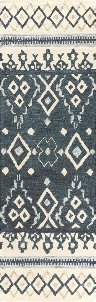 Collection: Opulent Colors: Gray, Navy, Blue Construction: Hand Tufted Material: Face: 100% Wool Pile: High Pile Pile Height: 0.6" Styles: Transitional Backing: Canvas Made In: India Price Range: $$$$$ (Affordable)