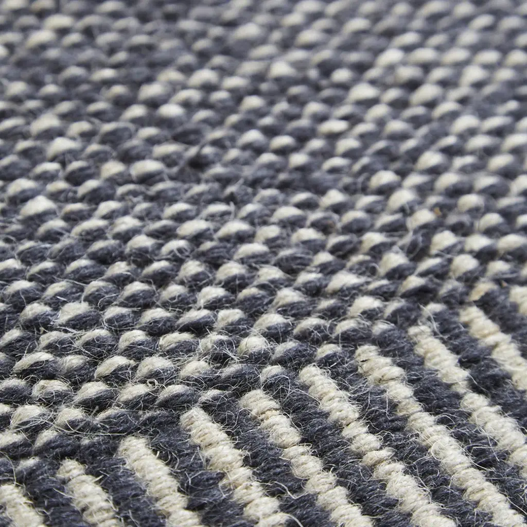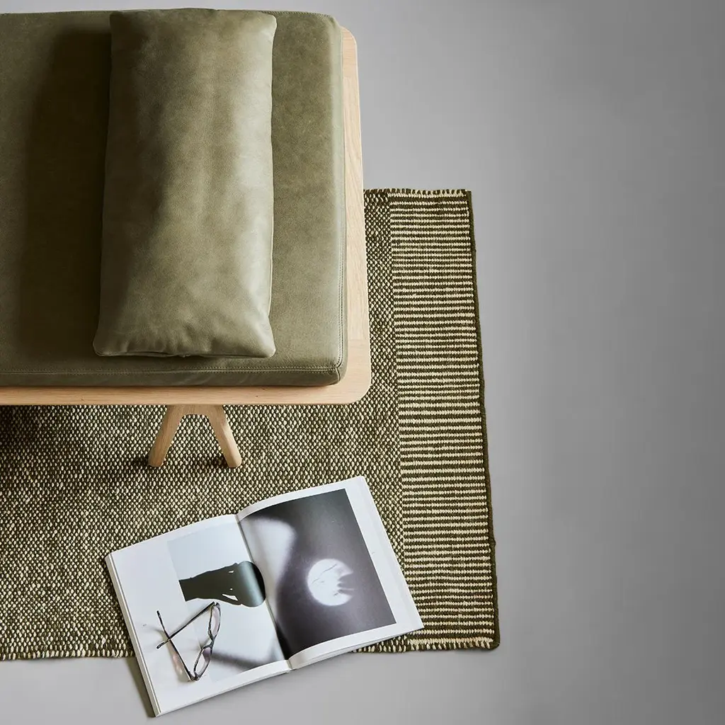 Rombo is a series of rugs designed by Studio MLR. Characterised by the materials used in the rugs. The combination of wool and jute creates a robust surface. The woven construction forms small, distinctive rhombi patterns, which the series is named after. At either end of the rug, straight lines encase the rug creating an elegant contrast between the colours and patterns. The series consists of a small, large and runner rug in each colour.