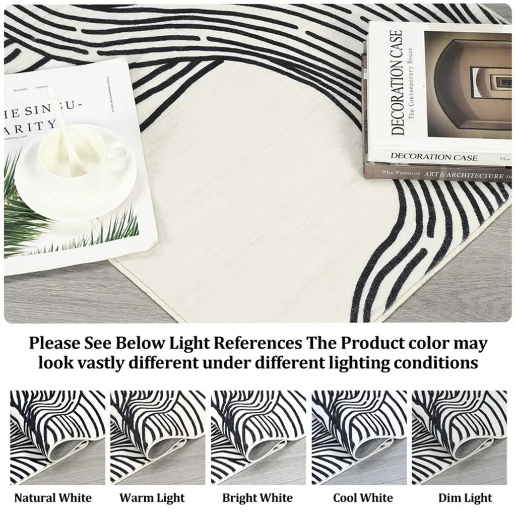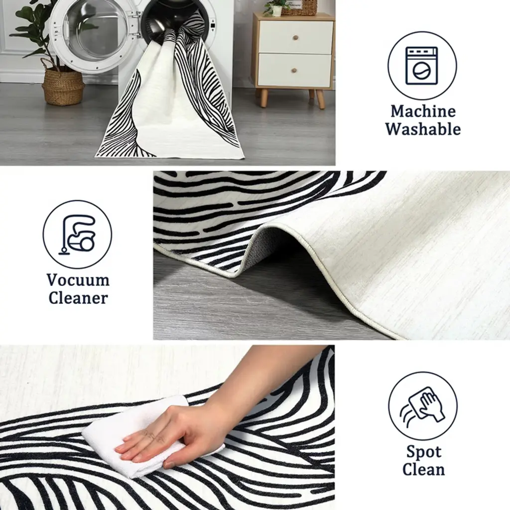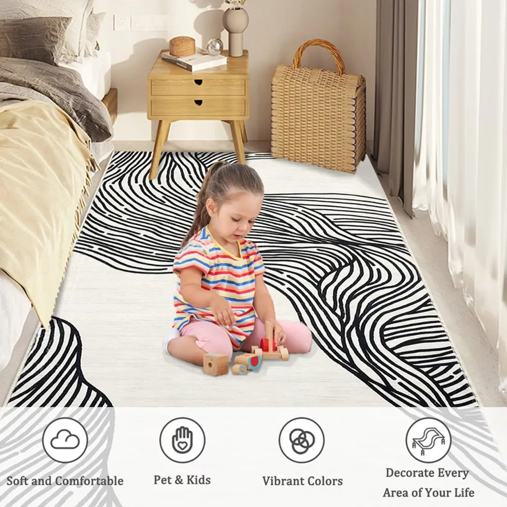 Transform your home with this stylish, machine-washable area rug, featuring a modern abstract design that combines elegance, safety, and easy maintenance for busy lifestyles.Highlights at a Glance:Stylish modern abstract design for an elegant touch.Durable and low pile, perfect for high-traffic areas.Safety-focused with non-slip TPR backing for peace of mind.Versatile use in nurseries, bedrooms, living room and entryways.Hassle-free cleaning with machine washable convenience.Specifications:Size: 2x6, 5x7, 6x9, 8x10, 9x12, 10x13 Color: Beige and BlackMaterial: Polyester, Faux Wool Note:Avoid using bleach to maintain the rug's color and texture.For minor stains, spot clean using a damp cloth or vacuum immediately. This will help prevent stains from setting in.The color may appear significantly different depending on the lighting conditions.