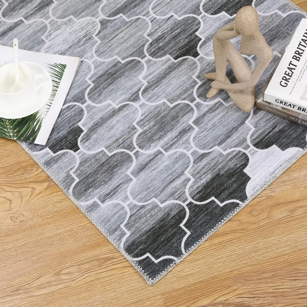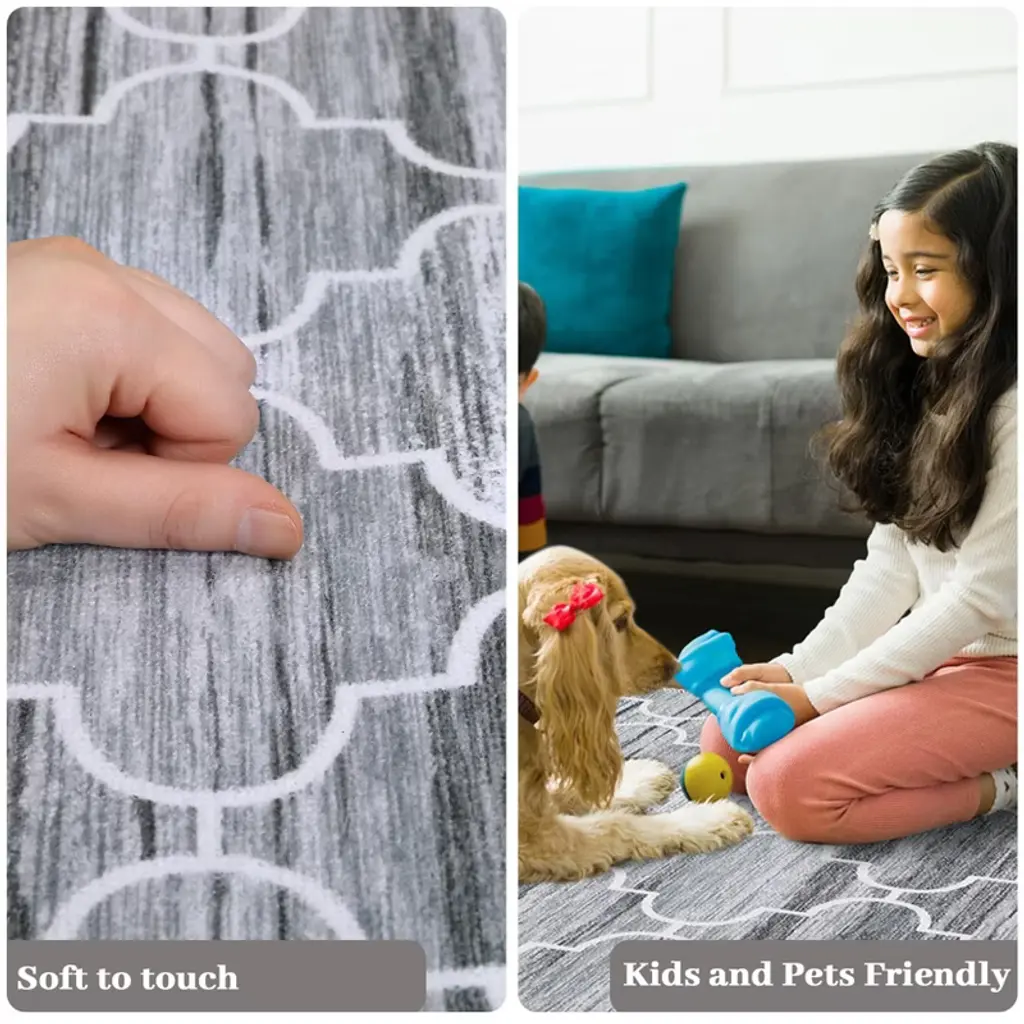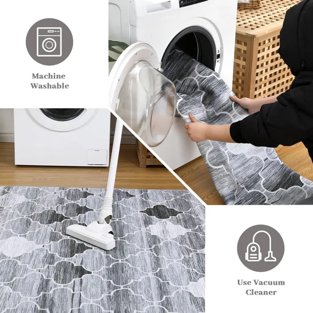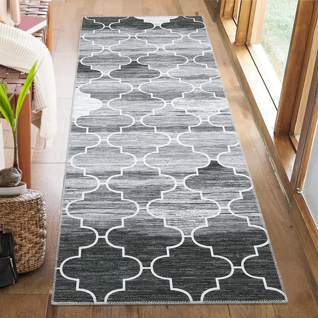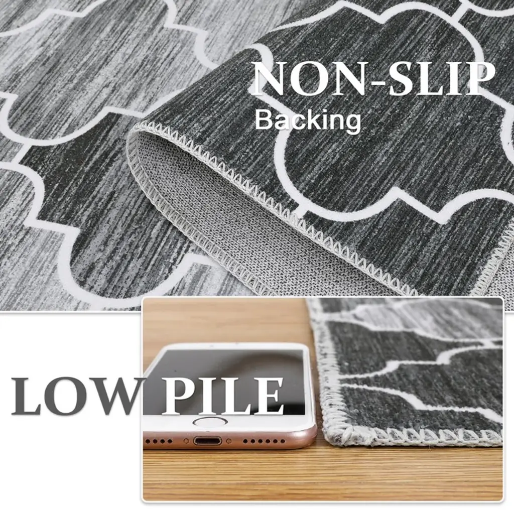 1.Contemporary Geometric Design in Versatile Grey Elevate your space with this stylish runner featuring a modern geometric pattern in sophisticated grey tones. The minimalist design:Complements farmhouse, modern and Scandinavian decor Adds visual interest to narrow spaces Creates a cohesive look throughout your home Features fade-resistant printing technology 2.Ultra-Convenient Machine Washable Construction Enjoy effortless cleaning with this fully machine-washable rug (cold water, gentle cycle). The advanced fabric technology:Maintains vibrant colors through 50+ washes Resists shrinking and warping Dries quickly when air-dried Eliminates the need for professional cleaning 3.Family-Friendly Stain & Shed Resistant Surface Engineered for real-life messes with:Tightly woven low-pile construction that prevents shedding Advanced stain guard technology that repels spills Easy-to-clean surface for pet accidents and muddy paws Durable fibers that withstand heavy foot traffic 4.Secure Non-Slip TPR Backing for Safety Our upgraded backing system provides:Military-grade grip on all floor surfaces (tested to 250 lbs pull force) Complete slip prevention for children and elderly Floor protection from scratches No curling edges or bunching 5.Versatile Low-Profile Design for Multiple Spaces The perfect 2'x6' runner for:Kitchen aisles (fits perfectly between counters) Hallway pathways (protects high-traffic areas) Bathroom vanities (adds warmth to cold floors) Entryway welcome mats (catches dirt effectively) Bedroom sides (soft landing for bare feet)