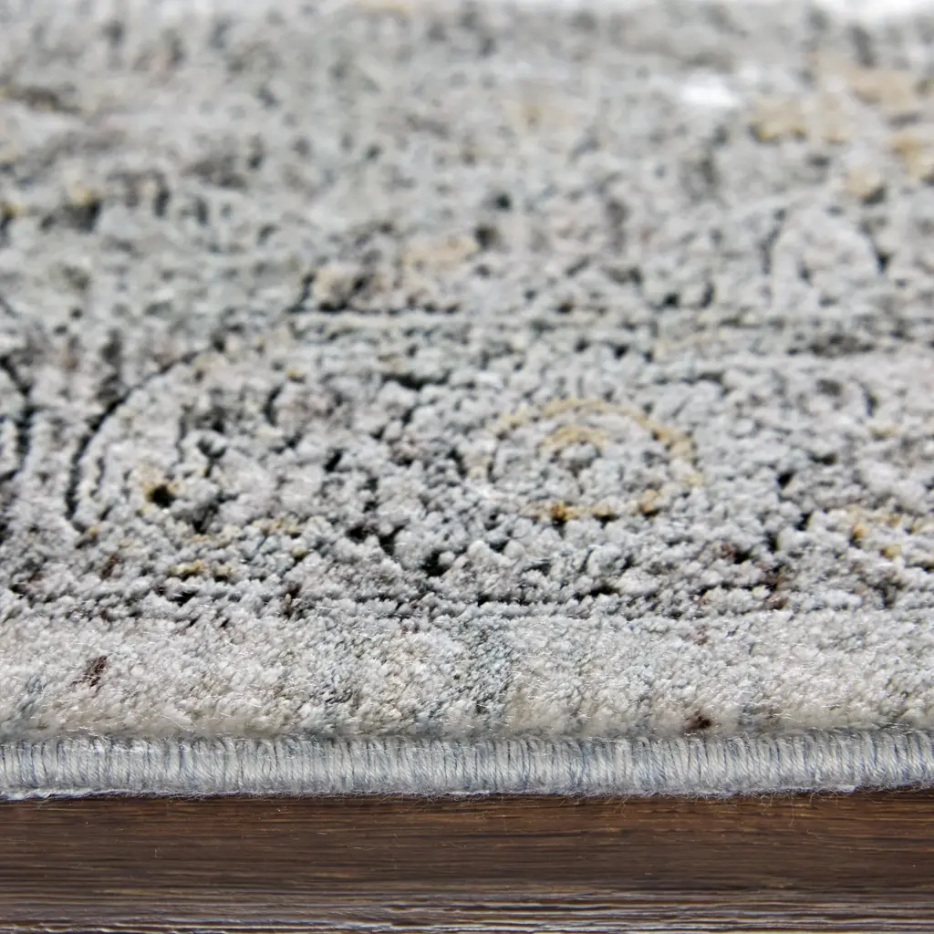 Collection: Sarrant Colors: Gray, Silver Gray, Tan Construction: Machine Made Material: Face: Viscose, Polyester / Warp: Cotton Pile: Low Pile Pile Height: 0.22" Styles: Transitional,Farmhouse,Casual Backing: Cotton Made In: Turkey Thickness: 0.22" Price Range: $$$$$ (Premium)