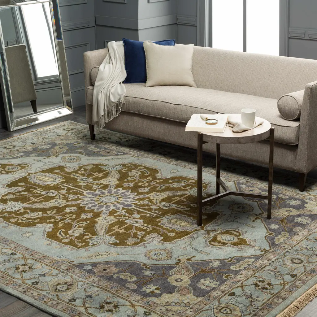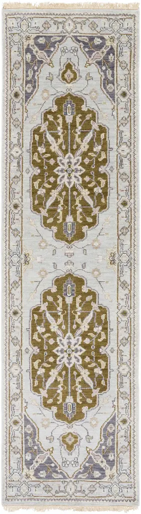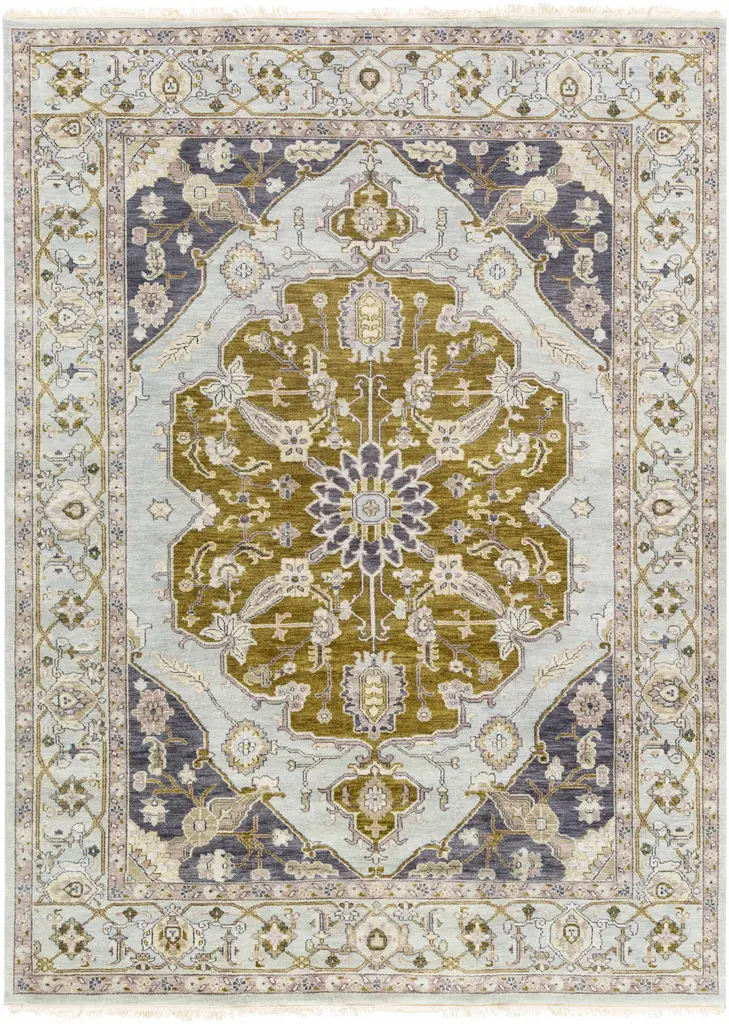 Collection: Senath Colors: Light Purple, Ivory, Navy, Olive, Tan, Blue Construction: Hand Knotted Material: 100% NZ Wool Pile: Medium Pile Pile Height: 0.28" Styles: Traditional Made In: India Thickness: 0.59" Fringe Length: 1.5" Price Range: $$$$$ (Affordable)