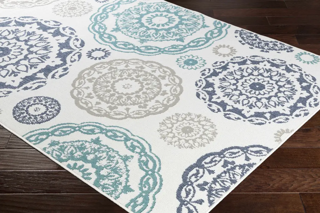 Collection: Shonkin Colors: Teal, White, Taupe, Navy Construction: Machine Woven Material: 100% Olefin Pile: No Pile Styles: Transitional,Traditional Outdoor Safe: Yes Made In: Egypt Thickness: 0.16" Price Range: $$$$$ (Most Affordable)
