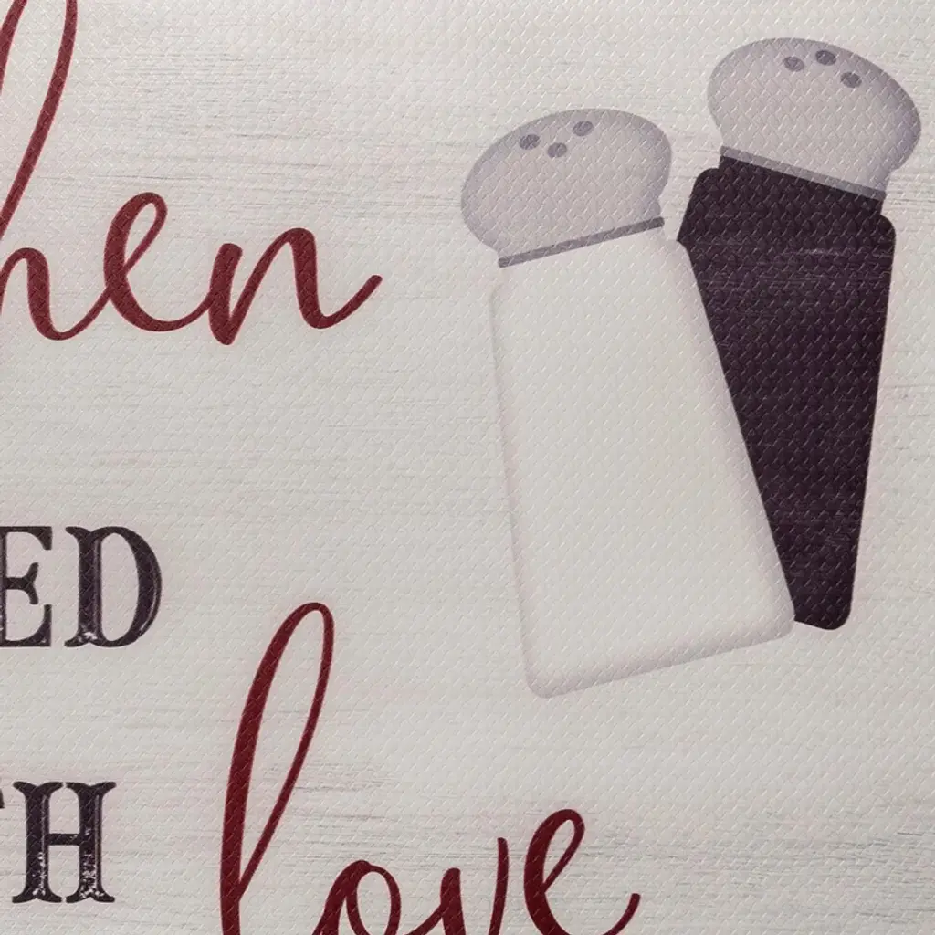 Introduce a welcoming atmosphere to your kitchen dÂcor with the Cozy Living Seasoned with Love kitchen mat by SoHome. Featuring a salt and pepper design with a kitchen friendly quote that will add a personal touch to your dÂcor. This anti-fatigue kitchen mat will provide long-lasting comfort while you perform your daily tasks. Finished with a beautifully embossed textured top, these mats are constructed of durable polyvinyl with a smooth beveled edge that provides a non-slip surface.