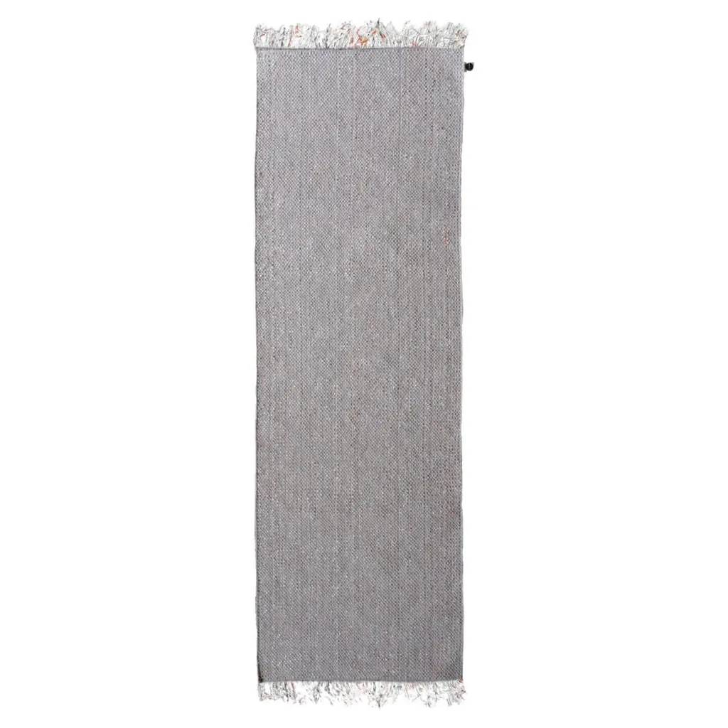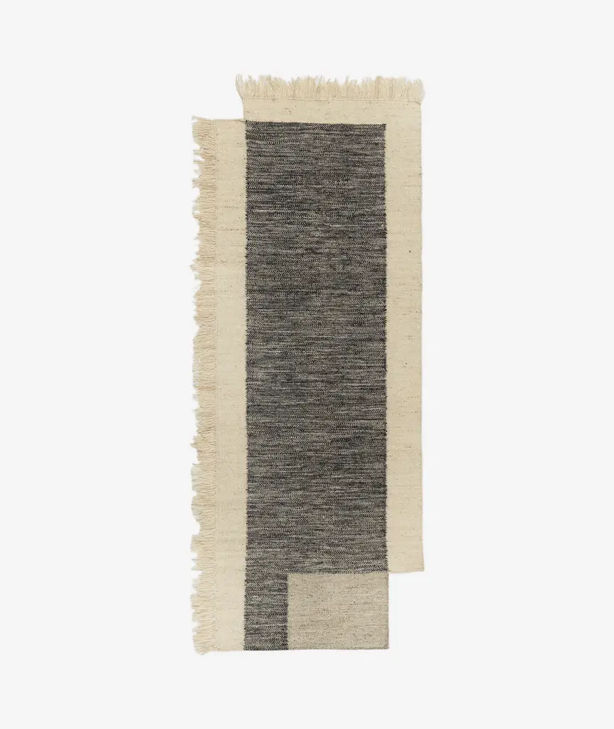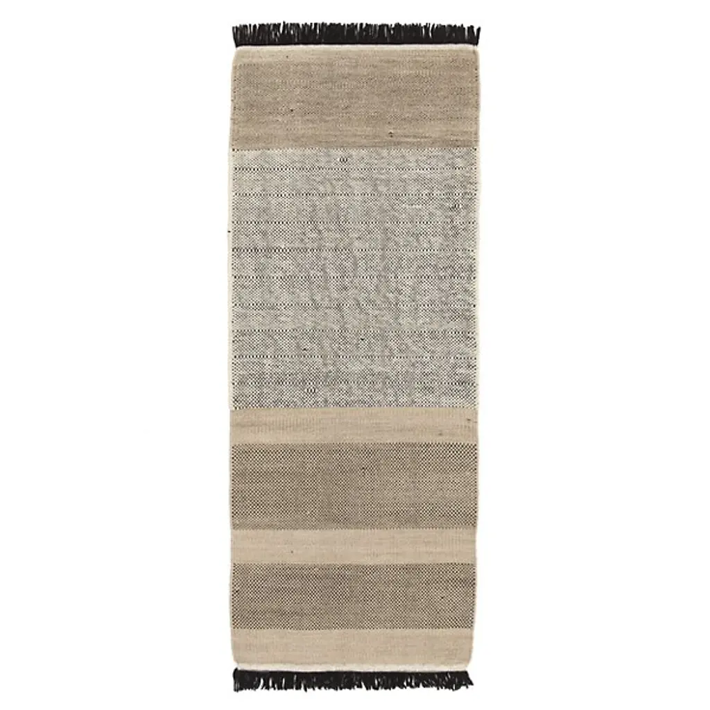 The Soil Kelim Runner Rug from Ferm Living finds its inspiration in the natural geological forms of rock formations. The tight weave is both comfortable and offers purchase, showing off a tricolor design with stripes of varying sizes and orientations woven from soft, strong New Zealand wool and cotton by the hands of Indian artisans. A soft fringe runs across its short edges to soften the straight sides of the rug, creating artistry and comfort in a single package.