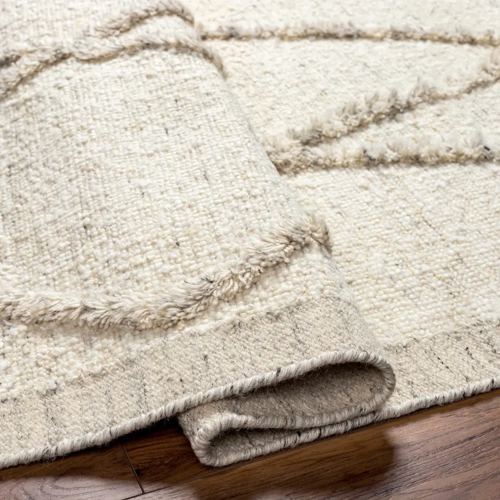 Collection: Soto Colors: Cream, Charcoal, Beige Construction: Hand Knotted Material: 100% Wool Pile: Medium Pile Pile Height: 0.45" Styles: Transitional,Bohemian Made In: India Thickness: 0.7" Price Range: $$$$$ (Affordable)