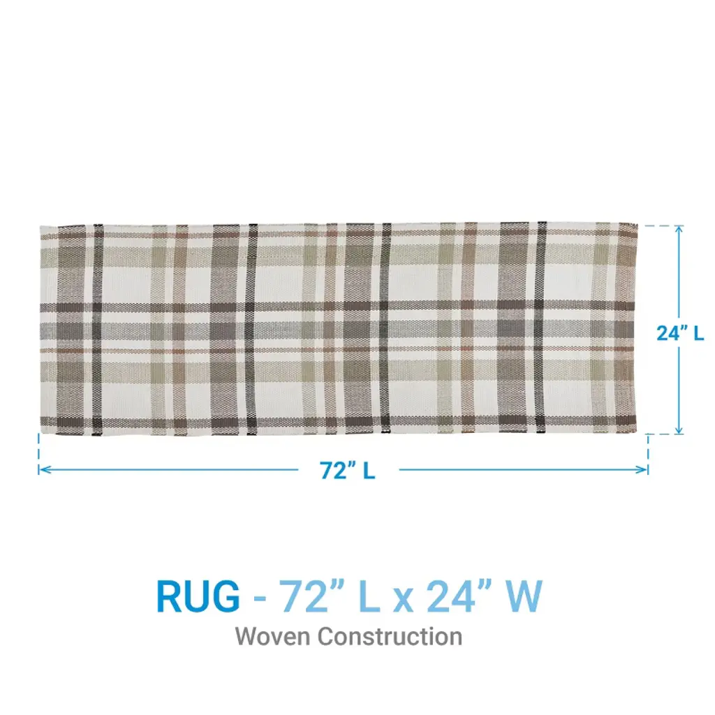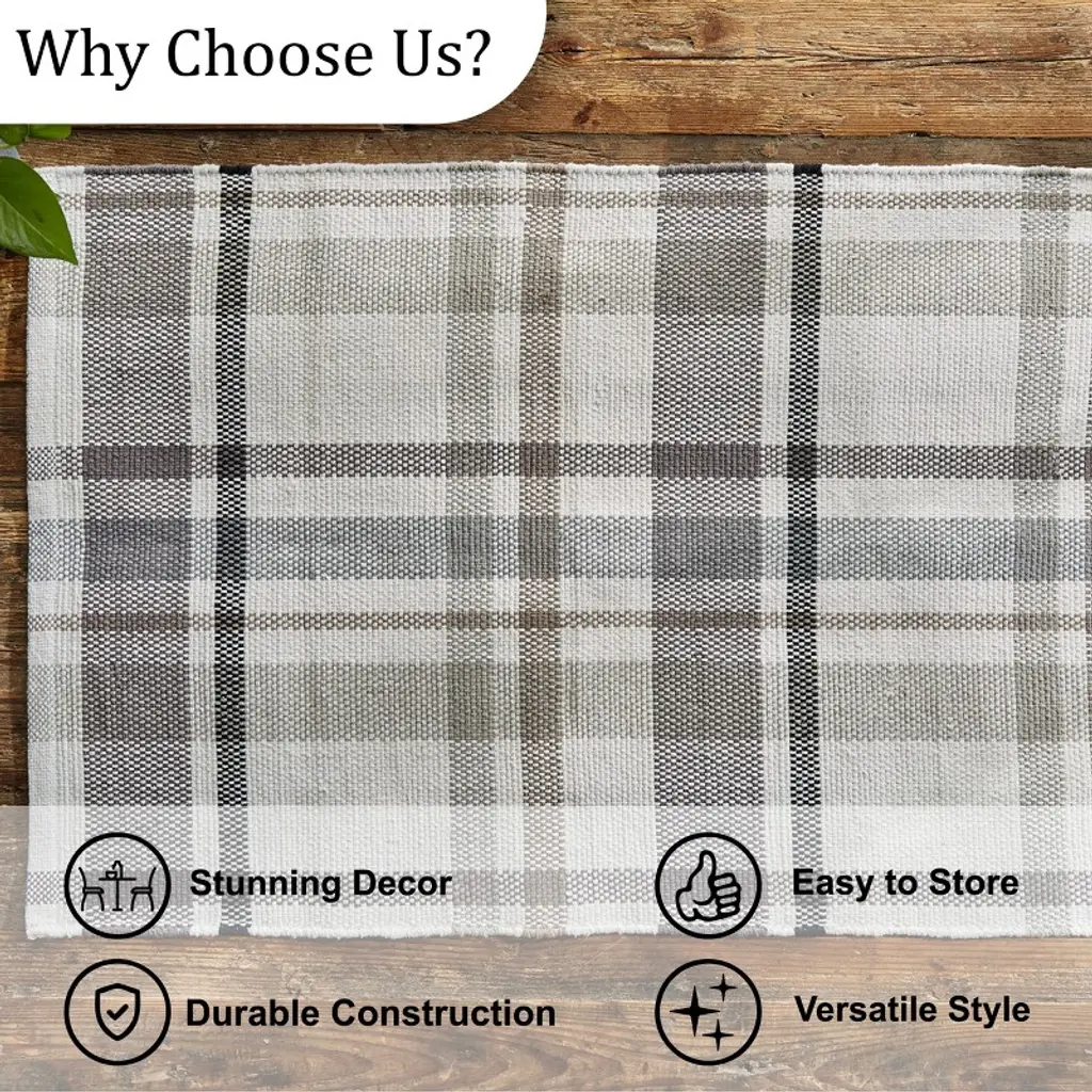 This neutral accent rug is woven with gray and cream tones into a traditional plaid design. The patterned rug runner is soft and luxurious from the durable flat-pile construction expertly crafted with high-quality cotton material. Highly versatile flooring accessory for any room in the house from the hallway to the entryway, kitchen, and more that adds texture and warmth. The minimalistic woven design offers a versatile year-round addition to any casual, bohemian, country, and modern farmhouse decor. Double sided for double the wear!