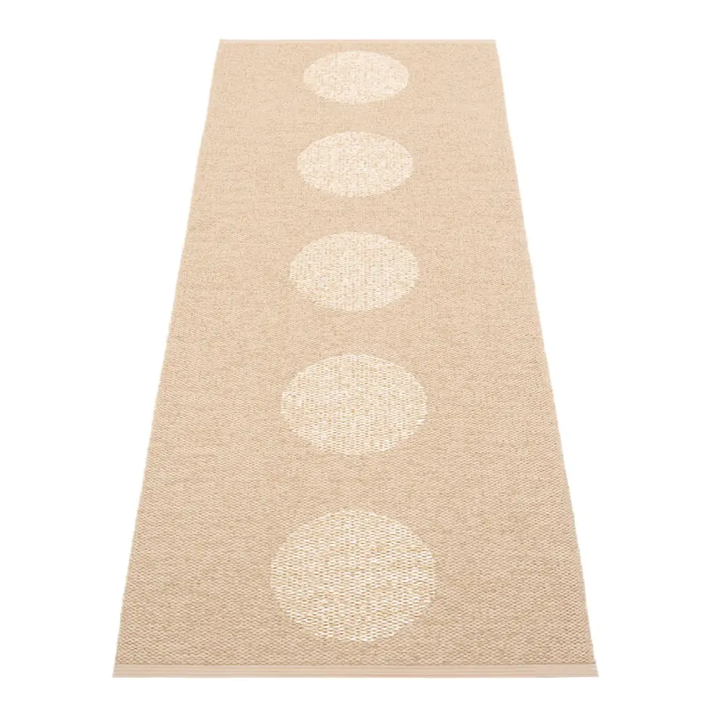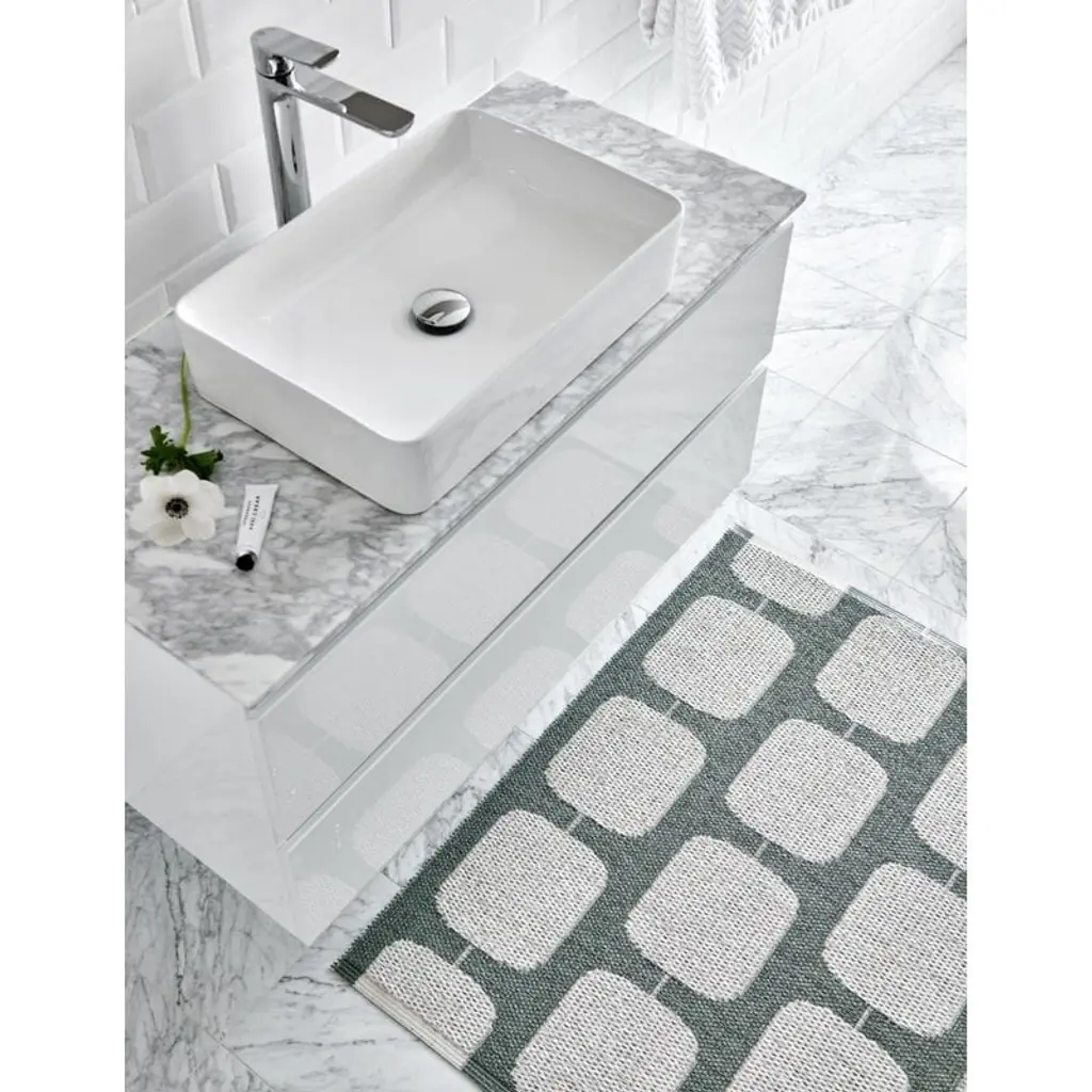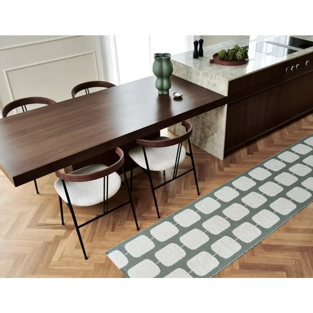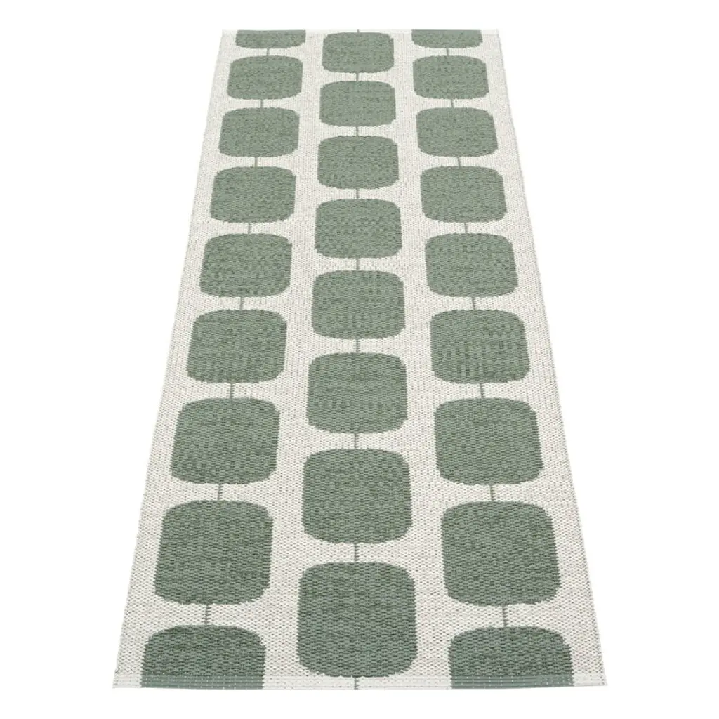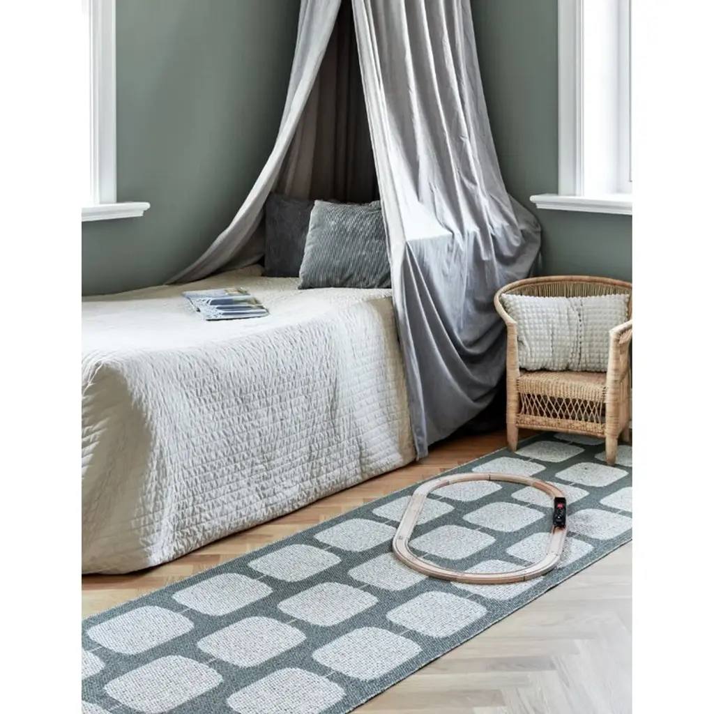 Pappelina’s Sten rug features a beautiful geometrical pattern, resembling paving stones. A two-sided design equals double the fun: you can flip the carpet over when you feel like it’s time for a new color. The double-folded edges are hemmed with a strong seam. Made of phthalate-free PVC ribbon, the rug is easy to clean and makes a practical choice for all spaces. Due to its narrow form, the rug can easily be put to use as a stunning hallway runner, a kitchen area rug or an outdoor rug. The Sten rug is woven using traditional techniques in Dalarna, Sweden.