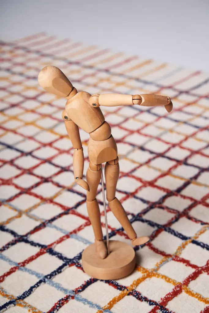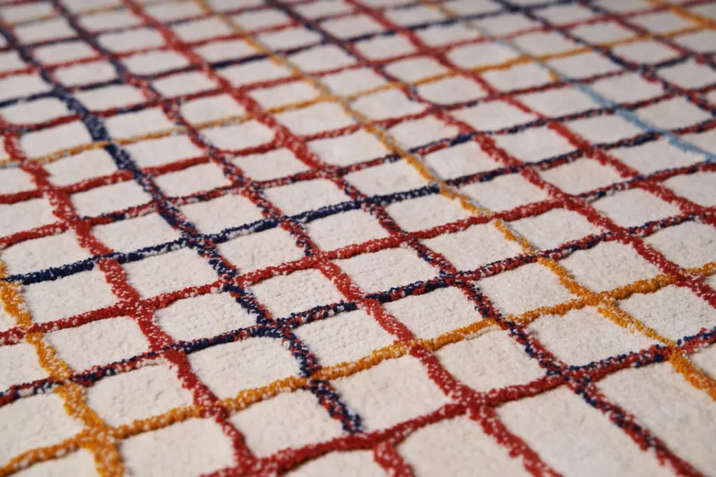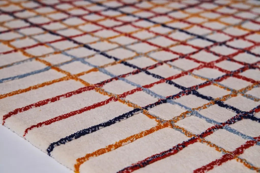 Strokes Multicolored hand-tufted runner rug offers a playful interpretation of the classic grid pattern through the use of cheerful colors. Each line, tufted by skilled artisans, resembles a child's joyful scribble, imbued with a vibrant color palette of red, blue, yellow, and navy blue on a warm ivory canvas. The pile height of the colored lines is slightly higher than the ivory background, creating a rich texture. The pile height of the ivory background is 14mm. The material choice is wool, as a naturally durable, soft and warm underfoot, ensuring both comfort and longevity. Design of this area rug can be hand-tufted to any size, ensuring a perfect fit for your space.