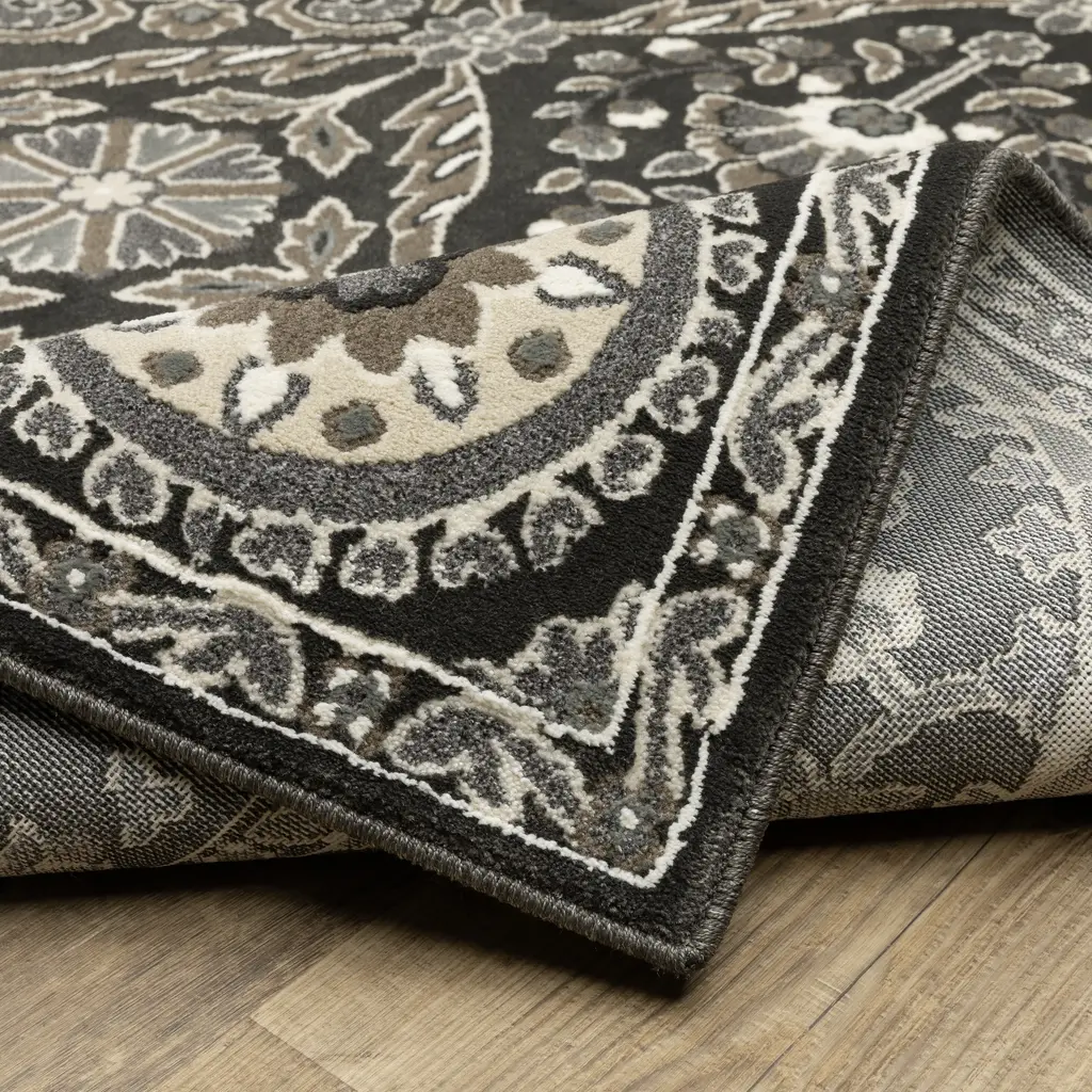 Create refined dimension in your space with the Ripley collection. These power-loomed rugs feature classic Persian, global, and geometric designs in contrasting black and ivory tones, along with soft blues, grays, and neutrals for added versatility.Features:Traditional style indoor area rugPersian inspired patternPower-loomed from a polypropylene and polyester blend with a woven polypropylene backingDimensional high low pile offers texture and dimensionFeatures shades of charcoal, black, grey, ivory, beige, taupeCleaning and Installation:If spills occur, blot as much of the stain as possible with a clean cloth. Use a small amount of mild soap and water to clean the area. If needed, rug and carpet cleaners that are safe for synthetic materials may be used. As with anything, use sparingly and in a small, inconspicuous area first to test results before applying to the entire rug. Blot dry with clean cloth. The use of a rug pad is recommended; initial creasing is normal, and these will generally fall out within a few days to a week; tightly reversing rolling the rug (pile side out) and leaving in warm area for several hours will aid in the removal of creases or lingering fold marks.Disclaimer:Due to the difference of monitor colors, some rug colors may vary slightly. We try to represent all rug colors as accurately as possible. All rug sizes are approximate. Sizes may vary +/- 1-3 inches due to weather, climate, and physical conditions at time of production and shipping.