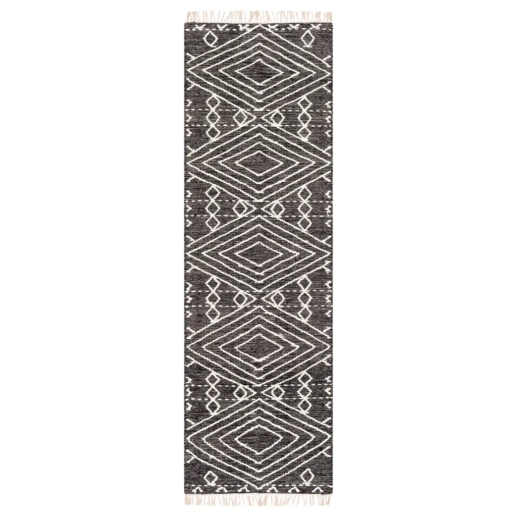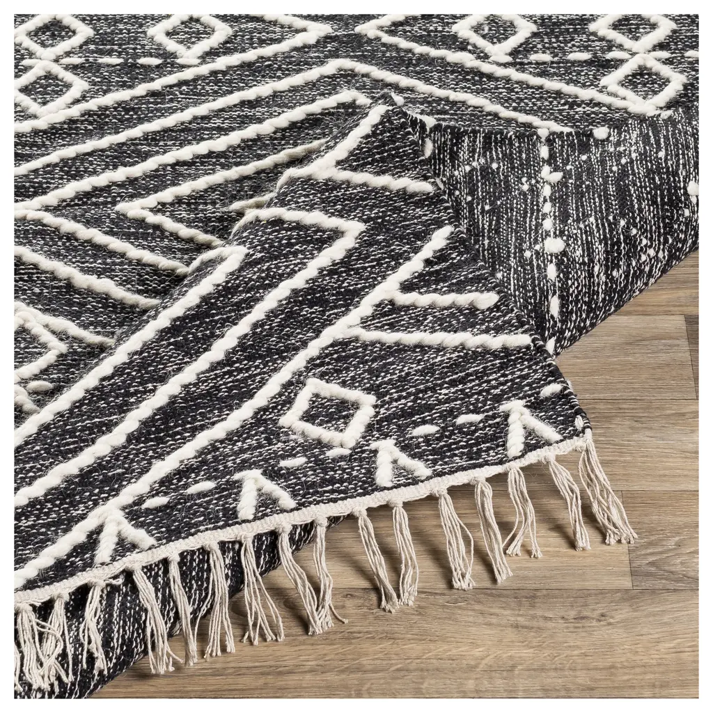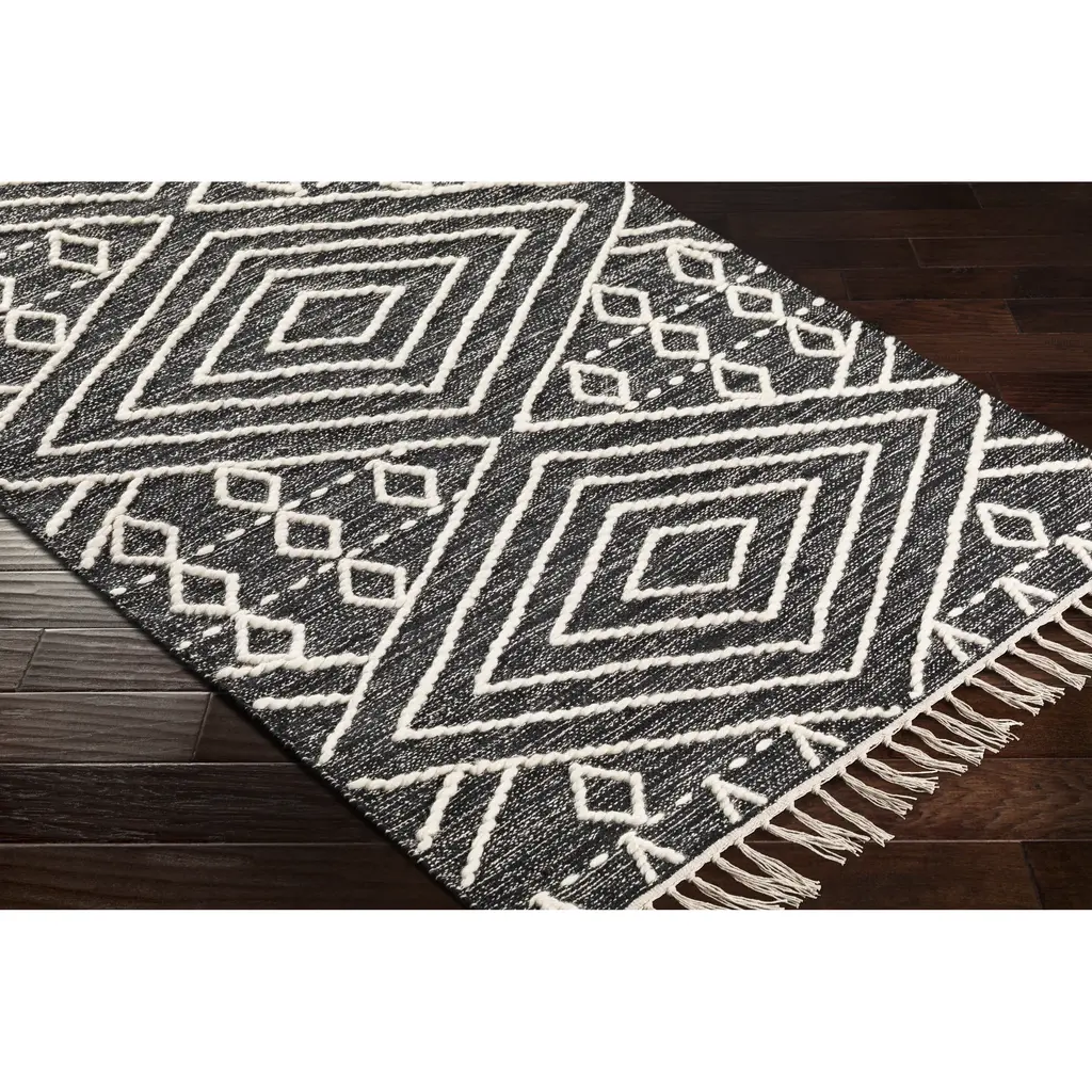 The India inspired Surya Bedouin BDO-2300 Global Area Rug is made from Cotton and Wool in a No Pile and is available in several sizes of high-quality, fashionable Accent Rugs, Runners and Area Rugs for an upscale feel to your home.The Bedouin Collection feautures compelling global inspired designs brimming with elegance and grace! The perfect addition for any home, these pieces will add eclectic charm to any room! With their hand knotted construction, these rugs provide a durability that can not be found in other handmade constructions, and boasts the ability to be thoroughly cleaned as it contains no chemicals that react to water, such as glue. Made with Cotton, Wool in India, and has No Pile. Spot Clean Only, One Year Limited Warranty.Specifications:Collection: BedouinDesign: BDO-2300Color: Black, CreamMaterial: 70% Cotton, 30% WoolConstruction: Hand KnottedBacking: No BackingStyle: GlobalPile Type: No PilePile Height: 0 (approx.)Ship Method: Small ParcelOrigin: India