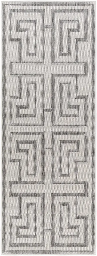 Collection: Taro Colors: Off White, Medium Gray, Light Gray Construction: Machine Woven Material: 100% Polypropylene Pile: No Pile Styles: Transitional,Bohemian Outdoor Safe: Yes Made In: Turkey Thickness: 0.2" Price Range: $$$$$ (Most Affordable)