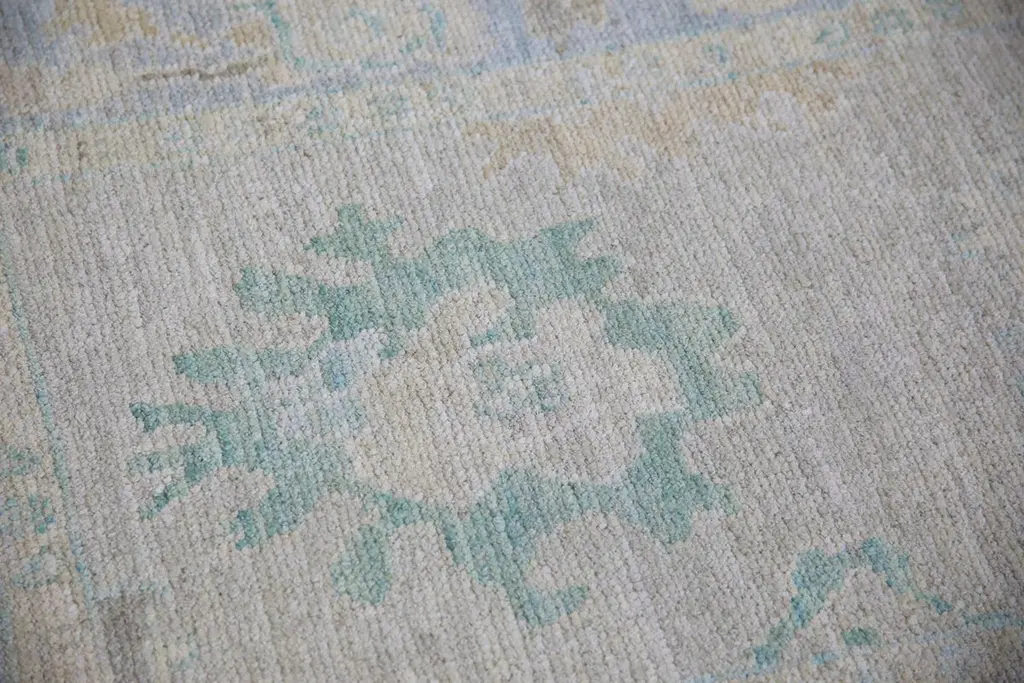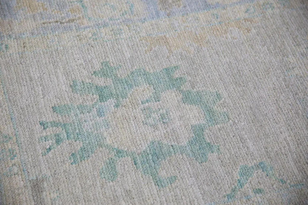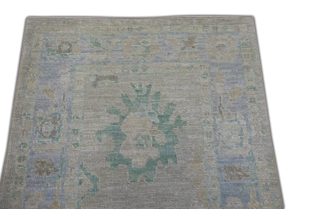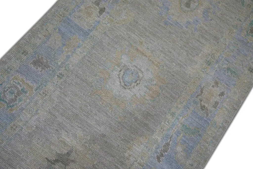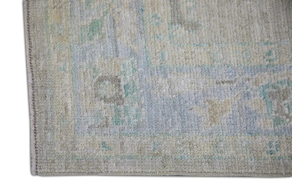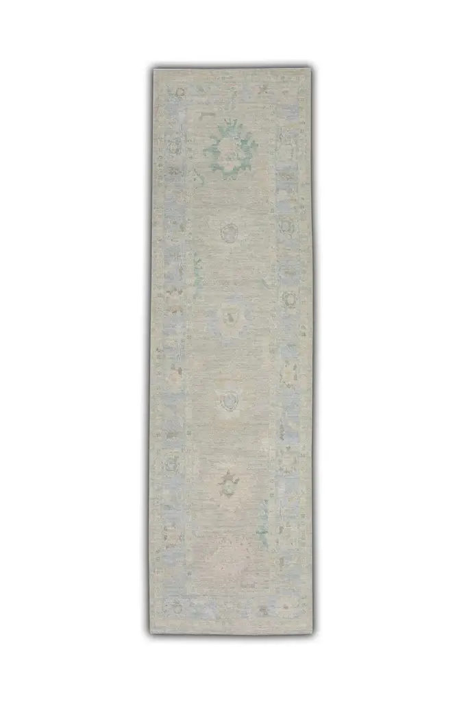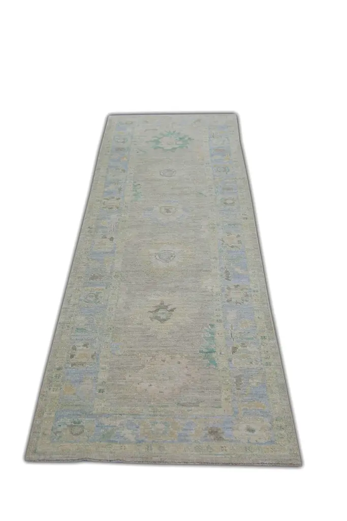 Turkish Oushak Runner Rug Blue and Sage Handwoven Wool Rug 2'11" x 10'4"This elegant 2'11" x 10'4" Turkish Oushak runner offers a soothing palette of muted blue, soft sage, and faded ivory tones. Handwoven from premium quality wool and dyed using all-natural vegetable dyes, this rug is a timeless example of traditional Turkish craftsmanship.The elongated design is ideal for hallways, entryways, or alongside a kitchen island. Delicate geometric and botanical motifs are framed by a subtle border, giving the piece a refined yet understated presence. The low pile and hand-knotted texture ensure lasting durability and a gentle underfoot feel.Perfect for adding quiet sophistication and artisanal charm to transitional or contemporary spaces, this handwoven wool runner balances subtle colors with classic design.
