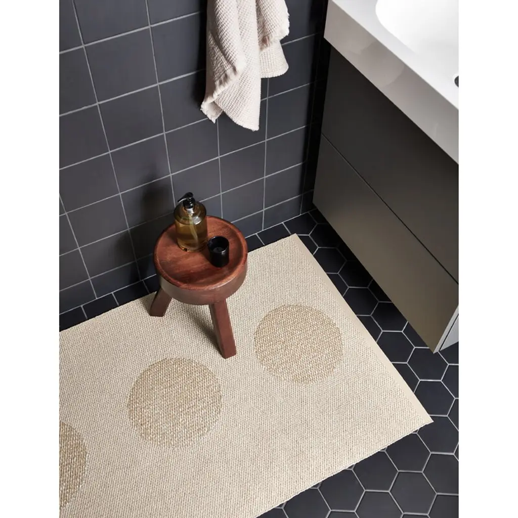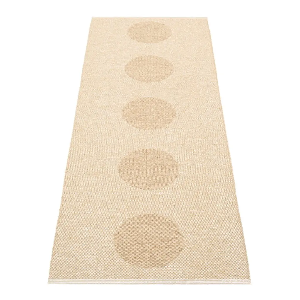 Pappelina's Vera 2.0 rug is patterned by a row of large dots, adding a simple yet bold flair and a gentle metallic sheen to any decor. A two-sided design equals double the fun: you can flip the carpet over when you feel like it’s time for a new color. The rug's edges are reinforced and welded for extra durability, and you can wash the rug by hand or in a washing machine. The main material of the Vera 2.0 rug is Biovyn, a bio-attributed PVC that is made from wood-based tall oil, a residue from the wood industry. The carbon footprint of Biovyn is more than 90% smaller compared to conventional PVC. The sustainably produced plastic rug is easy to clean and makes a practical choice for all spaces. Due to its narrow form, the rug can easily be put to use as a stunning hallway runner, a kitchen area rug or an outdoor rug. The Vera rug is woven using traditional techniques in Dalarna, Sweden.