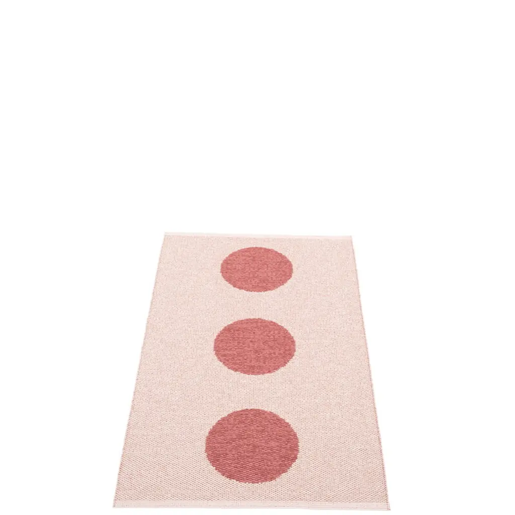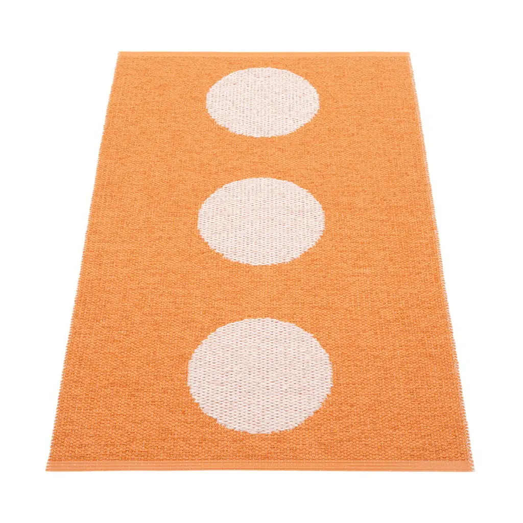 Pappelina’s Vera Pop rug features a rhythmic pattern of playful, slightly raised dots, inspired by the vibrant colors of Miami’s historic Art Deco district. A two-sided design equals double the fun: you can flip the carpet over when you feel like it’s time for a new color. The rug’s edges are reinforced and welded for extra durability, and you can wash the rug by hand or in a washing machine. The main material of the Vera Pop rug is Biovyn, a bio-attributed PVC that is made from wood-based tall oil, a residue from the wood industry. The carbon footprint of Biovyn is more than 90% smaller compared to conventional PVC. The sustainably produced plastic rug is easy to clean and makes a practical choice for all spaces. Due to its narrow form, the rug can easily be put to use as a stunning hallway runner, a kitchen area rug or an outdoor rug. The Vera rug is woven using traditional techniques in Dalarna, Sweden.