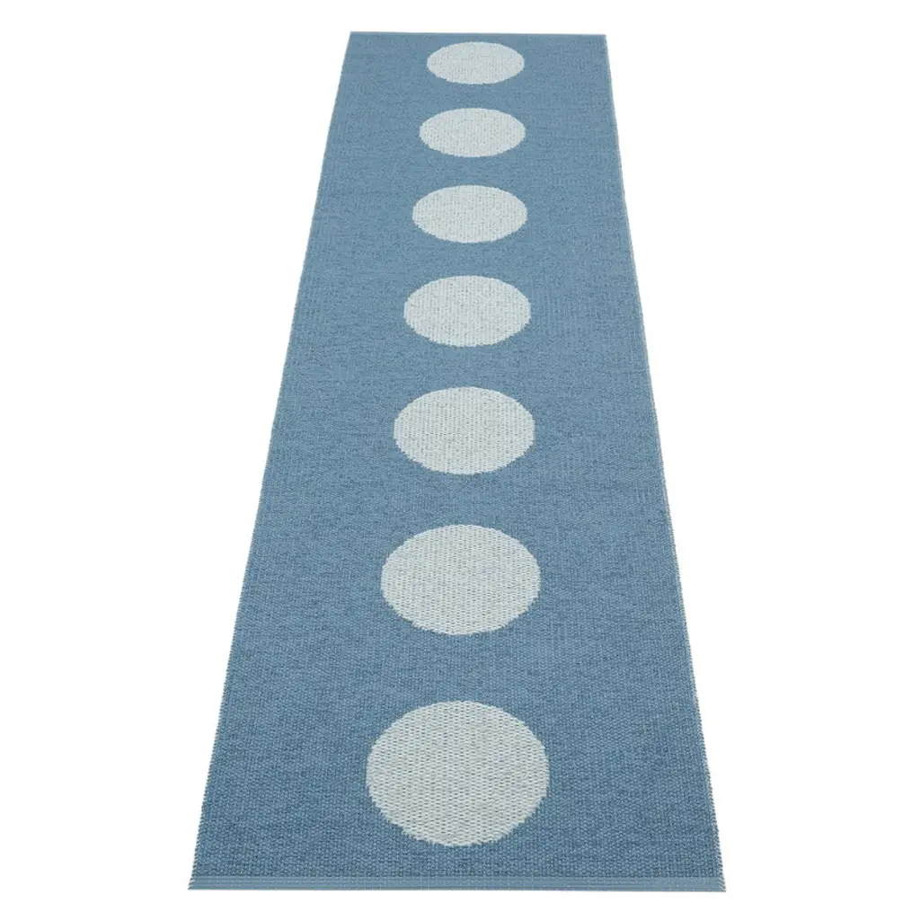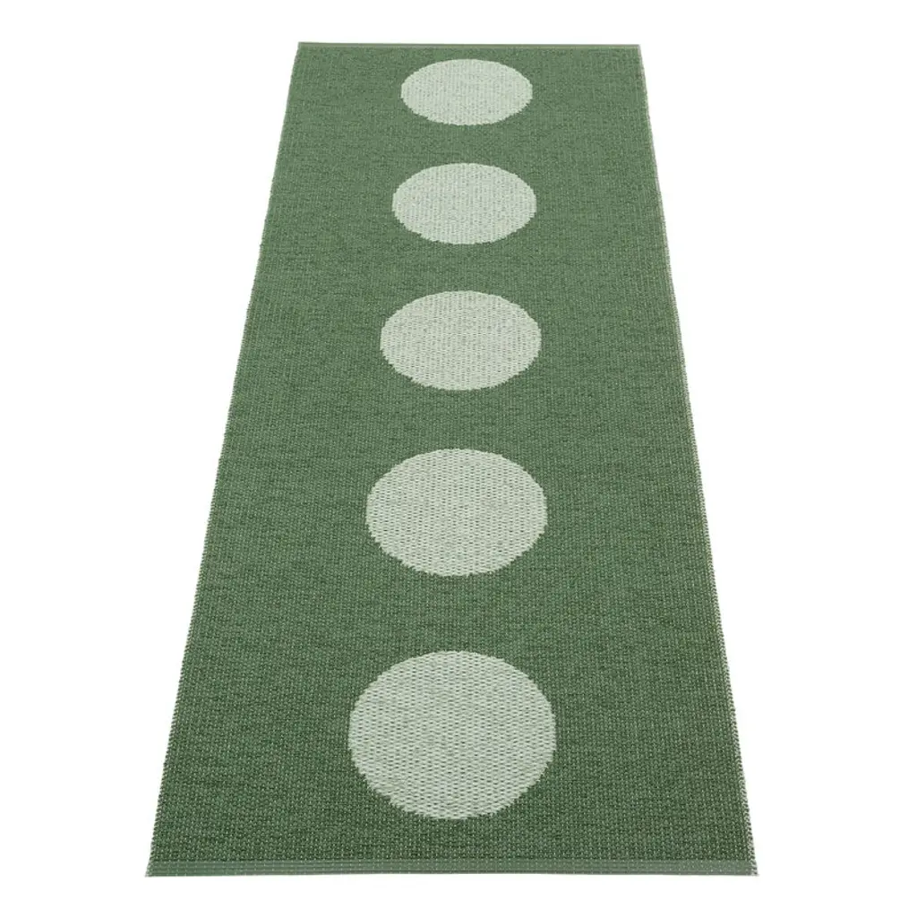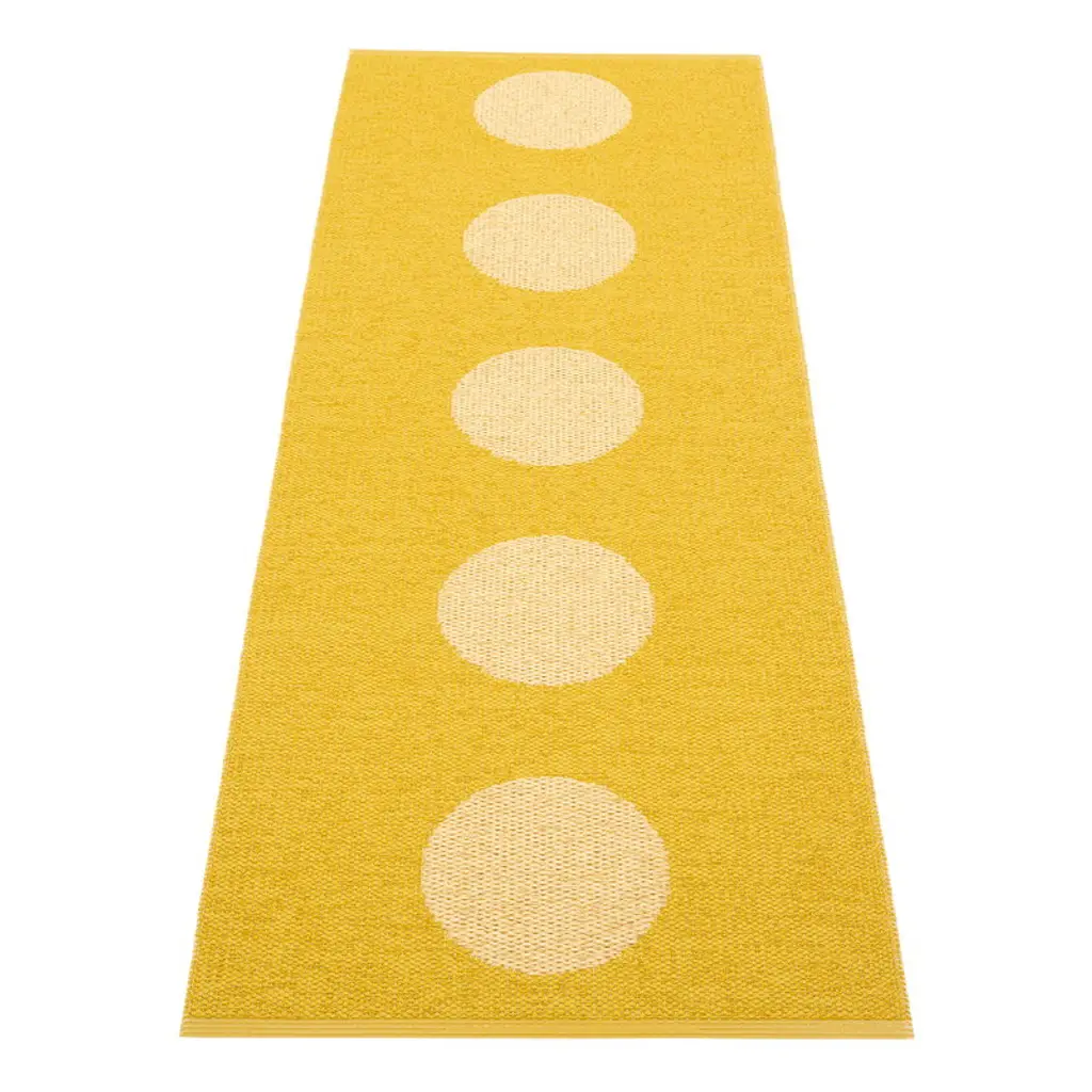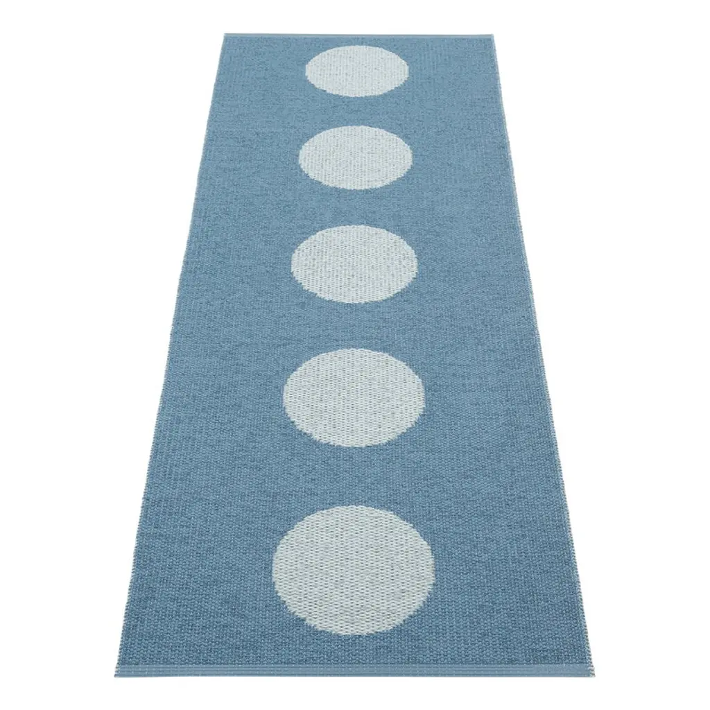 Pappelina’s Vera Pop rug features a rhythmic pattern of playful, slightly raised dots, inspired by the vibrant colors of Miami’s historic Art Deco district. A two-sided design equals double the fun: you can flip the carpet over when you feel like it’s time for a new color. The rug’s edges are reinforced and welded for extra durability, and you can wash the rug by hand or in a washing machine. The main material of the Vera Pop rug is Biovyn, a bio-attributed PVC that is made from wood-based tall oil, a residue from the wood industry. The carbon footprint of Biovyn is more than 90% smaller compared to conventional PVC. The sustainably produced plastic rug is easy to clean and makes a practical choice for all spaces. Due to its narrow form, the rug can easily be put to use as a stunning hallway runner, a kitchen area rug or an outdoor rug. The Vera rug is woven using traditional techniques in Dalarna, Sweden.