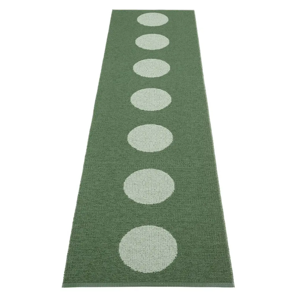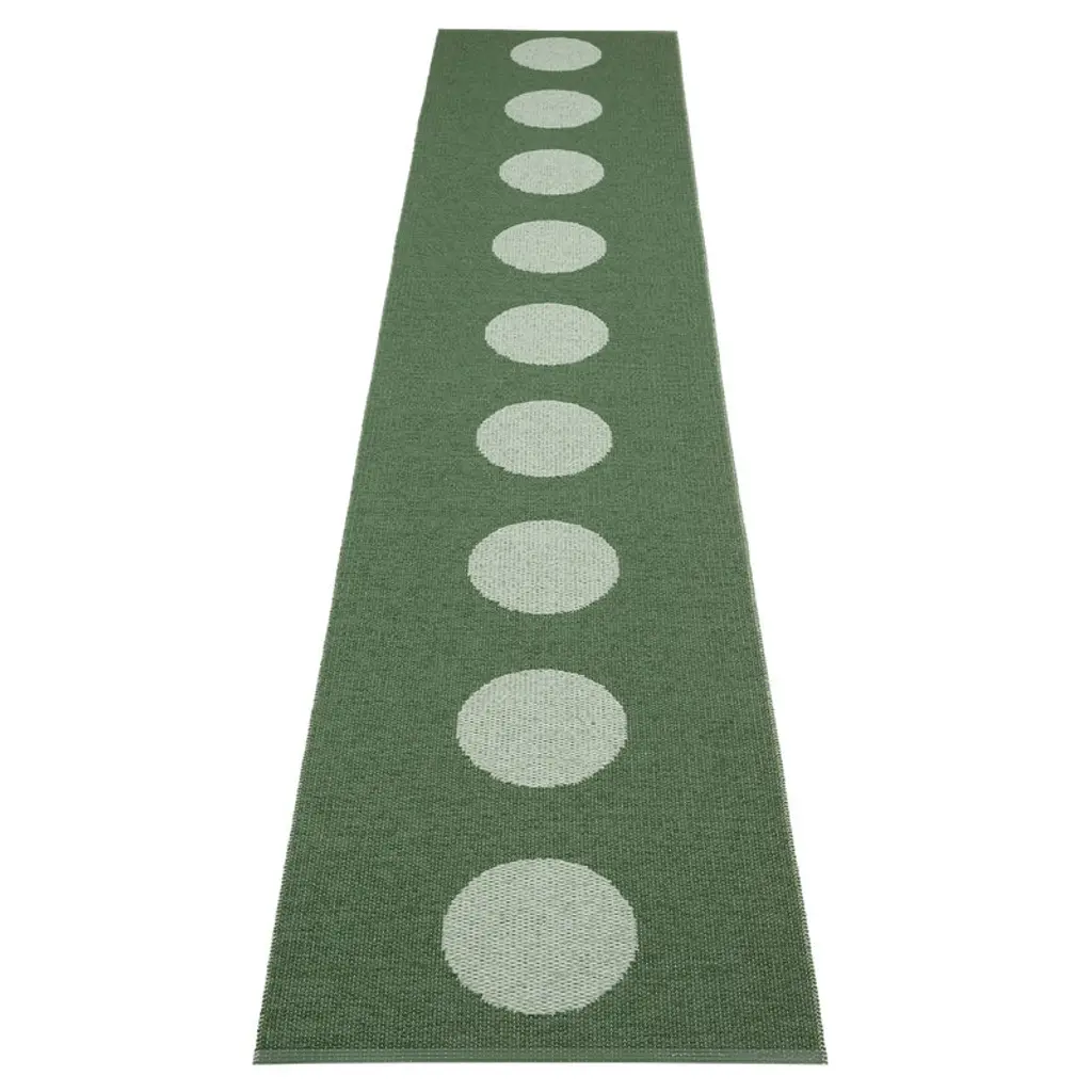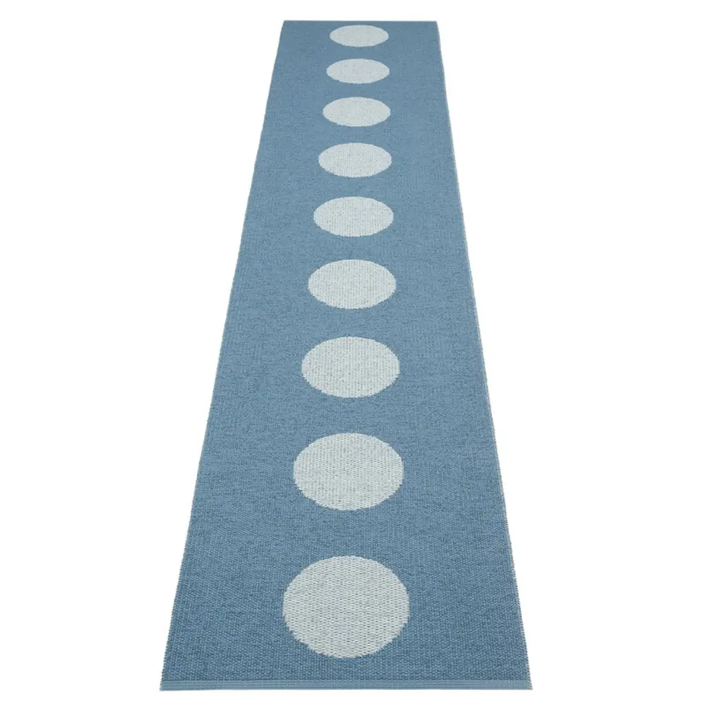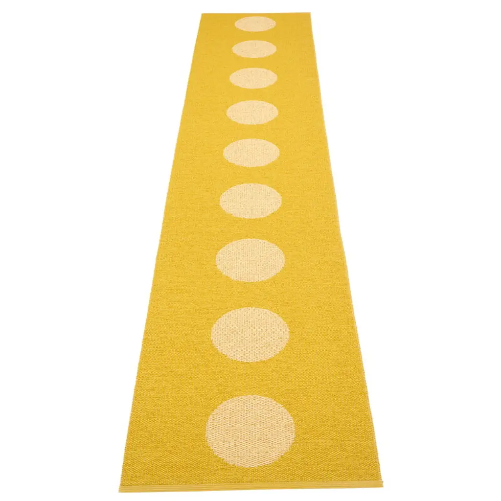 Pappelina’s Vera Pop rug features a rhythmic pattern of playful, slightly raised dots, inspired by the vibrant colors of Miami’s historic Art Deco district. A two-sided design equals double the fun: you can flip the carpet over when you feel like it’s time for a new color. The rug’s edges are reinforced and welded for extra durability, and you can wash the rug by hand or in a washing machine. The main material of the Vera Pop rug is Biovyn, a bio-attributed PVC that is made from wood-based tall oil, a residue from the wood industry. The carbon footprint of Biovyn is more than 90% smaller compared to conventional PVC. The sustainably produced plastic rug is easy to clean and makes a practical choice for all spaces. Due to its narrow form, the rug can easily be put to use as a stunning hallway runner, a kitchen area rug or an outdoor rug. The Vera rug is woven using traditional techniques in Dalarna, Sweden.