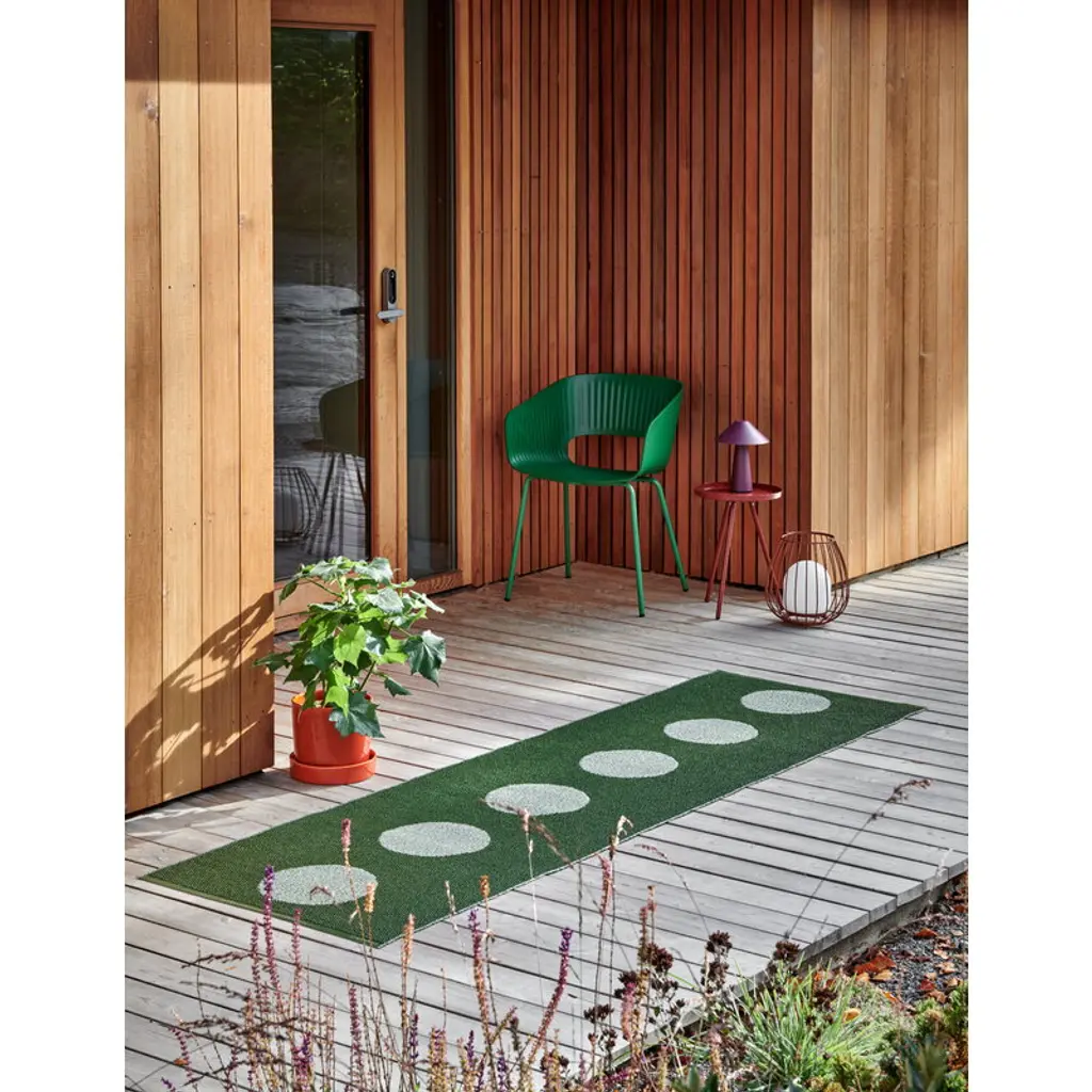 Pappelina’s Vera Pop rug features a rhythmic pattern of playful, slightly raised dots, inspired by the vibrant colors of Miami’s historic Art Deco district. A two-sided design equals double the fun: you can flip the carpet over when you feel like it’s time for a new color. The rug’s edges are reinforced and welded for extra durability, and you can wash the rug by hand or in a washing machine. The main material of the Vera Pop rug is Biovyn, a bio-attributed PVC that is made from wood-based tall oil, a residue from the wood industry. The carbon footprint of Biovyn is more than 90% smaller compared to conventional PVC. The sustainably produced plastic rug is easy to clean and makes a practical choice for all spaces. Due to its narrow form, the rug can easily be put to use as a stunning hallway runner, a kitchen area rug or an outdoor rug. The Vera rug is woven using traditional techniques in Dalarna, Sweden.