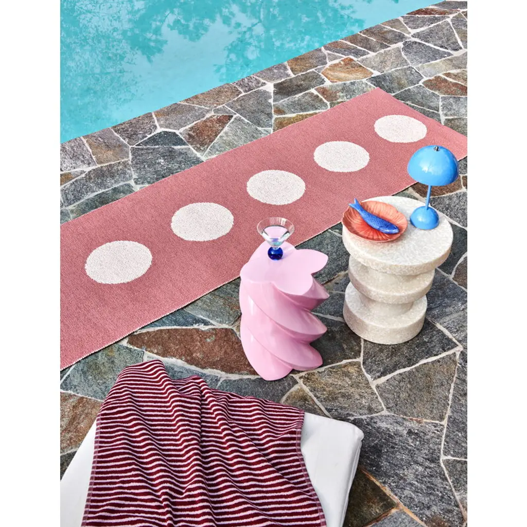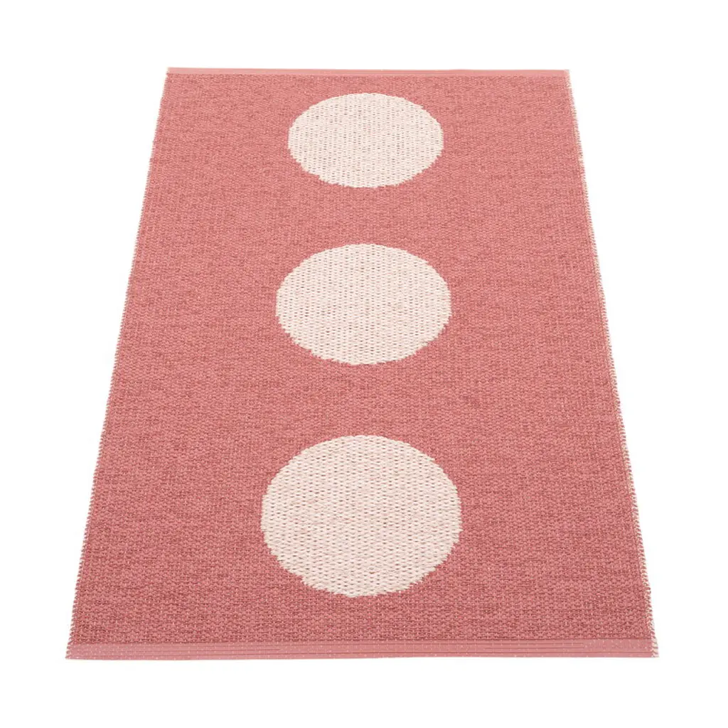 Pappelina’s Vera Pop rug features a rhythmic pattern of playful, slightly raised dots, inspired by the vibrant colors of Miami’s historic Art Deco district. A two-sided design equals double the fun: you can flip the carpet over when you feel like it’s time for a new color. The rug’s edges are reinforced and welded for extra durability, and you can wash the rug by hand or in a washing machine. The main material of the Vera Pop rug is Biovyn, a bio-attributed PVC that is made from wood-based tall oil, a residue from the wood industry. The carbon footprint of Biovyn is more than 90% smaller compared to conventional PVC. The sustainably produced plastic rug is easy to clean and makes a practical choice for all spaces. Due to its narrow form, the rug can easily be put to use as a stunning hallway runner, a kitchen area rug or an outdoor rug. The Vera rug is woven using traditional techniques in Dalarna, Sweden.