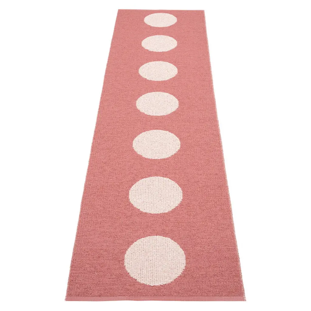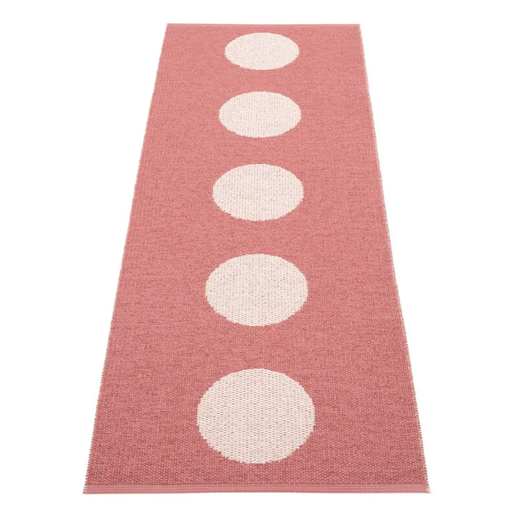 Pappelina’s Vera Pop rug features a rhythmic pattern of playful, slightly raised dots, inspired by the vibrant colors of Miami’s historic Art Deco district. A two-sided design equals double the fun: you can flip the carpet over when you feel like it’s time for a new color. The rug’s edges are reinforced and welded for extra durability, and you can wash the rug by hand or in a washing machine. The main material of the Vera Pop rug is Biovyn, a bio-attributed PVC that is made from wood-based tall oil, a residue from the wood industry. The carbon footprint of Biovyn is more than 90% smaller compared to conventional PVC. The sustainably produced plastic rug is easy to clean and makes a practical choice for all spaces. Due to its narrow form, the rug can easily be put to use as a stunning hallway runner, a kitchen area rug or an outdoor rug. The Vera rug is woven using traditional techniques in Dalarna, Sweden.