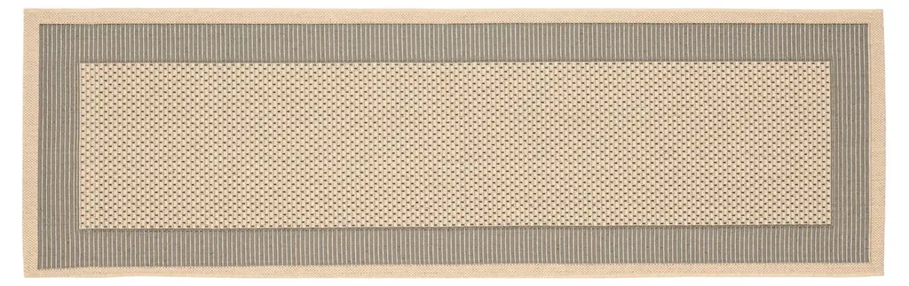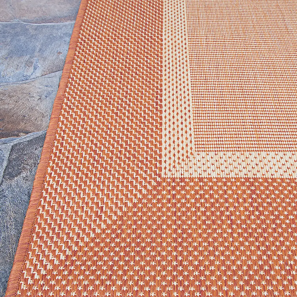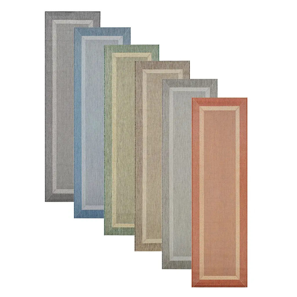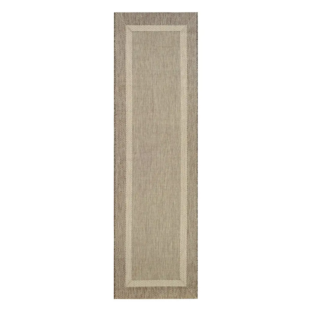Our all-weather Veranda Framework Runner features a simple design and a unique color palette that adds warmth and welcome to patio decks, stone entryways and even indoor spaces. The Framework name echoes the mitered corner design of the border, resembling a picture frame. This all-weather, pet-friendly runner is power-loomed of 100% fiber-enhanced Courtron™ polypropylene, UV-stabilized, and mold, mildew and stain resistant. Flatwoven construction produces a low ⅛" pile that clears most inside and outside doors. Soft and welcoming underfoot, this indoor/outdoor polypro runner goes where you need it and looks great, too: kitchen, sun room, porch, patio and more. Sizes are approximate. Imported.