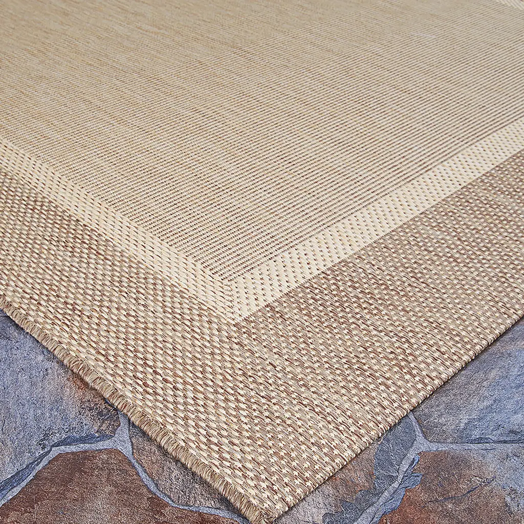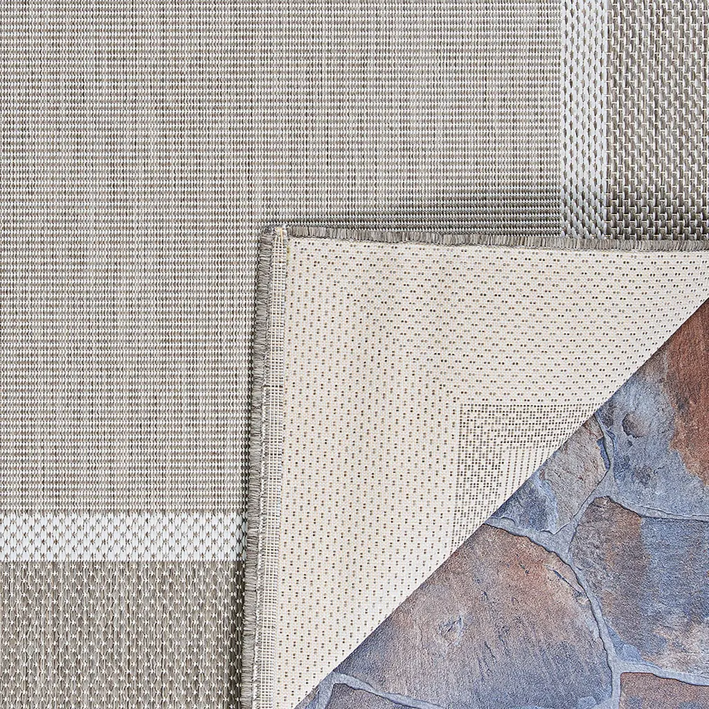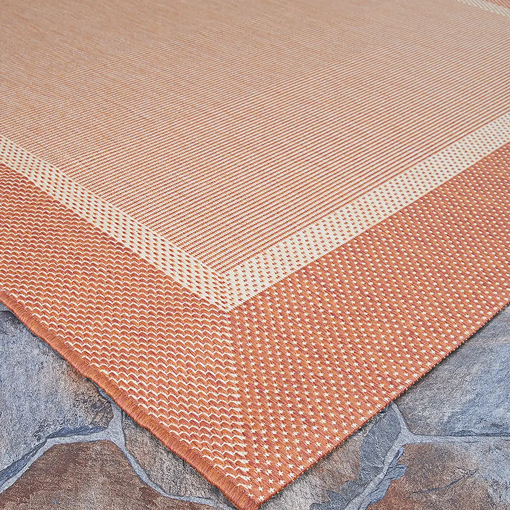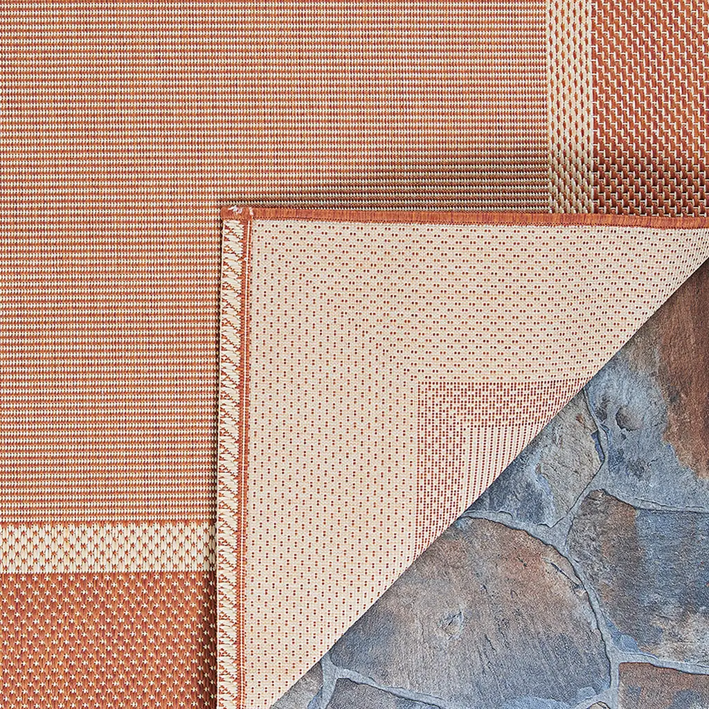 Our all-weather Veranda Framework Runner features a simple design and a unique color palette that adds warmth and welcome to patio decks, stone entryways and even indoor spaces. The Framework name echoes the mitered corner design of the border, resembling a picture frame. This all-weather, pet-friendly runner is power-loomed of 100% fiber-enhanced Courtron™ polypropylene, UV-stabilized, and mold, mildew and stain resistant. Flatwoven construction produces a low ⅛" pile that clears most inside and outside doors. Soft and welcoming underfoot, this indoor/outdoor polypro runner goes where you need it and looks great, too: kitchen, sun room, porch, patio and more. Sizes are approximate. Imported.