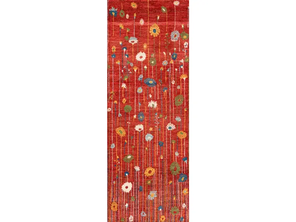 Versicoloured Flower Meadow runner 7 is a rectangular wool rug.Zollanvari Super Fine.Introducing a variety of runners for the first time from the Flower Meadow Collection, the elongated stems with diverse blooms, hypnotic Poppies in this instance, have a mysteriously surrealist and yet naturalistic feel. These runners are totally original and highly decorative.Bursting with the joys of summer meadows filled with dancing daisies the original design of this Gabbeh is naturalistic and surreal at the same time. The designer/weaver have cleverly transported us to a field of dreams... Never-never Land perhaps? The juxtaposition of the bright and contrasting colours of the flowers on the delicately abrashed woollen ground creates a sense of natural movement in this design, as if a gentle breeze is blowing through this magical meadow that stretches out to the horizon... an amazing sense of perspective that takes one's breath away.