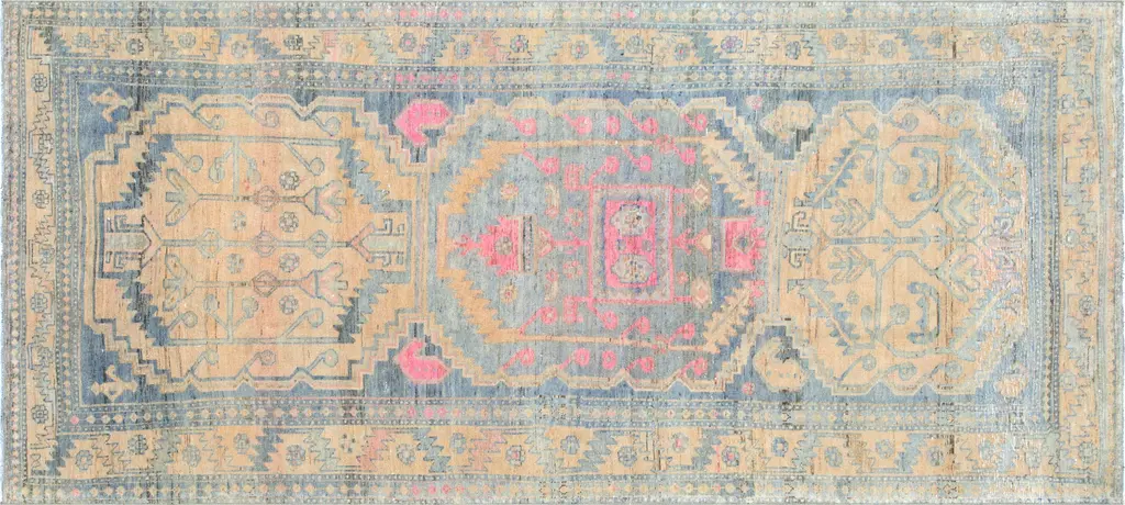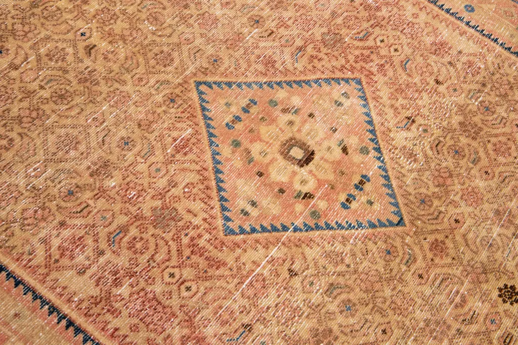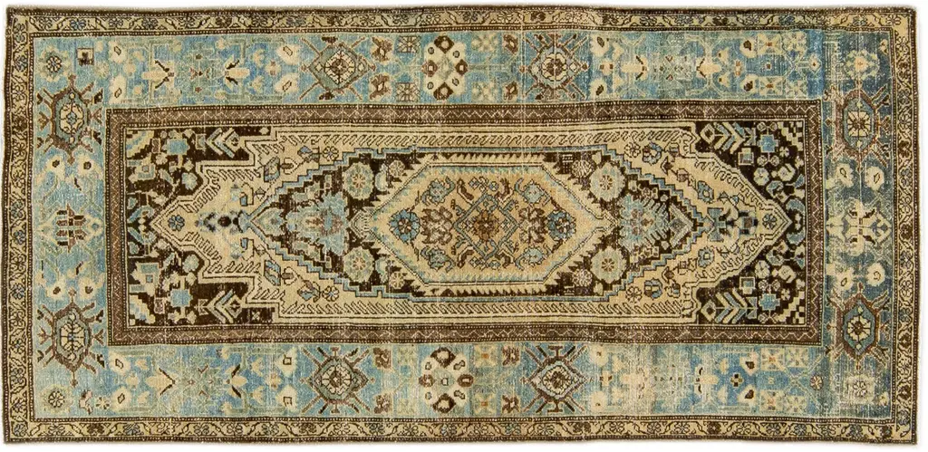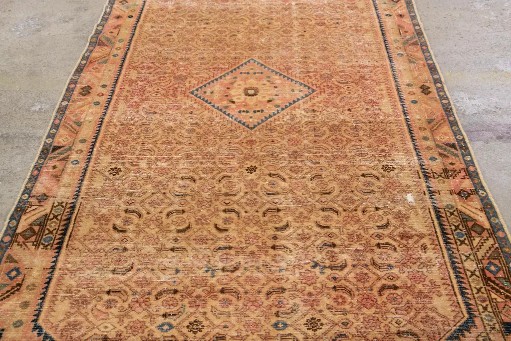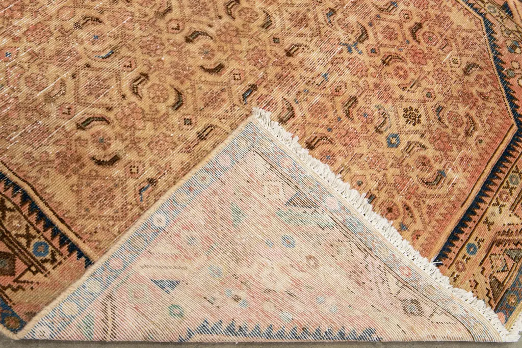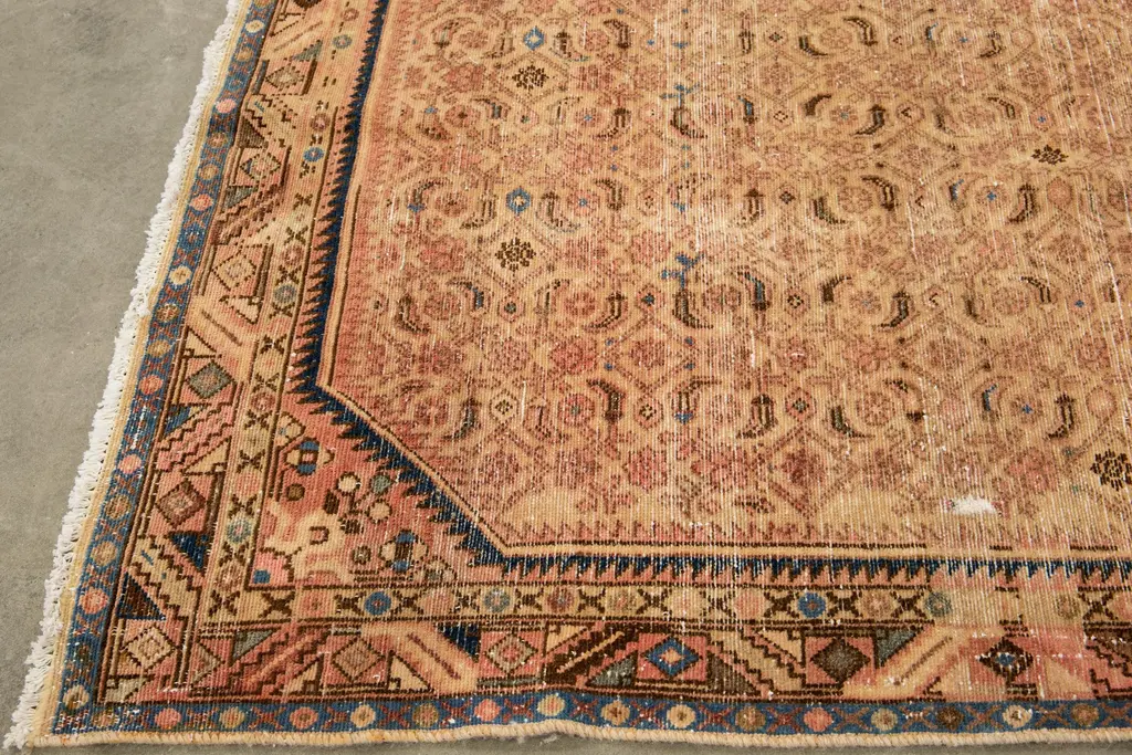 Beautiful Vintage All Over hand-knotted wool rug with a beige field. This rug has blue and brown accents all-over a geometric distressed design. This rug measures: 3'8" x 9'0".