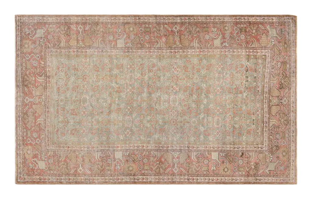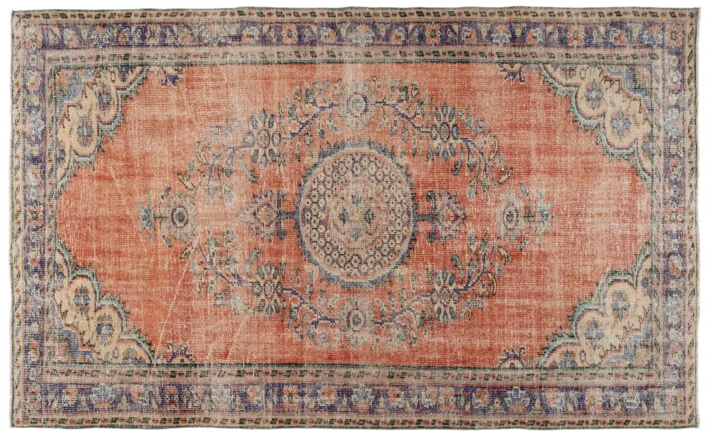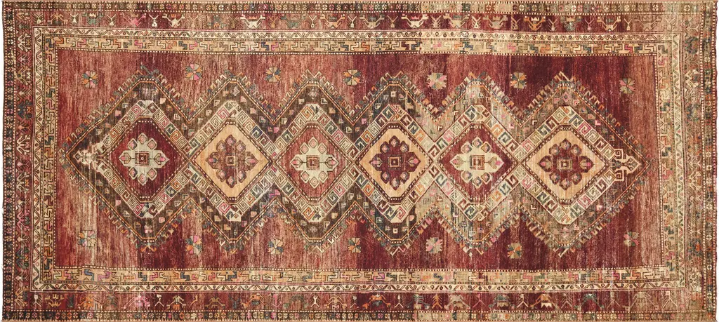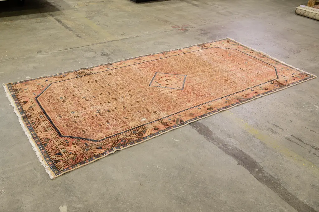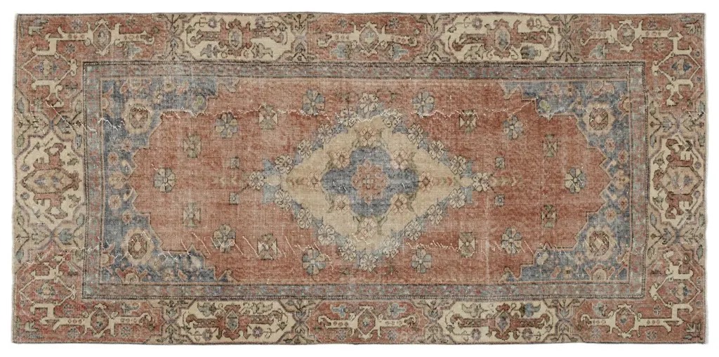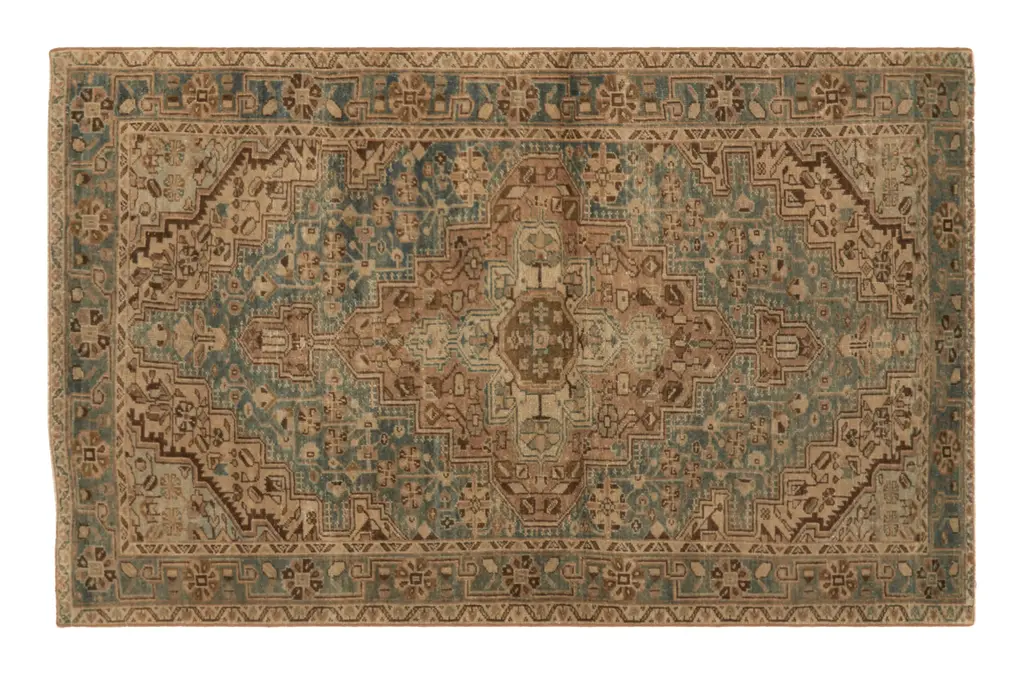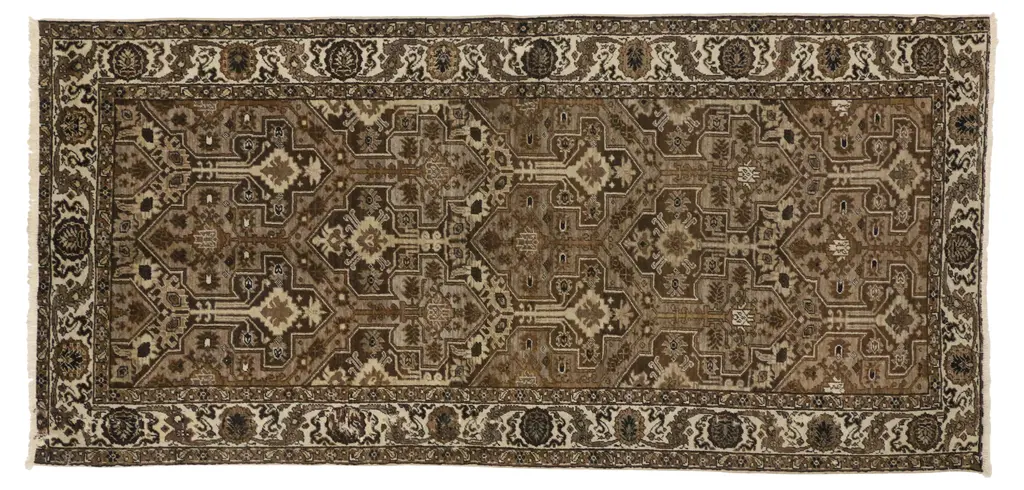 Beautiful Vintage All Over hand-knotted wool rug with a beige field. This rug has blue and brown accents all-over a geometric distressed design. This rug measures: 3'8" x 9'0".