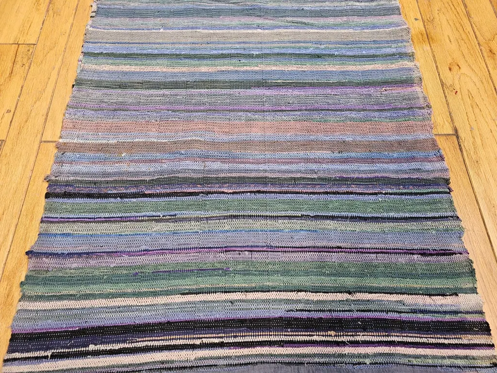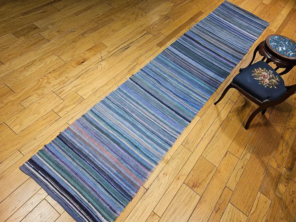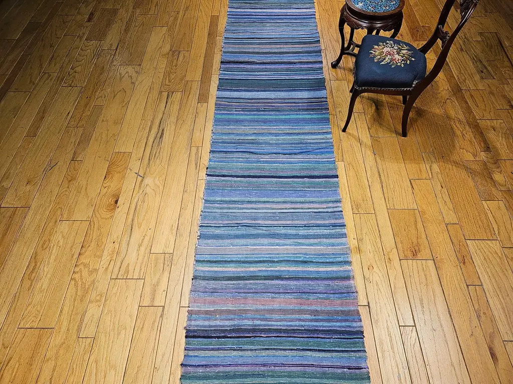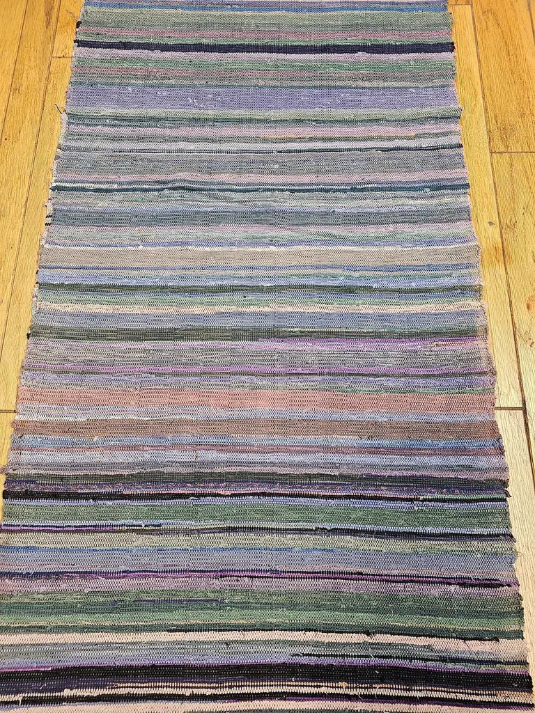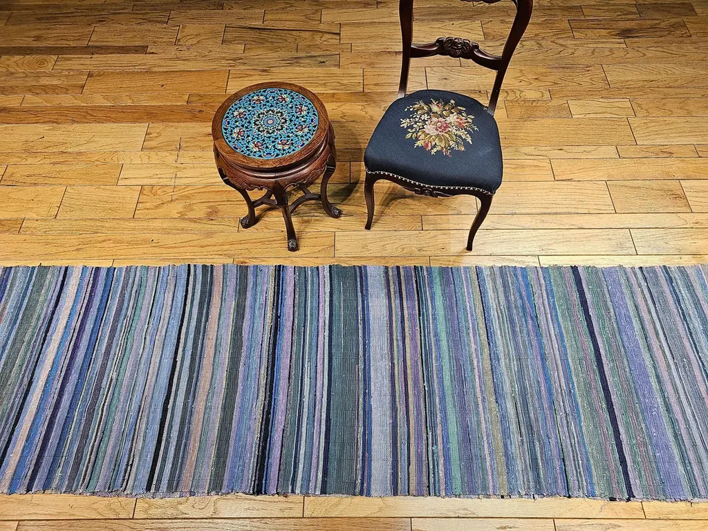 Vintage American Amish Rag Runner is in stripe design and has a very modern design format and can be incorporated into any modern interior design project. This Amish Rag Runner has a stripes pattern in sage green, red, chocolate, brown, and orange colors. The Amish community in Pennsylvania wove these runners mainly for their own use using the material that they had on hand. It is a beautiful example of a utilitarian work that had art and culture woven into it.The Amish and Mennonite communities in Pennsylvania wove these runners mainly for their own use using the material that they had on hand. It is a beautiful example of an upcycling and reuse of material that has utilitarian functions but is also a representation of the art and culture that is woven into it. This American Amish Rag Runner is in stripe design and has a very modern design format and can be incorporated into any modern interior design project. Dimensions: 2’ 8” x 26’ Date of Manufacture: 1st Quarter of the 1900sPlace of Origin: United StatesMaterial: Wool and CottonCondition: Wear Consistent with age and useThe Persian Knot Gallery, SKU: 1777Antique Amish Rag Runners, Amish Weaving, Amish Art, American Rag Runners, Antique Rugs, Antique Rugs, Vintage Oriental Rugs, Handwoven Rugs, Vintage Artisan Rugs, Antique Handmade Rugs, Vintage Pale Blue Rugs, Vintage Rag Rugs, Vintage Wool Rag Rugs, Antique American Rag Runners, Cottage Rugs, Rustic Rugs, Flat Woven Rugs, Rag Runner, Amish Runners, Sustainable Living, Eco-Friendly Rugs.