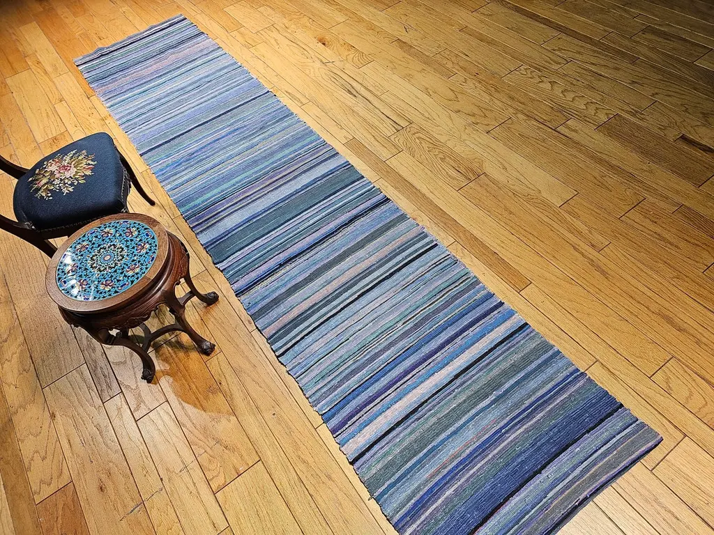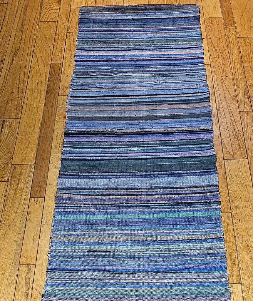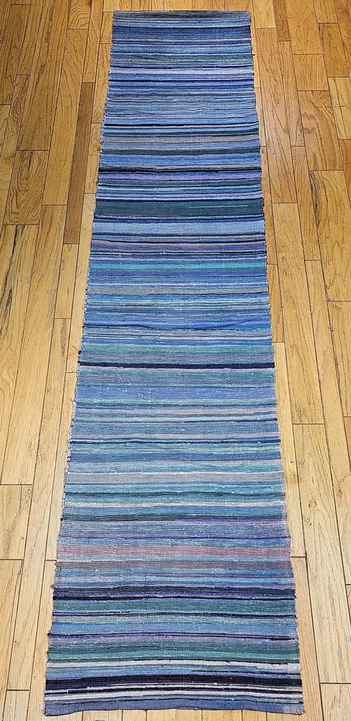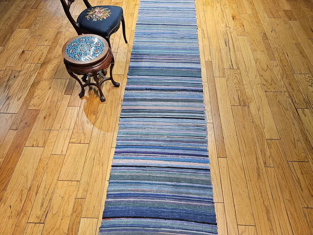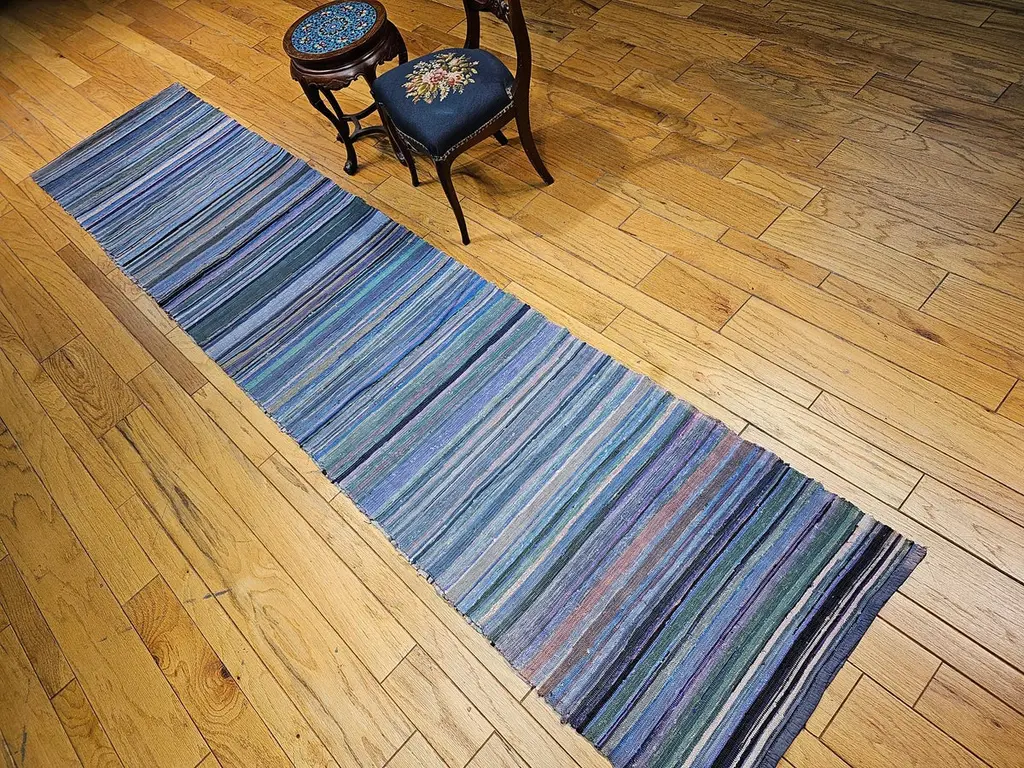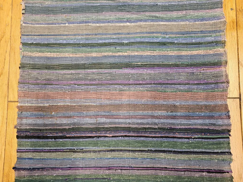 Vintage American Amish Rag Runner is in stripe design and has a very modern design format and can be incorporated into any modern interior design project. This Amish Rag Runner has a stripes pattern in sage green, red, chocolate, brown, and orange colors. The Amish community in Pennsylvania wove these runners mainly for their own use using the material that they had on hand. It is a beautiful example of a utilitarian work that had art and culture woven into it.The Amish and Mennonite communities in Pennsylvania wove these runners mainly for their own use using the material that they had on hand. It is a beautiful example of an upcycling and reuse of material that has utilitarian functions but is also a representation of the art and culture that is woven into it. This American Amish Rag Runner is in stripe design and has a very modern design format and can be incorporated into any modern interior design project. Dimensions: 2’ 8” x 26’ Date of Manufacture: 1st Quarter of the 1900sPlace of Origin: United StatesMaterial: Wool and CottonCondition: Wear Consistent with age and useThe Persian Knot Gallery, SKU: 1777Antique Amish Rag Runners, Amish Weaving, Amish Art, American Rag Runners, Antique Rugs, Antique Rugs, Vintage Oriental Rugs, Handwoven Rugs, Vintage Artisan Rugs, Antique Handmade Rugs, Vintage Pale Blue Rugs, Vintage Rag Rugs, Vintage Wool Rag Rugs, Antique American Rag Runners, Cottage Rugs, Rustic Rugs, Flat Woven Rugs, Rag Runner, Amish Runners, Sustainable Living, Eco-Friendly Rugs.