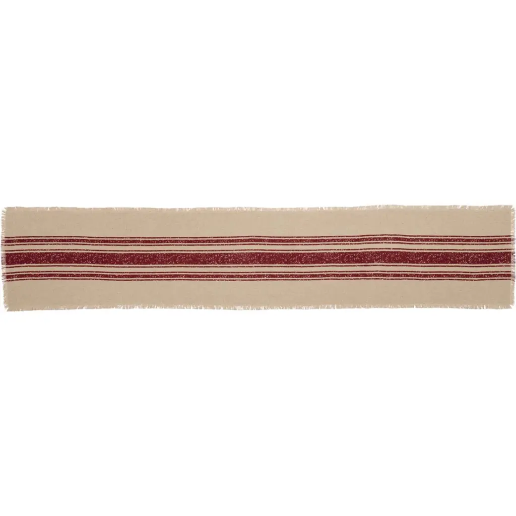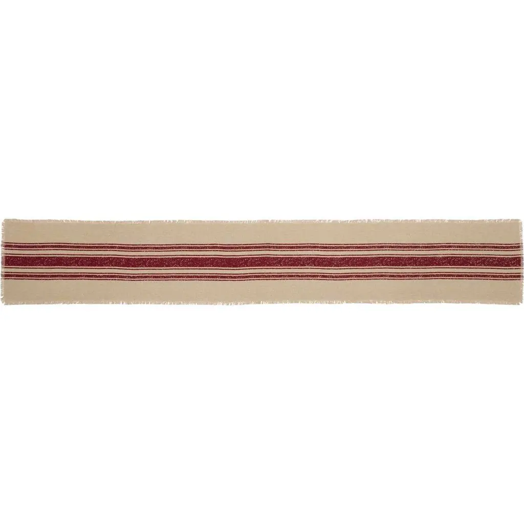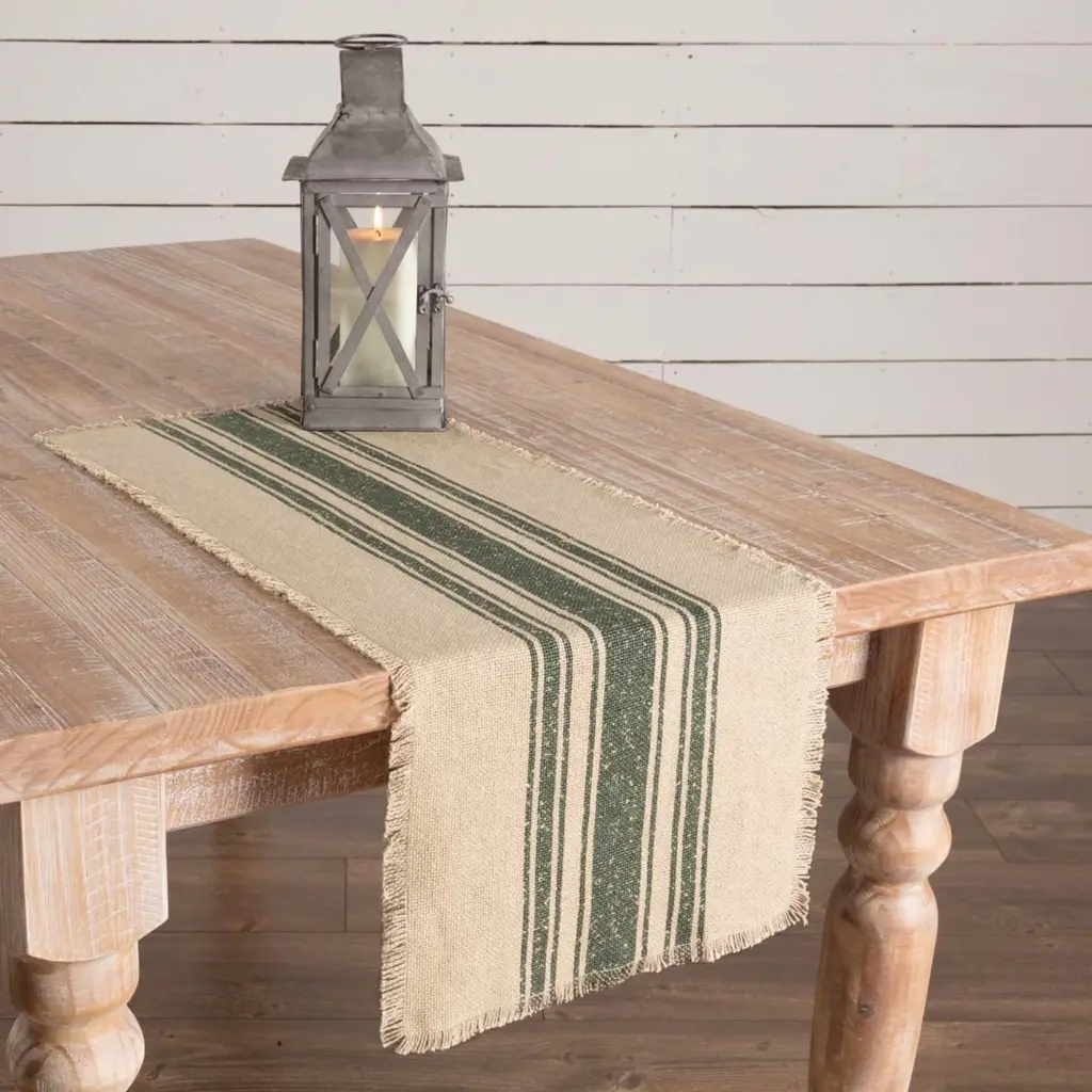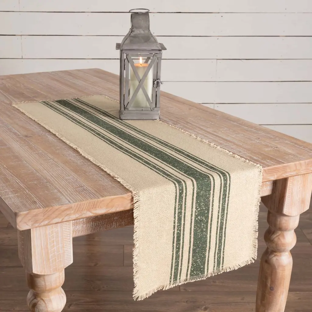 We took a vintage ticking stripe, replicating the look found in old grain mill sacks. The Vintage Burlap Stripe Runner has been made with distressed stenciling to give its antique creme burlap a truly heritage look. Finished with fringed edges. 100% cotton, reverses to solid antique creme burlap.Features PREMIUM CONSTRUCTION: with over two decades experience crafting goods for American homes, our items are built to last for years to come.HOLIDAY DECOR: festive style to add cheer to any home this year.QUALITY MATERIAL: made with durable 100% cotton for a proper look and feel.Soft cotton is woven to create a vintage look antique creme burlapStenciled pine green grainsack stripe running horizontally down centerFringed edgeSingle fabric: Machine stitchedSpecifications Material: 100% CottonManufacturer Country: IndiaCare: Machine Wash, Line Dry, Iron safeSizes Available 13" x 36" - 0.3 lb13" x 48" - 0.3 lb13" x 72" - 0.4 lbColors Available Green - Antique Creme, Pine GreenRed - Antique Creme, Bright Red* Due to the loose weave nature of the fabric, minor variances will occur. Sizes are approximate.
