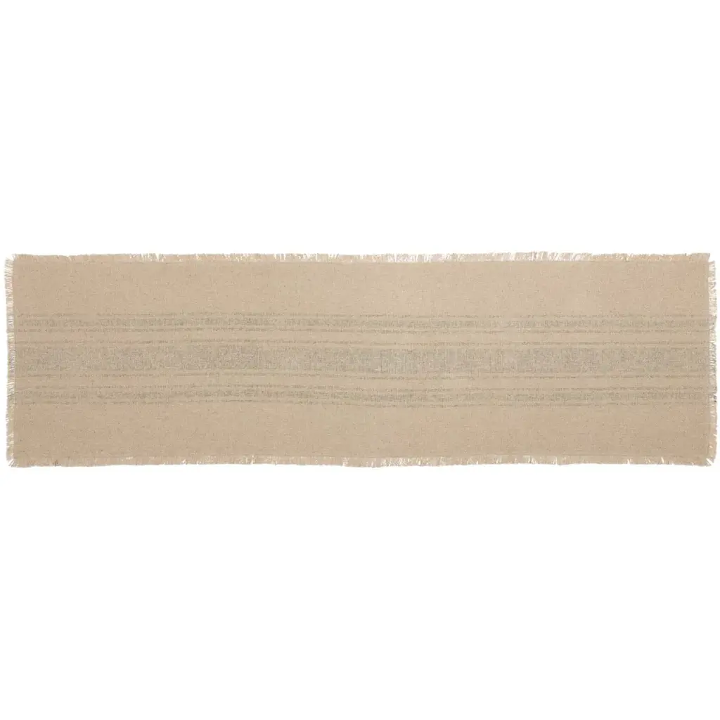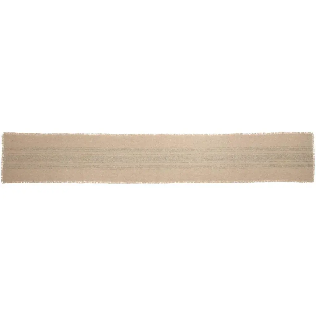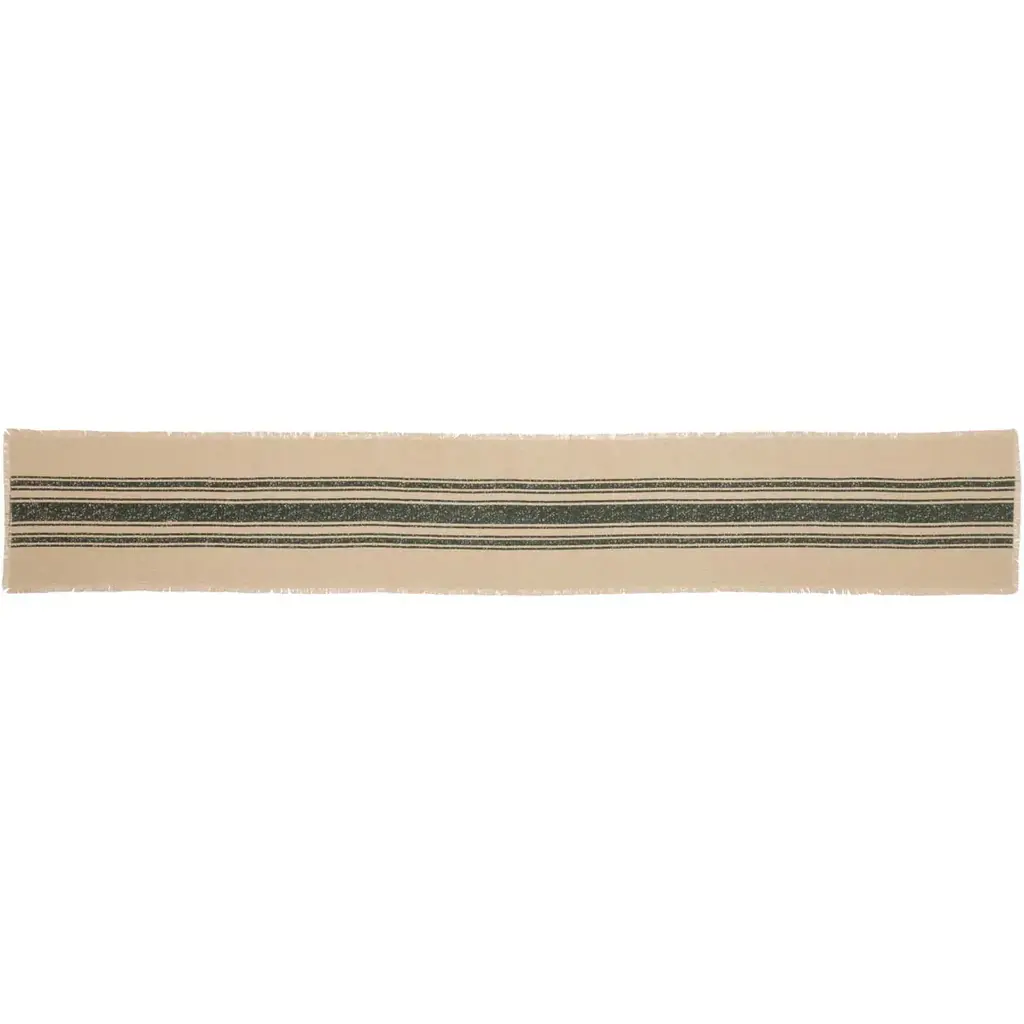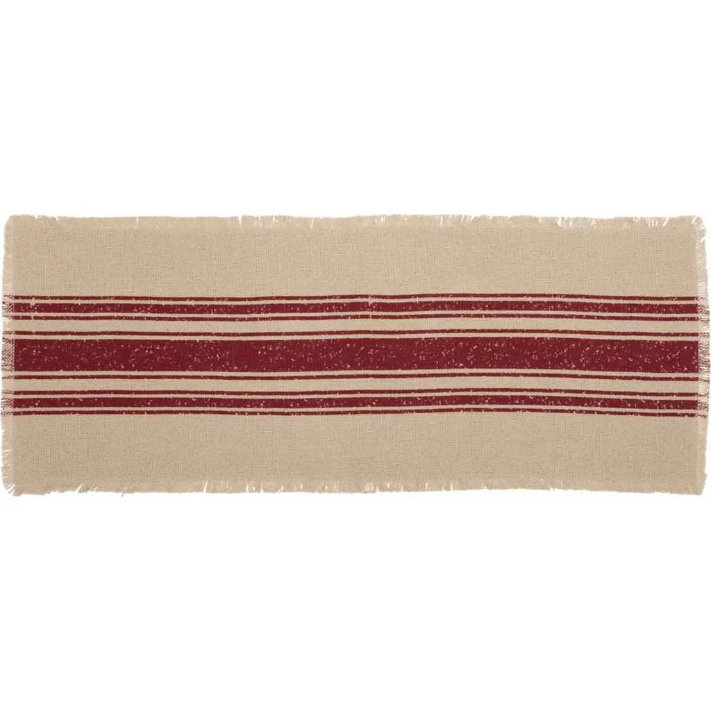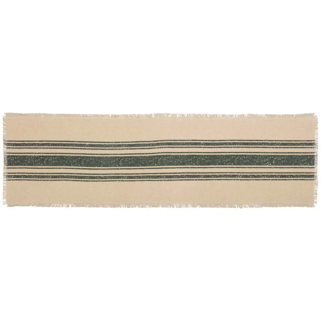 We took a vintage ticking stripe, replicating the look found in old grain mill sacks. The Vintage Burlap Stripe Runner has been made with distressed stenciling to give its antique creme burlap a truly heritage look. Finished with fringed edges. 100% cotton, reverses to solid antique creme burlap.Features PREMIUM CONSTRUCTION: with over two decades experience crafting goods for American homes, our items are built to last for years to come.HOLIDAY DECOR: festive style to add cheer to any home this year.QUALITY MATERIAL: made with durable 100% cotton for a proper look and feel.Soft cotton is woven to create a vintage look antique creme burlapStenciled pine green grainsack stripe running horizontally down centerFringed edgeSingle fabric: Machine stitchedSpecifications Material: 100% CottonManufacturer Country: IndiaCare: Machine Wash, Line Dry, Iron safeSizes Available 13" x 36" - 0.3 lb13" x 48" - 0.3 lb13" x 72" - 0.4 lbColors Available Green - Antique Creme, Pine GreenRed - Antique Creme, Bright Red* Due to the loose weave nature of the fabric, minor variances will occur. Sizes are approximate.