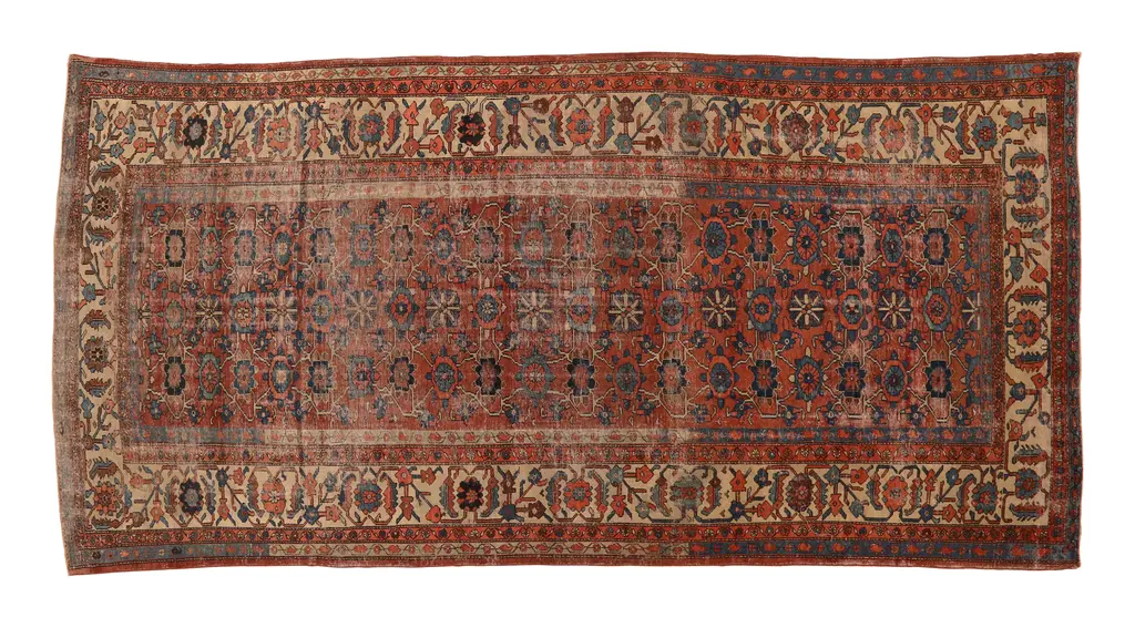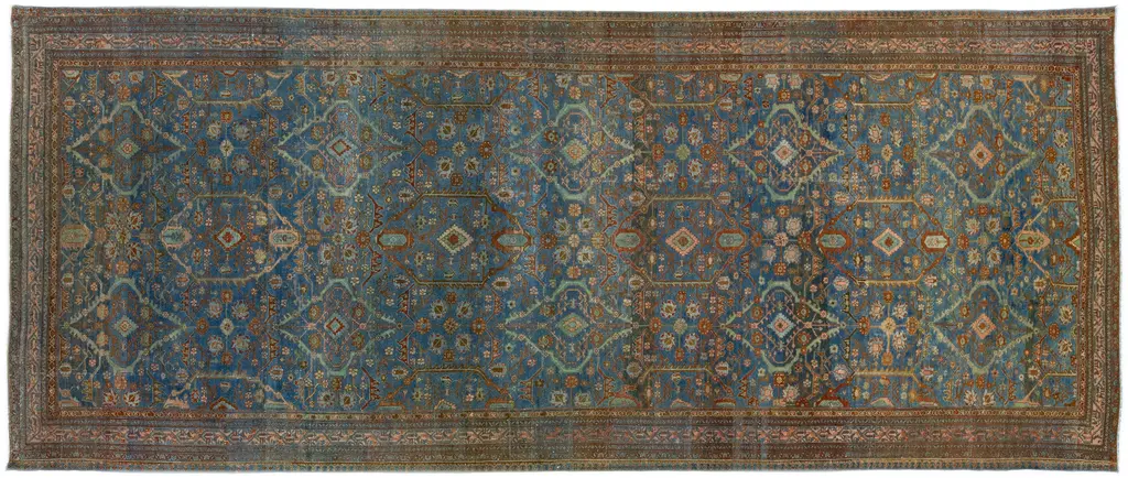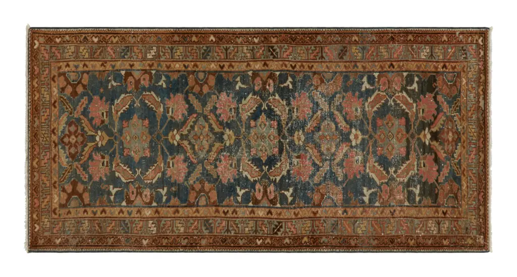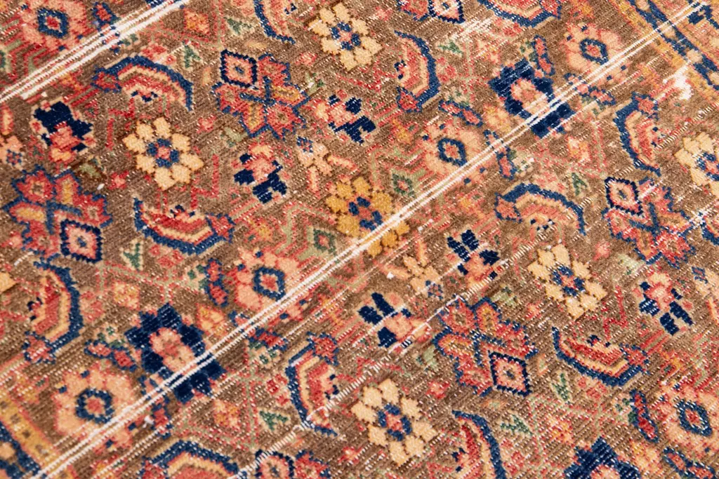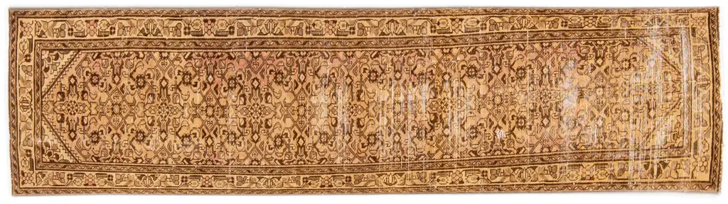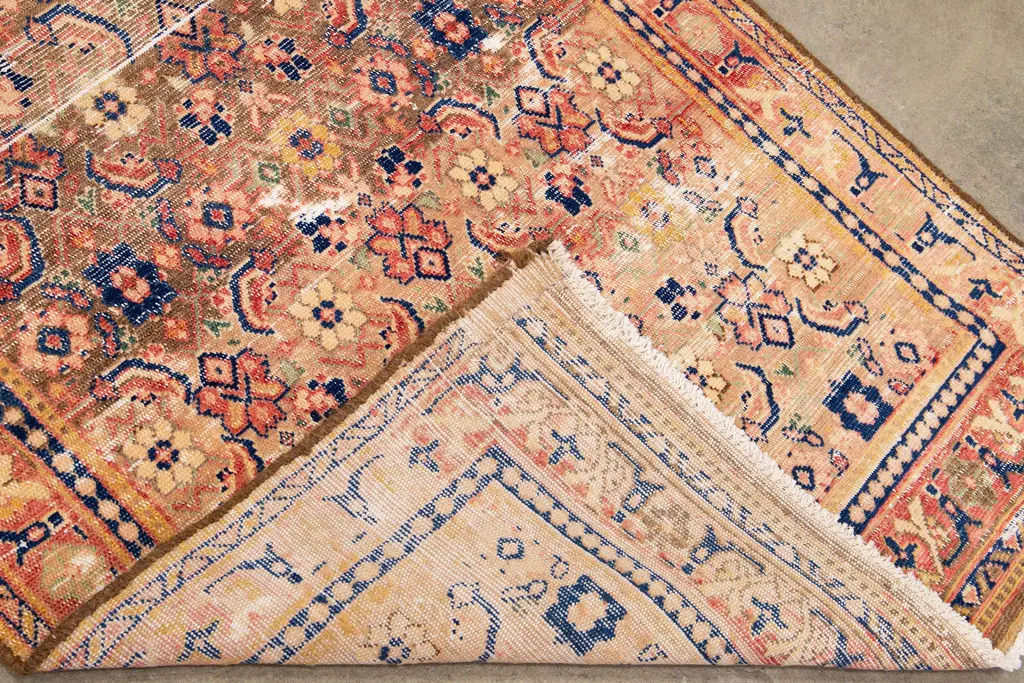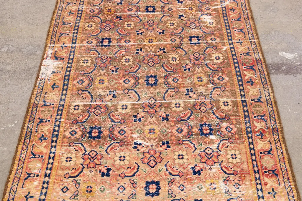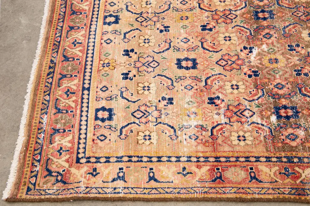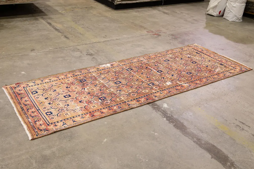 Beautiful Vintage Floral hand-knotted wool runner with a peach field. This runner has blue, pink and tan accents all-over a geometric distressed design. This rug measures: 3'2" x 9'7".