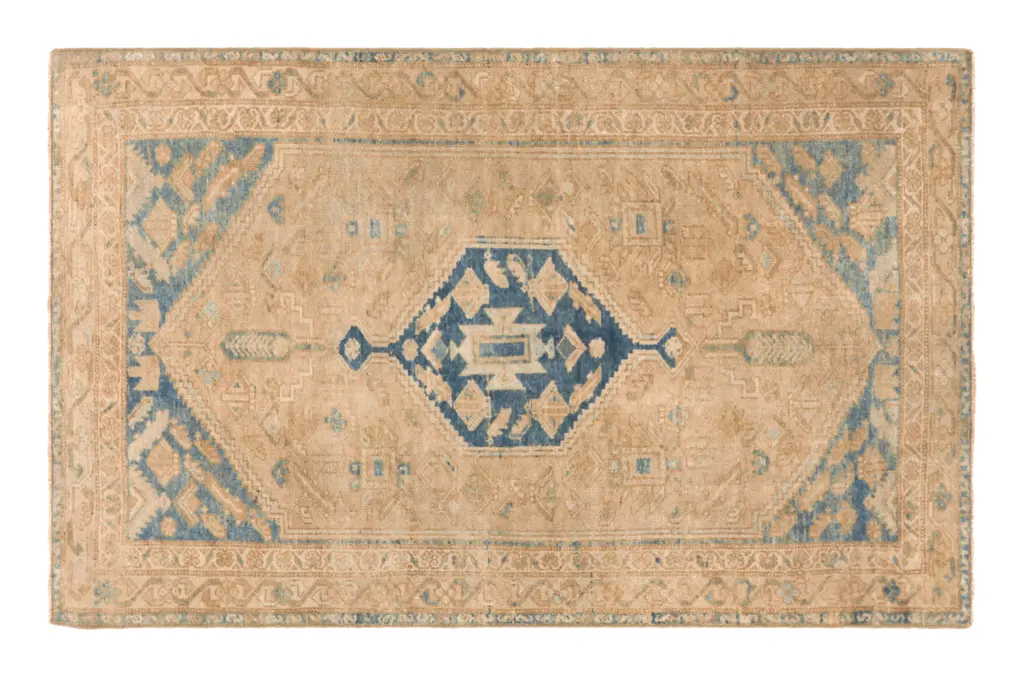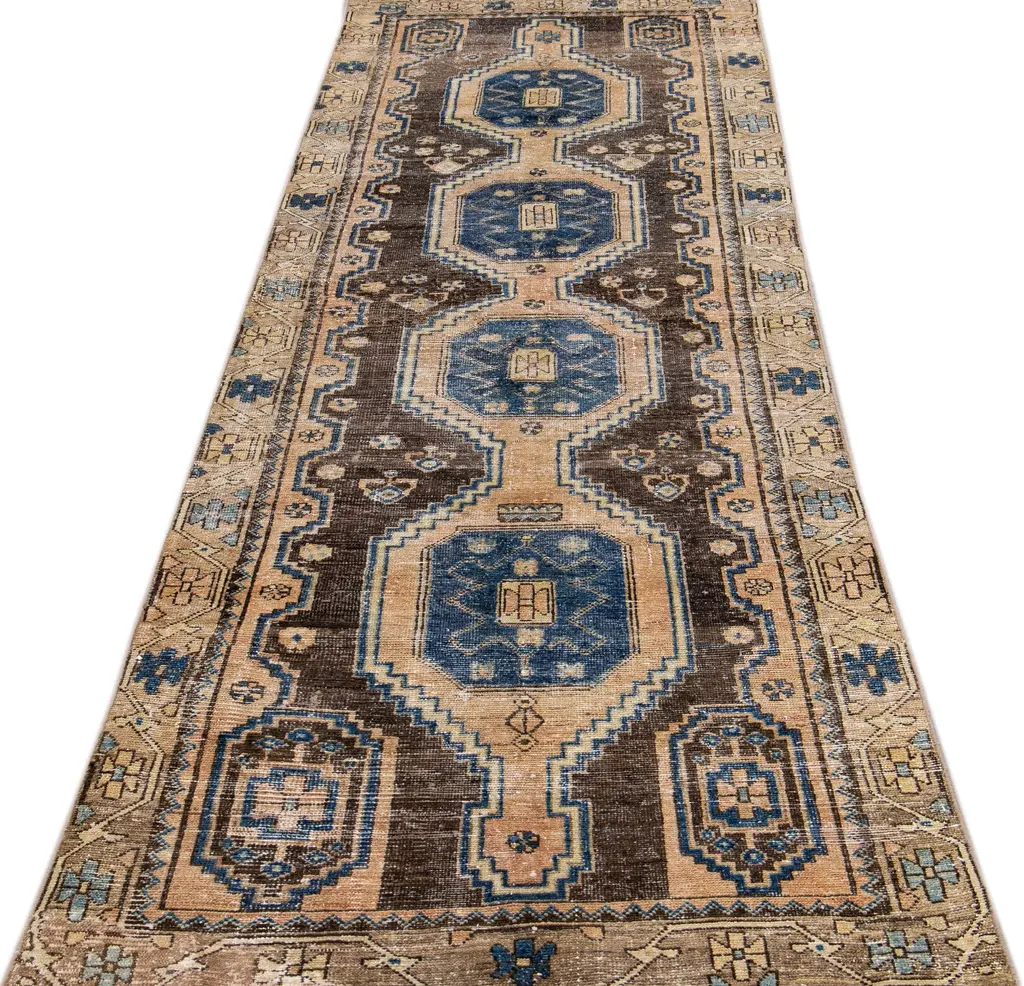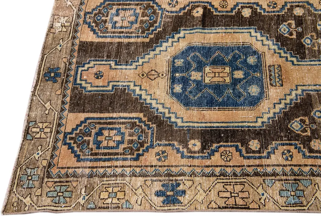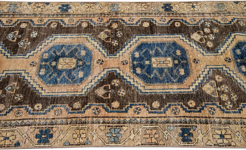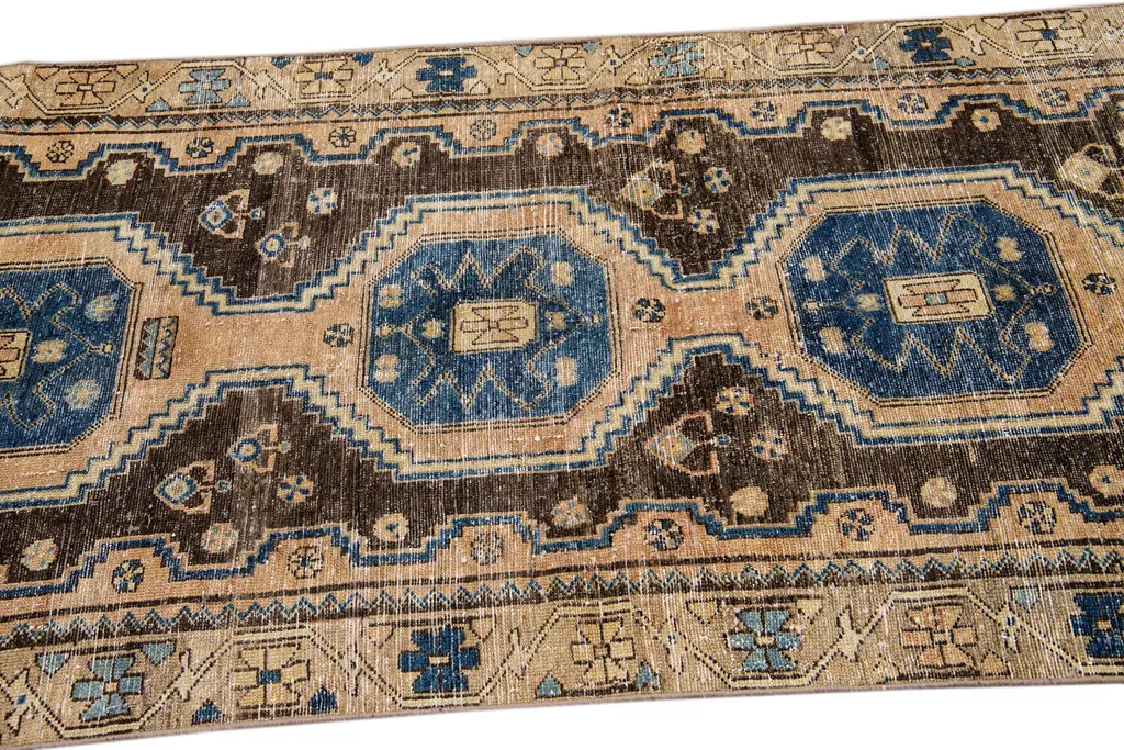 Beautiful Vintage Geometric hand-knotted wool runner with a brown field. This runner has blue, pink and tan accents all-over a geometric distressed design. This rug measures: 3'2" x 9'2". Our Rugs are professionally cleaned before shipping.