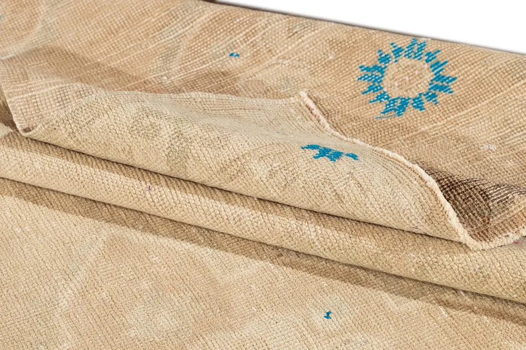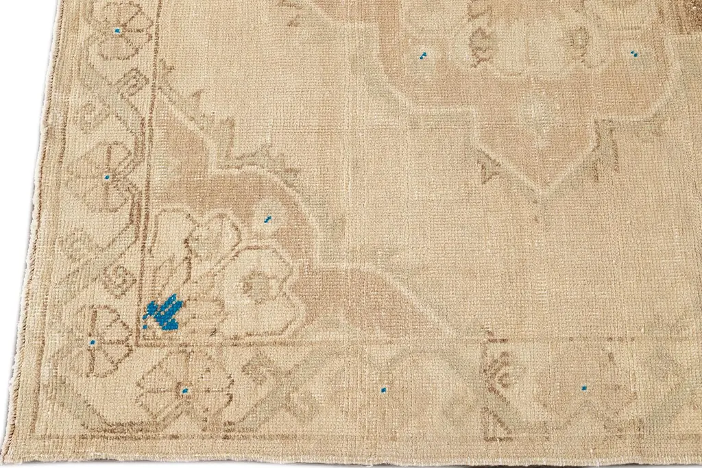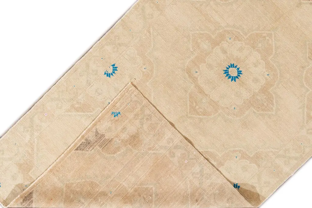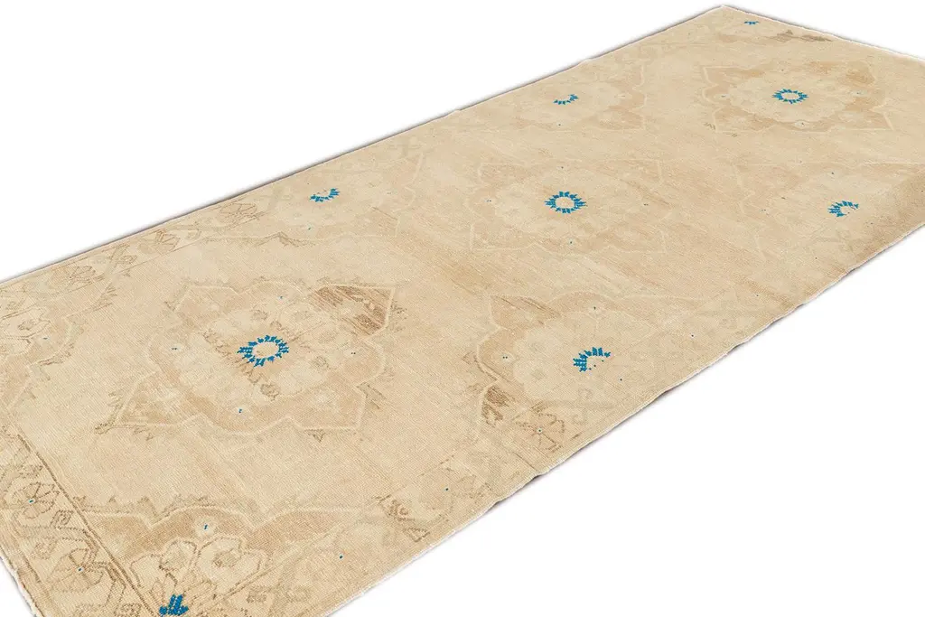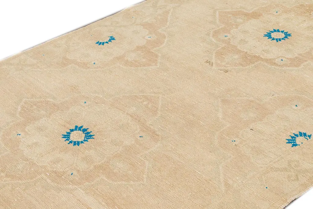 Beautiful Turkish Runner Rug, hand-knotted wool with a beige field and an all over geometric design including blue accents. This rug measures 4' 9" x 10' 8". Our Rugs are professionally cleaned before shipping.