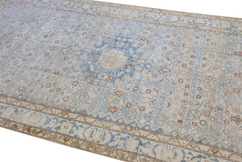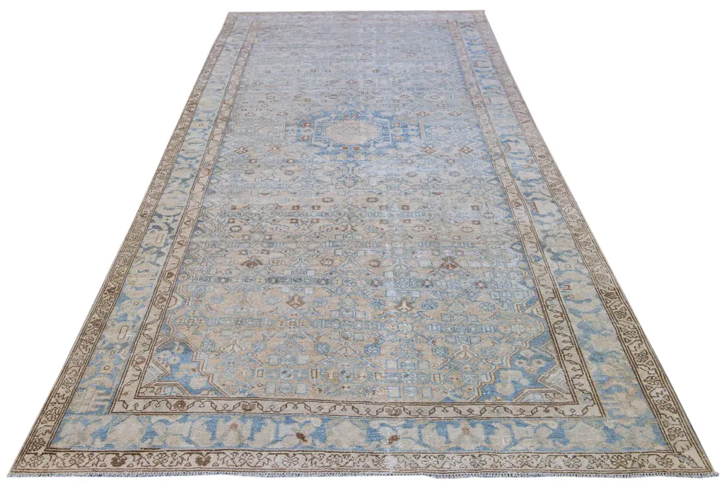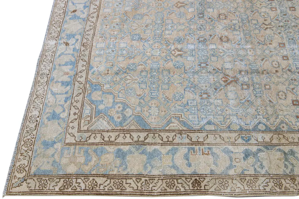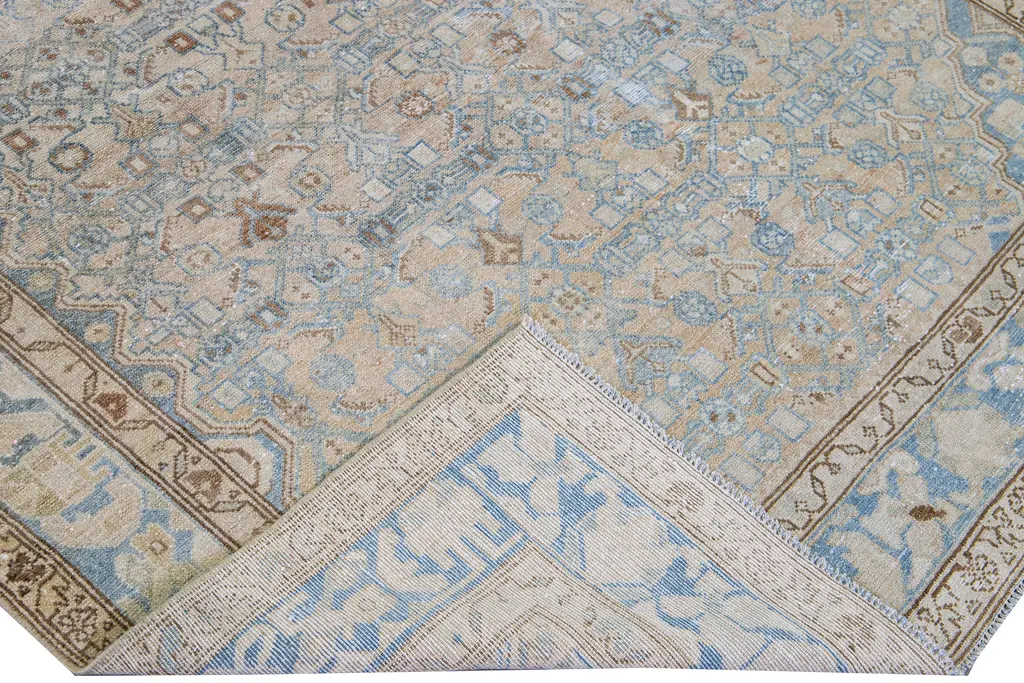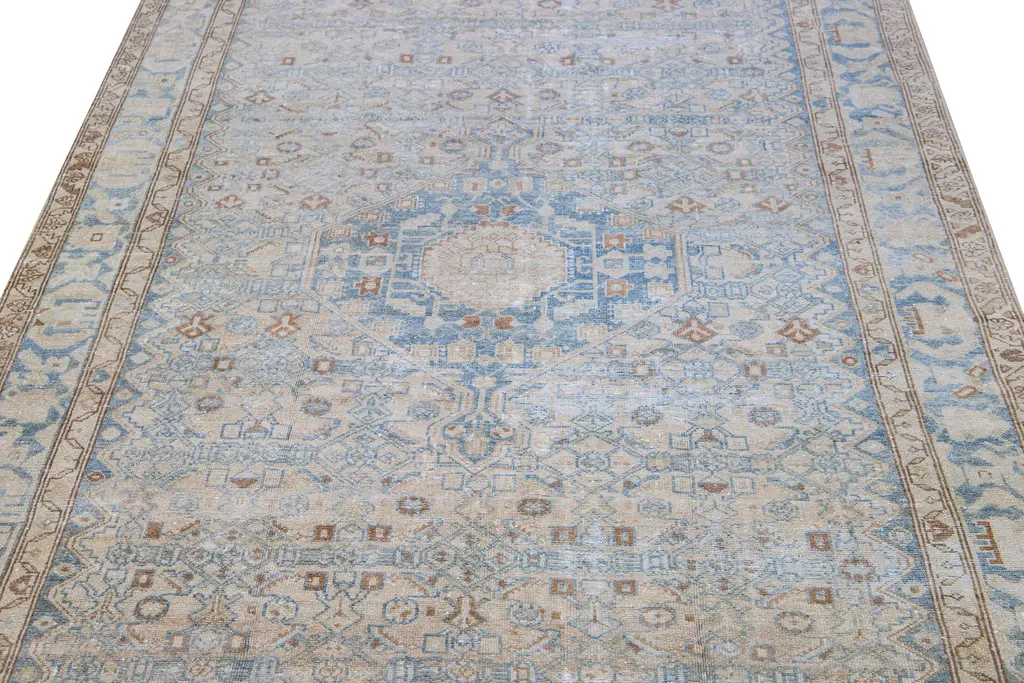 Beautiful vintage Malayer hand-knotted wool runner with a blue field. This Malayer rug has a beige frame and accents of brown in an all-over gorgeous geometric medallion floral pattern design.This rug measures: 4'10" x 10'5".