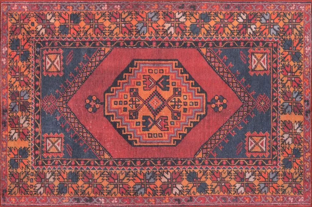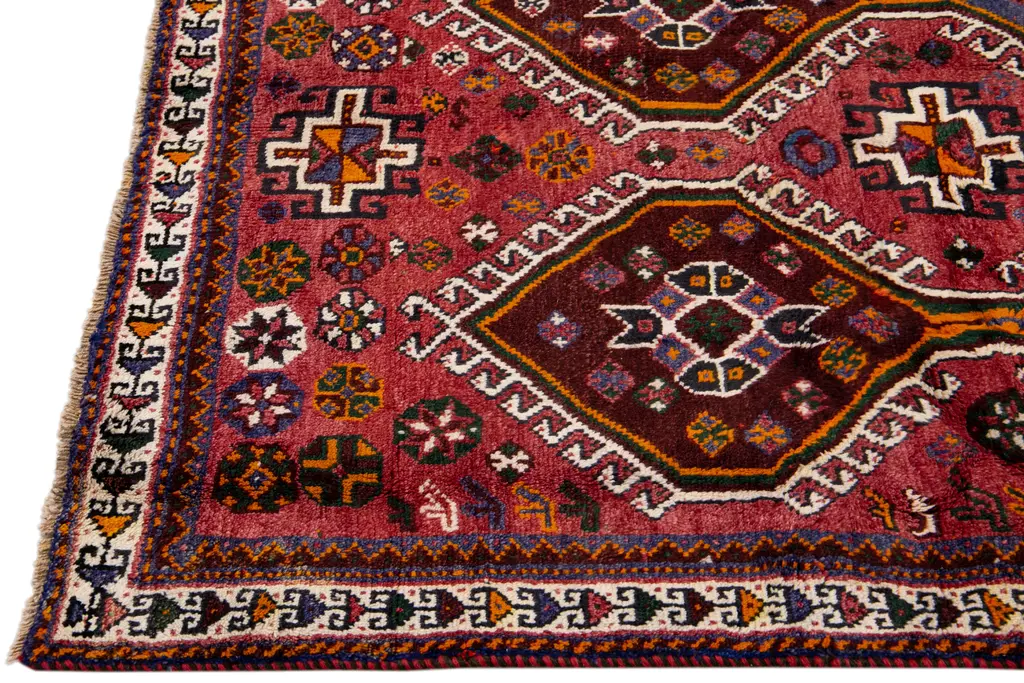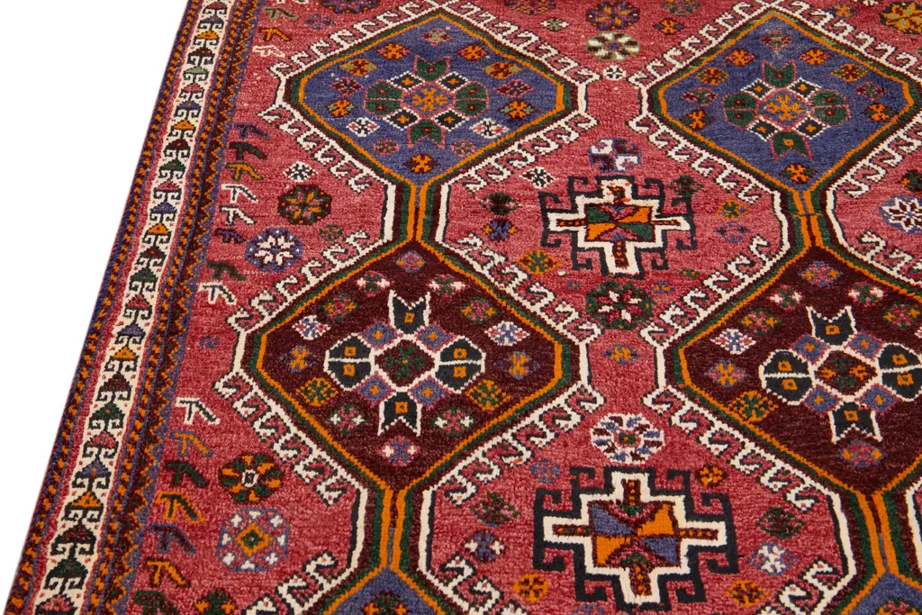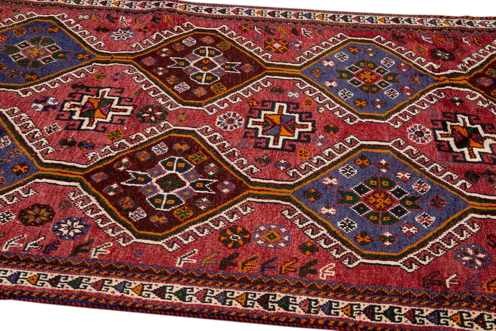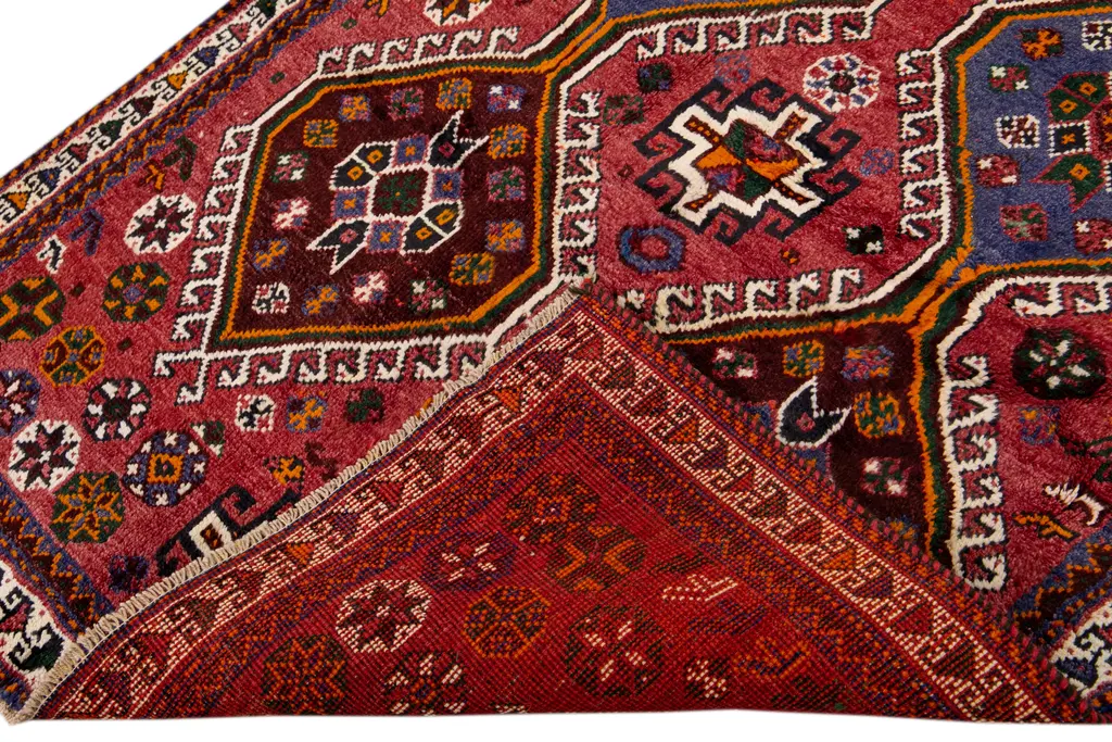 Beautiful Antique Persian Shiraz Handmade Wool rug with an all-over red field. This piece has multicolor accents in a gorgeous all-over geometric tribal design. This rug measures: 3'10" x 8'9".