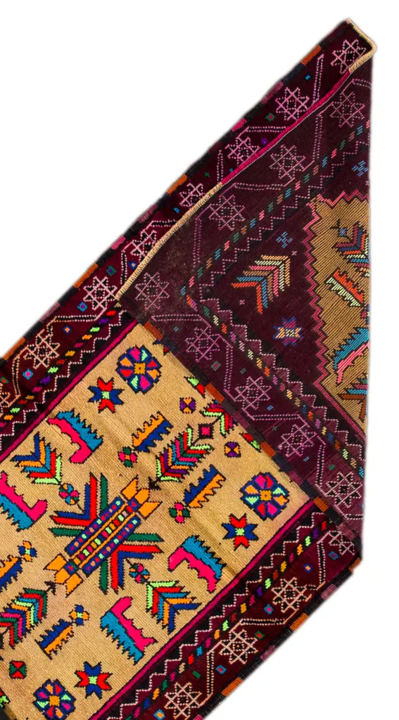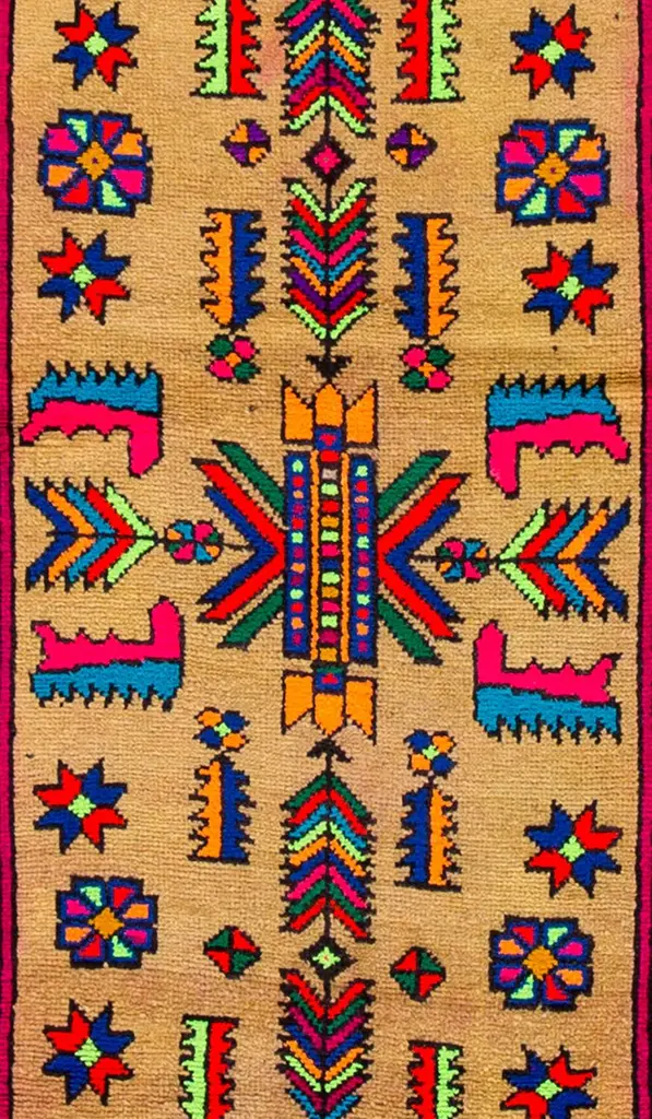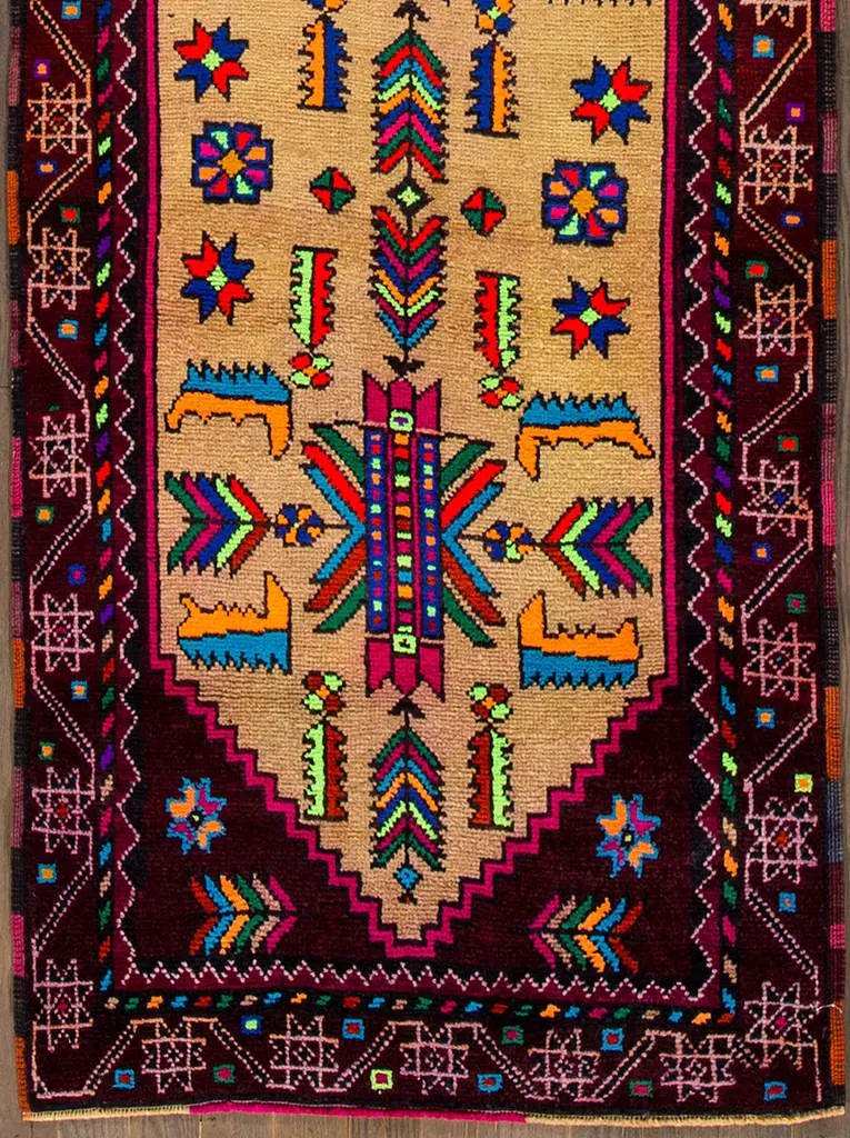 Vintage 1970s Turkish Anatolian runner rug. This piece has a light tan/beige field with a bright multicolored tribal design. This rug measures: 3' x 8'02". Our Rugs are professionally cleaned before shipping.