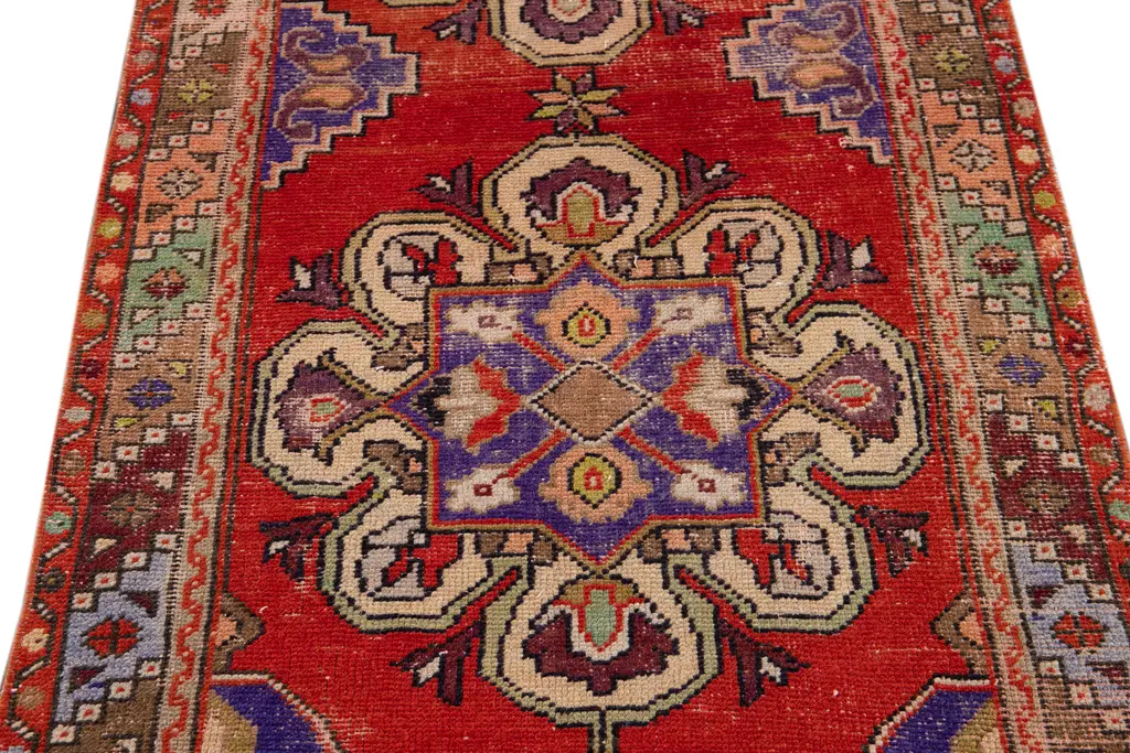 Beautiful antique runner rug, with a red field, ivory and purple accents in Classic multi medallion design. This rug measures 3' 2" x 8' 4". Circa 1930. Our Rugs are professionally cleaned before shipping.