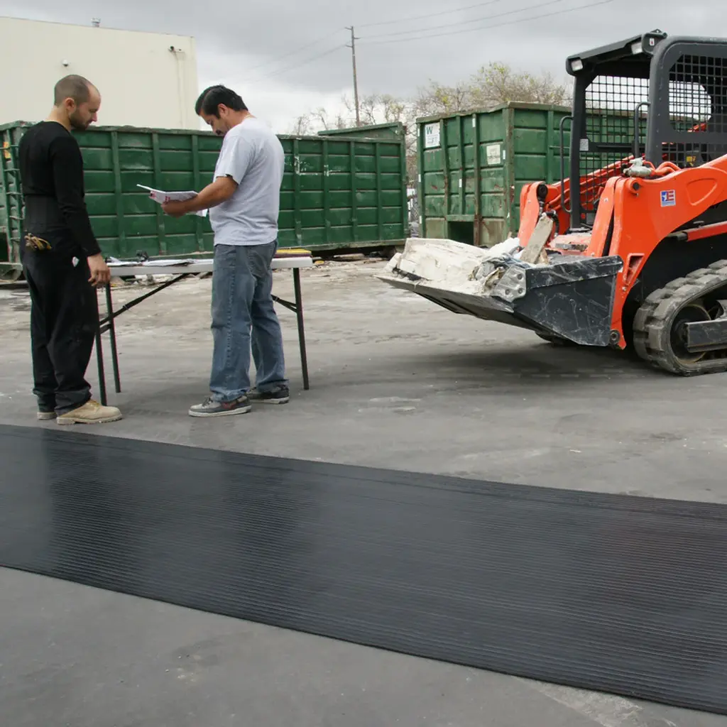 Rubber-Cal''s "Wide Rib" corrugated rubber flooring mat is a protective flooring that is available in a thickness of 1/8-inch and is offered at widths of 3-feet. This ribbed mat offers great traction with its wider grooves and protrusions. The surface pattern of this corrugated rubber allows for more trapping of debris and liquids as a result of spills or adverse weather. The wide grooves in this rubber flooring mat are far more comfortable to walk on than other corrugated rubber floors. It can withstand heavy foot traffic while maintaining comfort and stability of the consumers. These traction mats work especially well in applications that may be temporary. They can be utilized as a kitchen runner, horse trailer mats, or used for marine flooring. The ribbed mat can be installed on wood or concrete floors well, due to its fabric-based finish that adds subsurface traction, allowing the runners to remain secure to the floor. Using a two-sided carpet tape also allows for a more permanent installation. This product also serves as a protective flooring since it is made from virgin SBR, which creates a completely watertight surface. The material offers a moderate chemical resistance and it can easily be cleaned with most common household cleaners, though highly caustic solutions such as bleach are not recommended on the rubber surface. Since the corrugated rubber on these traction mats run lengthwise, foot traffic is inherently directed while maintaining a safe pathway for consumers. Use this ribbed mat in those slick and wet areas that may cause you headaches and protect your guests or employees!