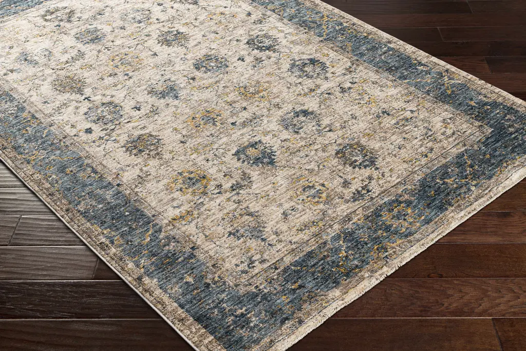 Collection: Wilkie Colors: Mustard, Teal, Tan, PaleBlue, MediumGray, LightGray Construction: Machine Woven Material: 100% Polyester Pile: Medium Pile Pile Height: 0.35" Styles: Traditional Made In: Turkey Thickness: 0.43" Fringe Length: 0.6" Price Range: $$$$$ (Affordable)