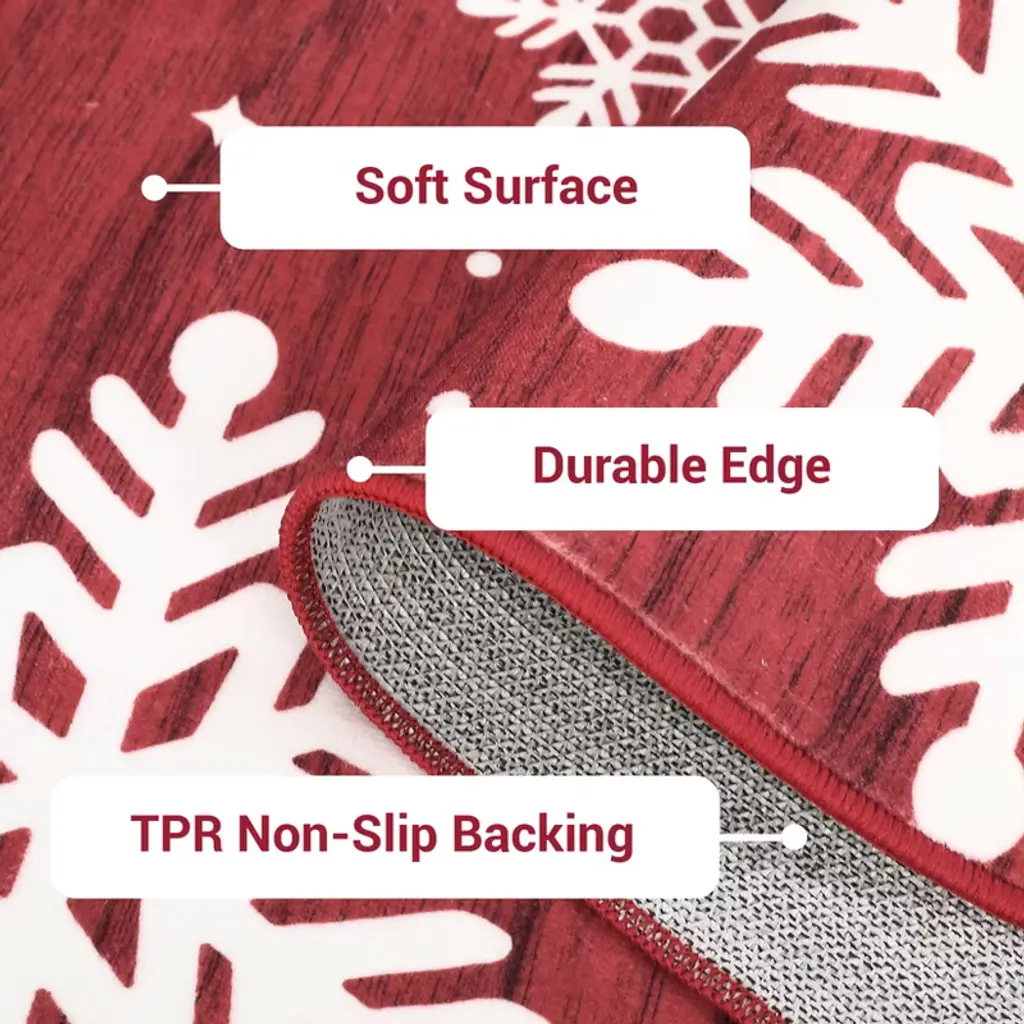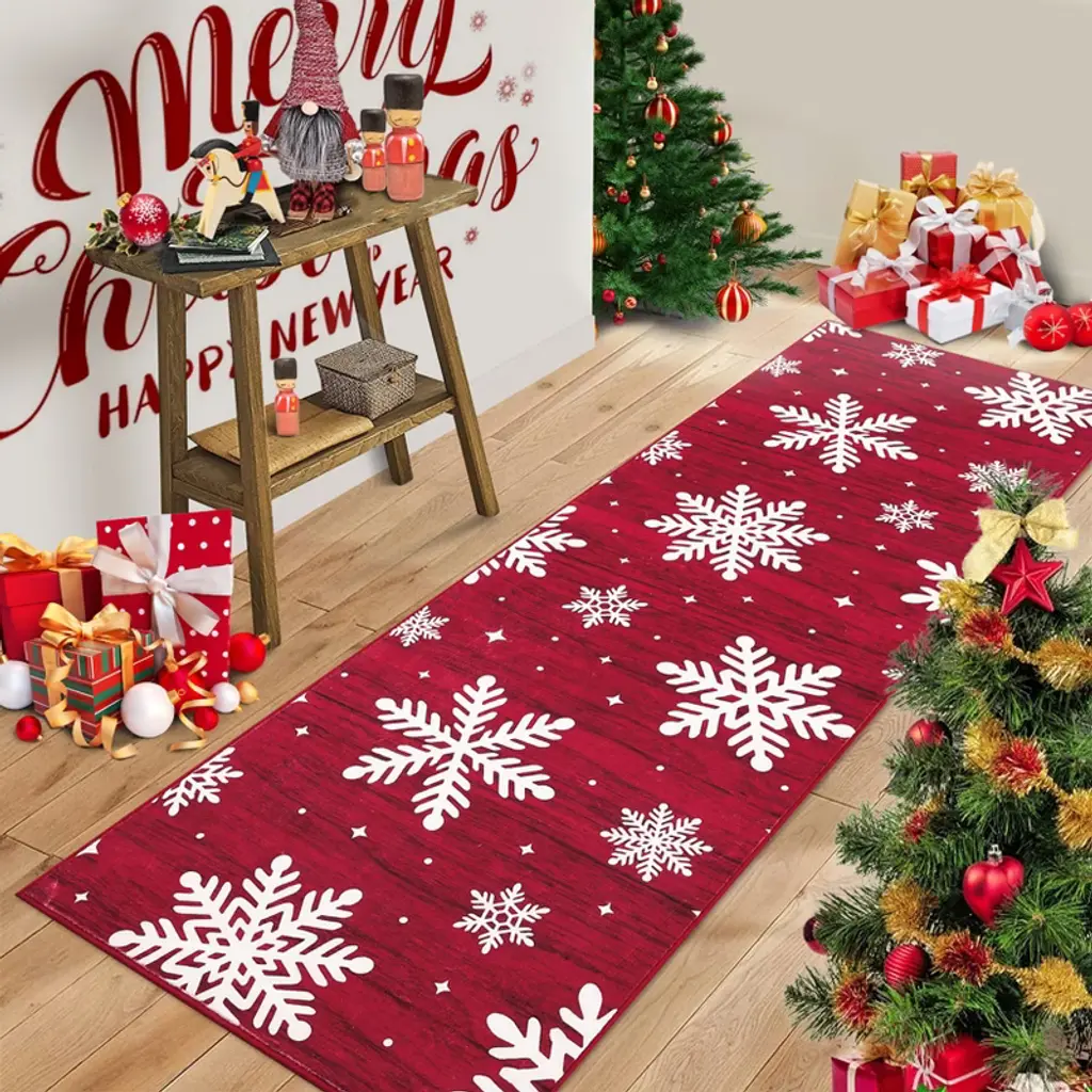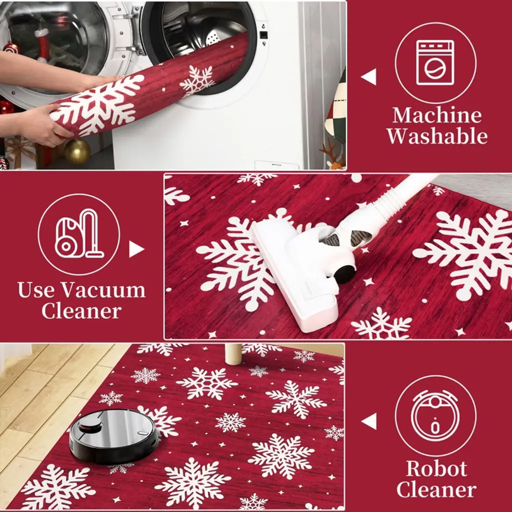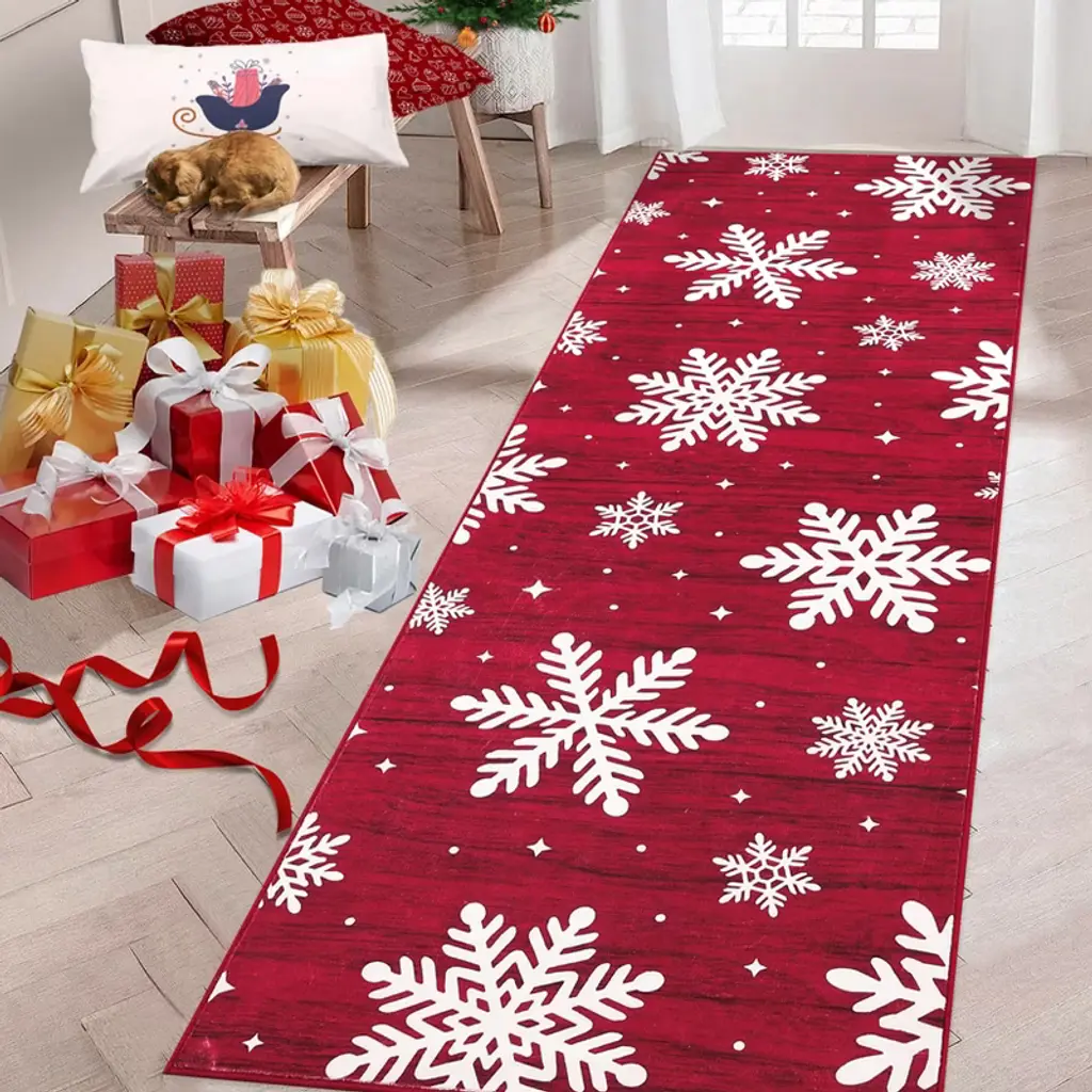 Transform your home with our Christmas area rug, featuring a charming snowflake design and vibrant red hues. Designed with a non-slip TPR backing, it ensures safety and stability in high-traffic areas like entryways, hallways, and kitchens. Perfect for adding a festive touch while keeping your space warm and inviting. Ideal for enhancing your Christmas decor!More Features:Sturdy stitches ensure lasting use.It is easy to fold, unfold, and store this item.Outstanding shock absorption and softness underfoot.The Stain-resistant design make it perfect for families with children or pets.This non-shedding feature ensures a clean and hassle-free maintenance experience.Specification:Muti-sizes Available(Ft): 2x3/2x6/2x8/3x5/4x6/5x7/6x9/8x10/9x12 Material: 100% polyester & TPE backingCare instructions:For carpet cleaning, small-sized carpets can be machine washed.For large-sized carpets, we recommend regular vacuuming along the direction of the fibers for easy cleaning and to prevent tangling.Notes:1. Temporary creases may occur upon rug arrival, allow time for creases to flatten.2. Rug’s color may vary slightly due to monitor differences.3. Rotate your furniture periodically to prevent uneven wear and indentations on the carpet.4. If there is any problem with the product, please contact us and we will solve it for you as soon as possible.