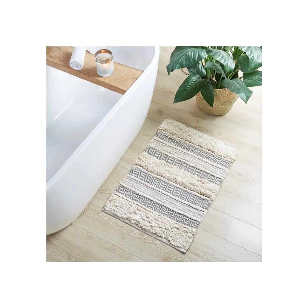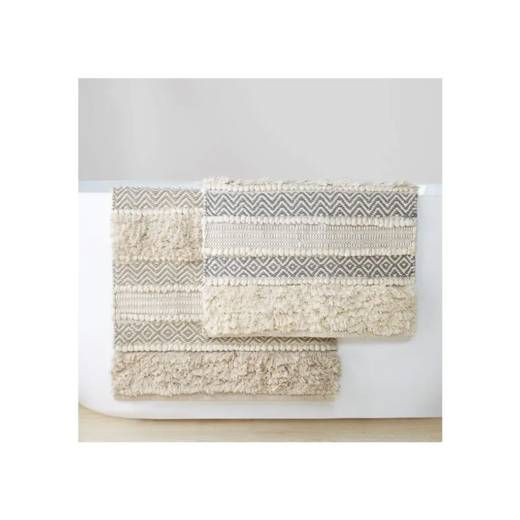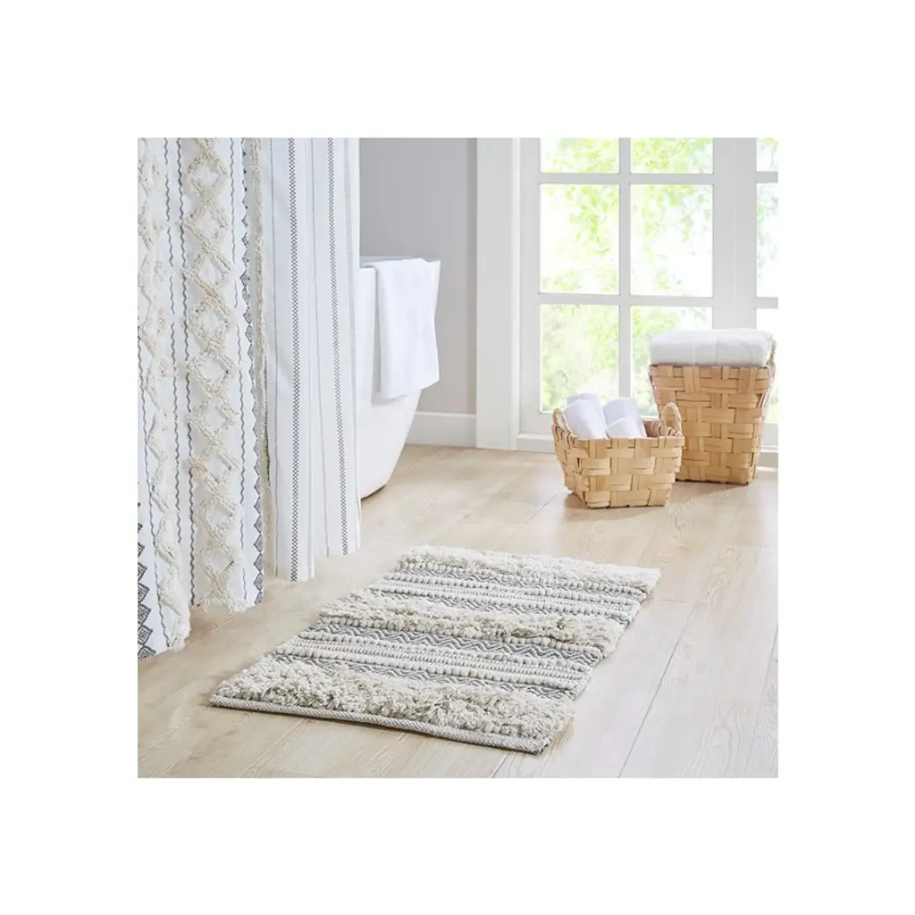 Description Globally inspired with an artisan touch, the INK+IVY Asher Woven Texture Stripe Bath Rug is the perfect update to refresh your bathroom decor. This hand-woven bath rug features a combination of beautiful patterns, shaggy textures, and fabric techniques in a vertical stripe layout, for a stylish Boho look and feel. The shaggy woven texture is featured in a solid light light natural hue, which alternates between a grey geo pattern and fabric manipulation technique to create soft dimension and a unique design. Machine washable for easy care; this rug is also finished with a Non-skid resistance latex backing to help keep the rug in place throughout the day. Complete the look of this New INK+IVY bath rug collection with any of our coordinating INK+IVY Shower Curtain, Bedding, and Window Collections, available and sold separately. Product Details 22x58in 1 Bath Runner:22inW x 58inL Material 89% cotton 6% rayon 4% polyester and 1% acrylic bathrug with hot melt backing 180gsf