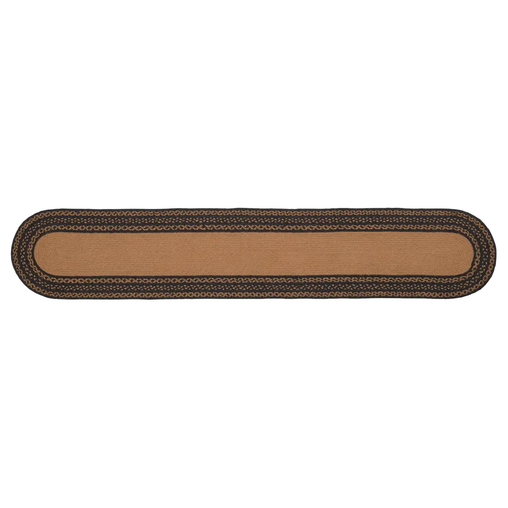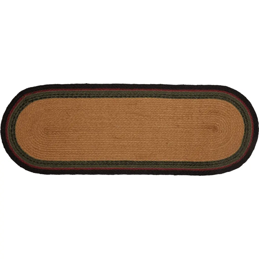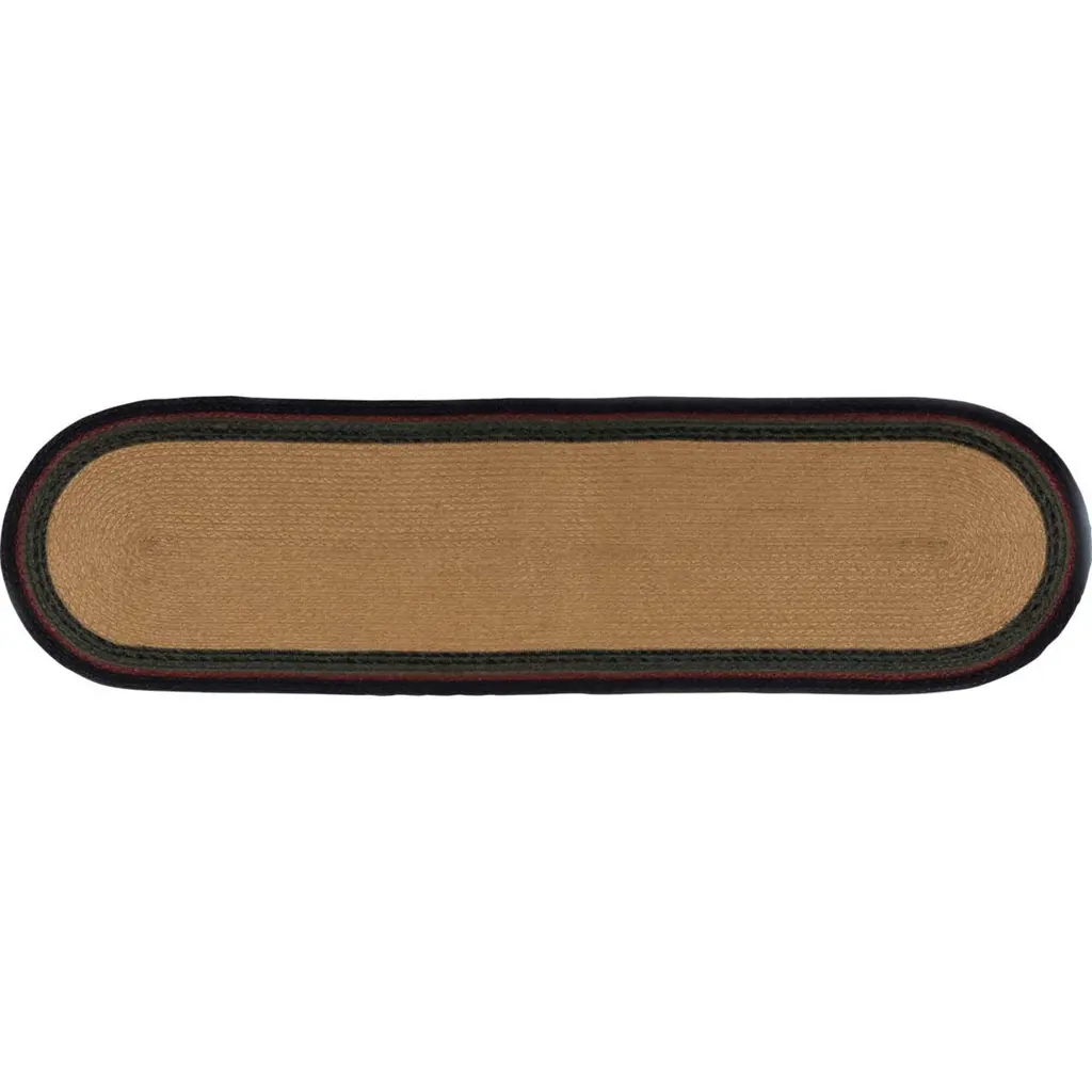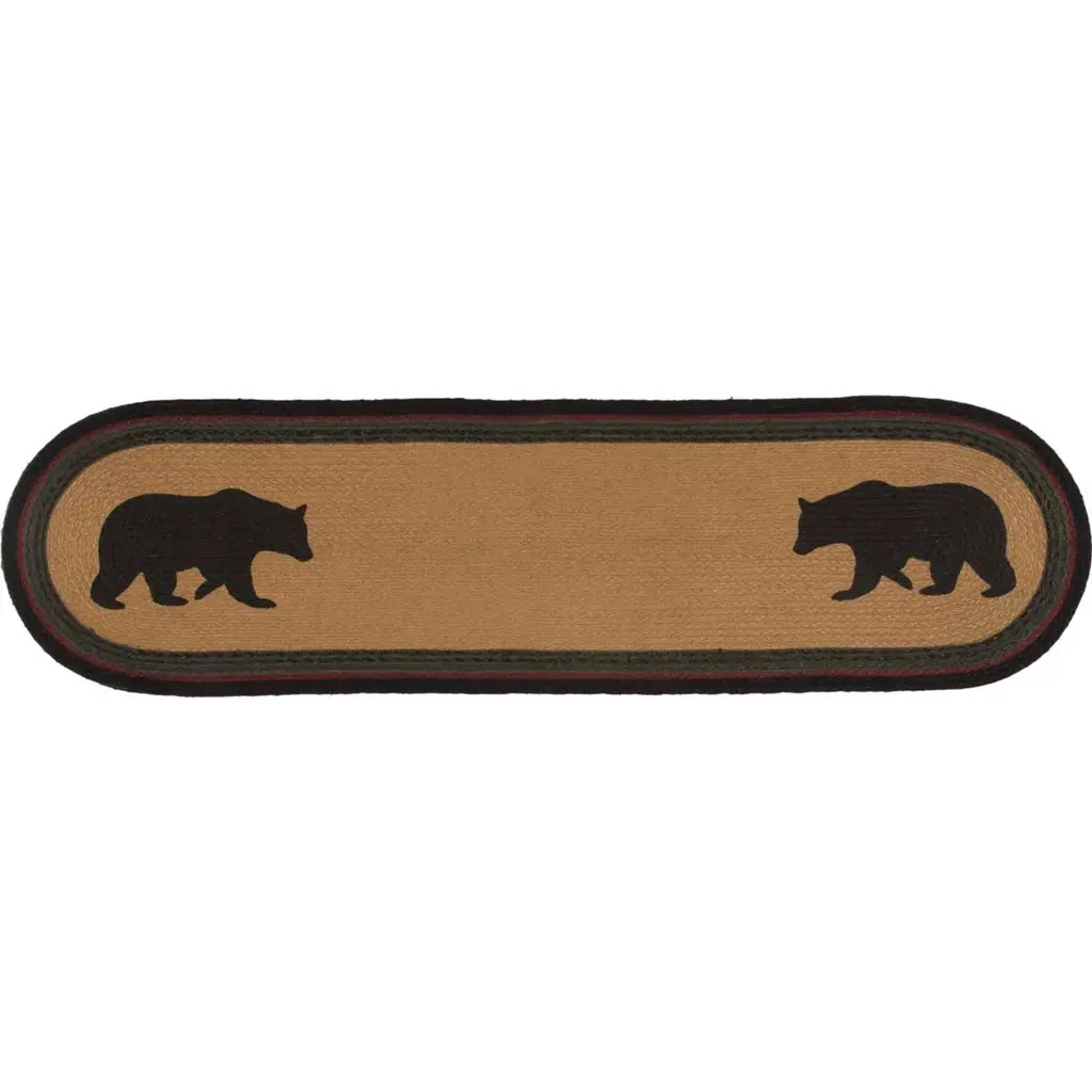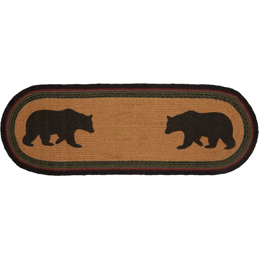 Answer the call of the wild with the rugged but stylish Wyatt Bear Jute Runner Oval. An icon of American timberlands, two bears are stenciled into the jute over solid dark tan. Concentric braids of black, crimson, and army green jute dominate this gorgeous runner.Features PREMIUM CONSTRUCTION: with over two decades experience crafting goods for American homes, our items are built to last for years to come.RUSTIC DECOR: cabin style to fit any lodge, cabin, lake house, or retreat.QUALITY MATERIAL: made with durable 100% jute for a proper look and feel.Concentric braids of black, crimson, and army green jute with solid dark tan centerBlack bear stenciled on each endMotifs are facing each otherBraided: Machine braided, Machine stitchedSpecifications Material: 100% JuteColors: Dark Tan, Ink Black, Army GreenManufacturer Country: IndiaCare: Spot CleanSizes Available 8" x 24" - 0.5 lb13" x 36" - 1 lb13" x 48" - 1.3 lb* To prevent colors from bleeding do not use chemicals or wet clean this item. A rug pad is recommended to keep your surfaces safe from color bleeding and abrasiveness of the jute fibers.