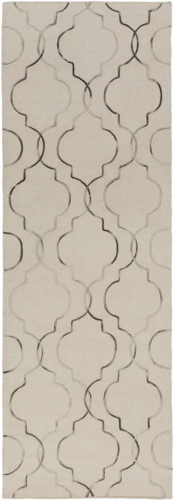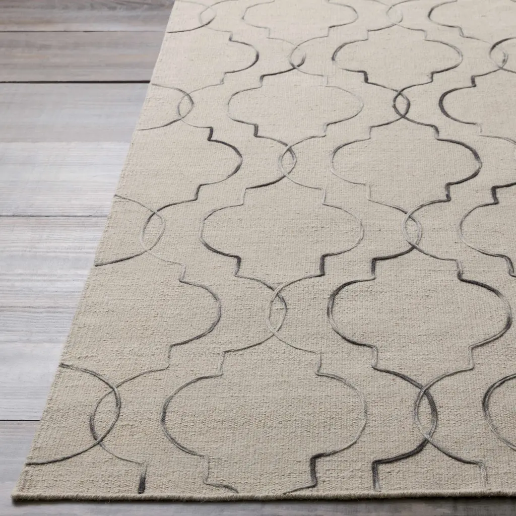 Collection: Wycombe Colors: Black, Light Gray, Taupe Construction: Hand Woven Material: Face: 100% Wool Pile: No Pile Styles: Transitional Made In: India Thickness: 0.2" Price Range: $$$$$ (Affordable)