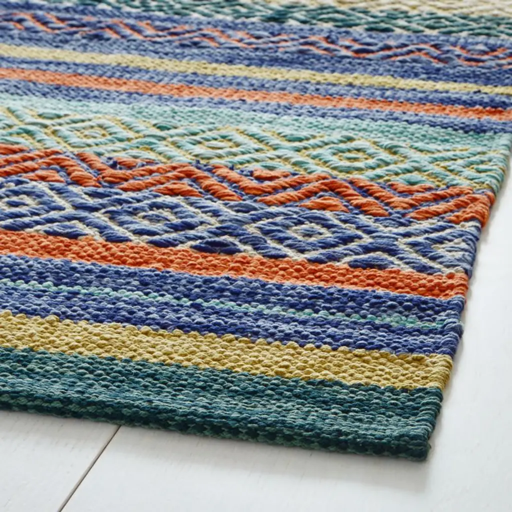 Reminiscent of mid-century textiles, this handcrafted rug integrates a graphic windowpane motif into stripes in blue and bright-colored stripes. The way the pattern seems to fade in and out is a testament to its skillful construction with artisan weavers spending almost as much time setting up the warp of this rug as they do weaving it. Hand-stitched hems create a neat edge for this reversible rug that brings color and texture underfoot in the kitchen, bath or utility room. Order rugs (up to 6'x9') online and pickup in a . It's fast, easy and free. For 8'x10' and larger rugs, order online and arrange a convenient warehouse pickup or delivery.