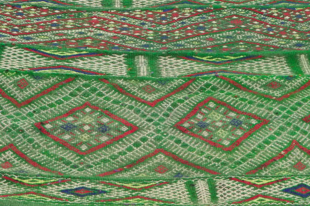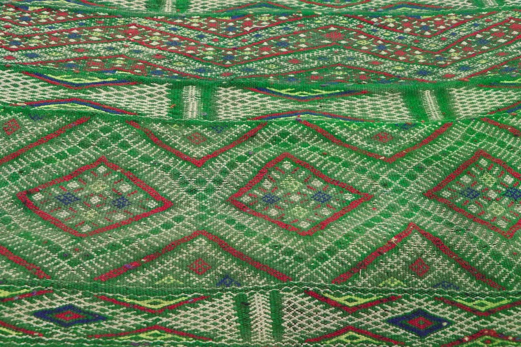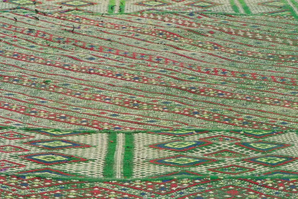 Full of tiny details and nomadic charm, this hand-woven wool vintage Zemmour Berber Moroccan kilim rug runner is a captivating vision of woven beauty. The abrashed field features an allover geometric pattern decorated with stripes and ambiguous tribal motifs. It is enclosed with a complementary tribal border giving it a sense of order and definition.